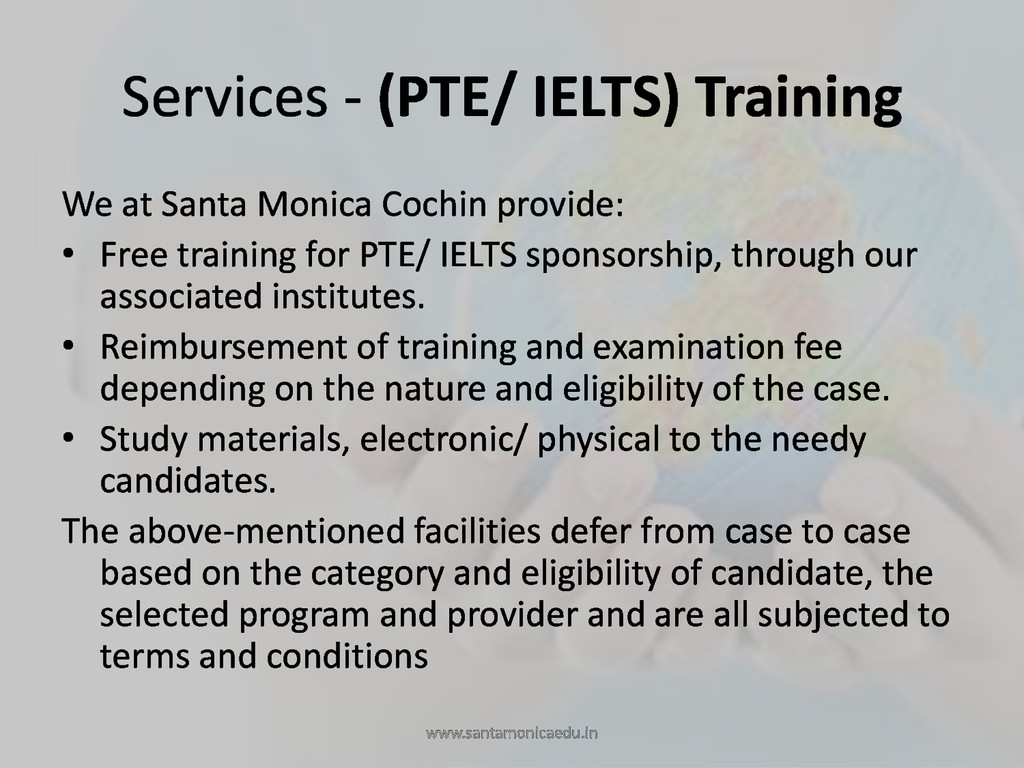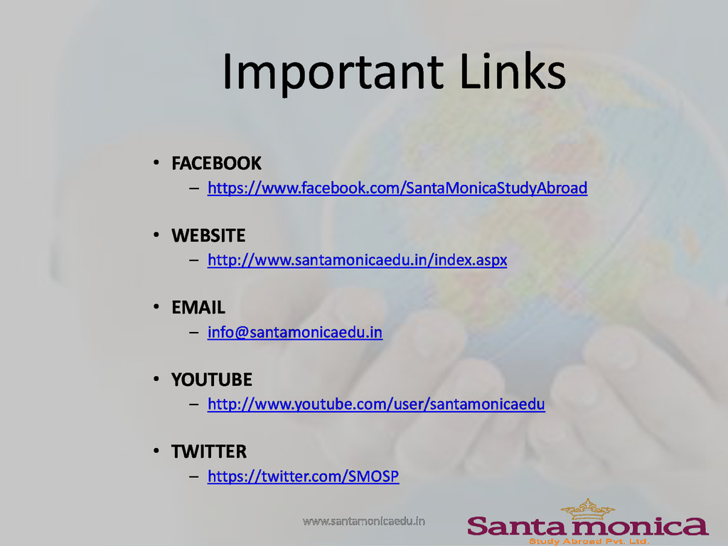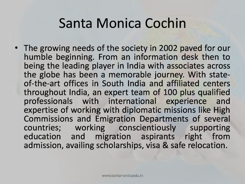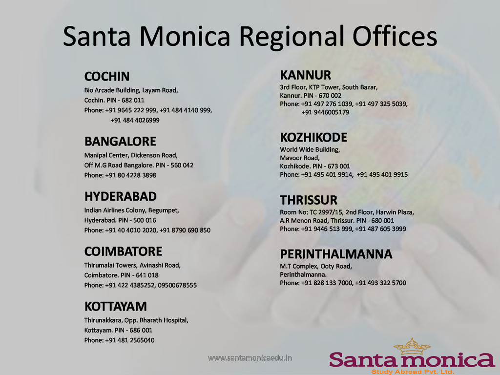 Cochin. PIN - 682 011 Phone: +91 9645 222 999, +91 484 4140 999, +91 484 4026999 BANGALORE Manipal Center, Dickenson Road, Off M.G Road Bangalore. PIN - 560 042 Phone: +91 80 4228 3898 HYDERABAD Indian Airlines Colony, Begumpet, Hyderabad. PIN - 500 016 Phone: +91 40 4010 2020, +91 8790 690 850 COIMBATORE Thirumalai Towers, Avinashi Road, Coimbatore. PIN - 641 018 Phone: +91 422 4385252, 09500678555 KOTTAYAM Thirunakkara, Opp. Bharath Hospital, Kottayam. PIN - 686 001 Phone: +91 481 2565040 KANNUR 3rd Floor, KTP Tower, South Bazar, Kannur. PIN - 670 002 Phone: +91 497 276 1039, +91 497 325 5039, +91 9446005179 KOZHIKODE World Wide Building, Mavoor Road, Kozhikode. PIN - 673 001 Phone: +91 495 401 9914, +91 495 401 9915 THRISSUR Room No: TC 2997/15, 2nd Floor, Harwin Plaza, A.R Menon Road, Thrissur. PIN - 680 001 Phone: +91 9446 513 999, +91 487 605 3999 PERINTHALMANNA M.T Complex, Ooty Road, Perinthalmanna. Phone: +91 828 133 7000, +91 493 322 5700 www.santamonicaedu.in