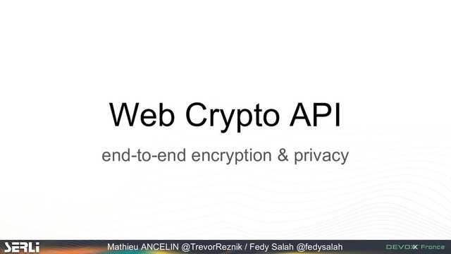 / Fedy Salah @fedysalah Lors de la création du compte • Initialisation ◦ hachage bcrypt du mot de passe ▪ passwordHash = bcrypt.hash(password, bcrypt.generateSalt(10)) ◦ génération d’un sel propre à l’utilisateur ▪ salt = bcrypt.generateSalt(10) ◦ génération d’un couple de clés (publique/privée) propre à l’utilisateur • Chiffrement de la clé privée et du sel ◦ chiffrement AES du sel avec le mot de passe de l’utilisateur ▪ encryptedSalt = aes.encrypt(salt, password) ◦ création d’un hash bcrypt du mot de passe avec le sel pour chiffrer (AES) la clé privée avec ▪ encryptedPrivateKey = aes.encrypt(privateKey, bcrypt.hash(password, salt)) • Stockage sur le serveur ◦ email, nom, clé publique, passwordHash, encryptedSalt, encryptedPrivateKey { "email": "