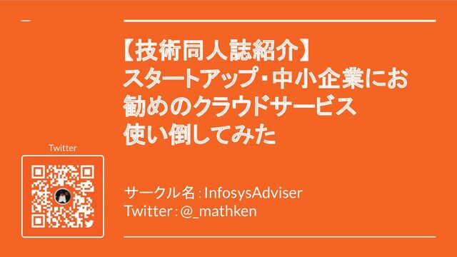 【技術同人誌紹介】 スタートアップ・中小企業にお 勧めのクラウドサービス 使い倒してみた サークル名:InfosysAdviser Twitter:@_mathken Twitter