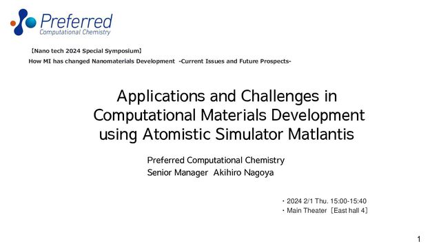 This is the presentation material for the lecture entitled "Applications and Challenges in Computational Materials Development using Atomistic Simulator Matlantis", delivered by Mr. Nagoya, Senior Manager of Preferred Computational Chemistry, at the nano tech 2024 Special Symposium on February 1, 2024.
