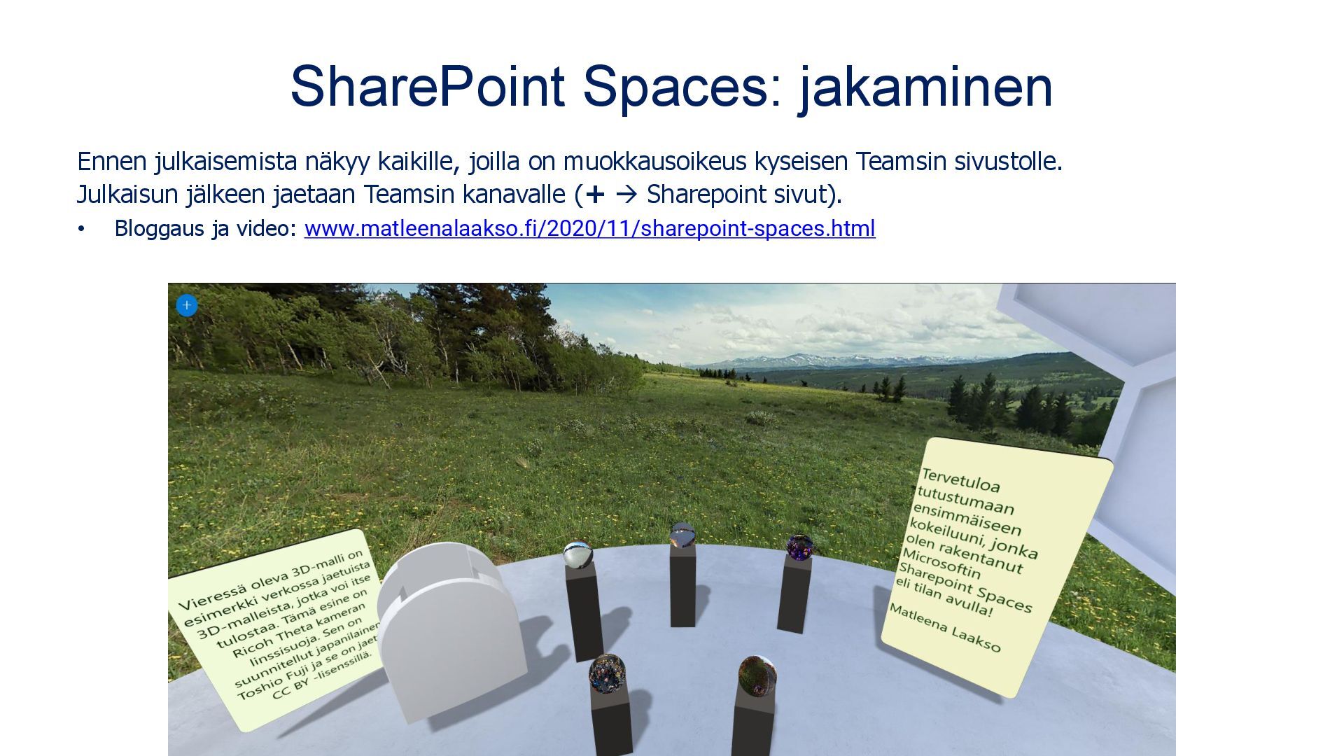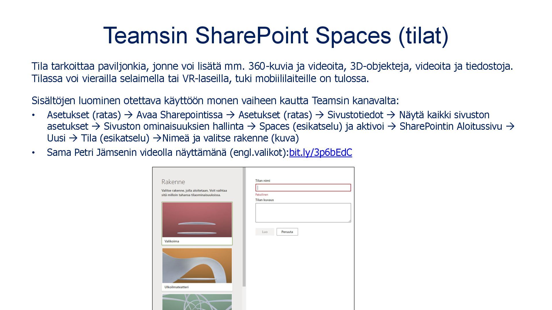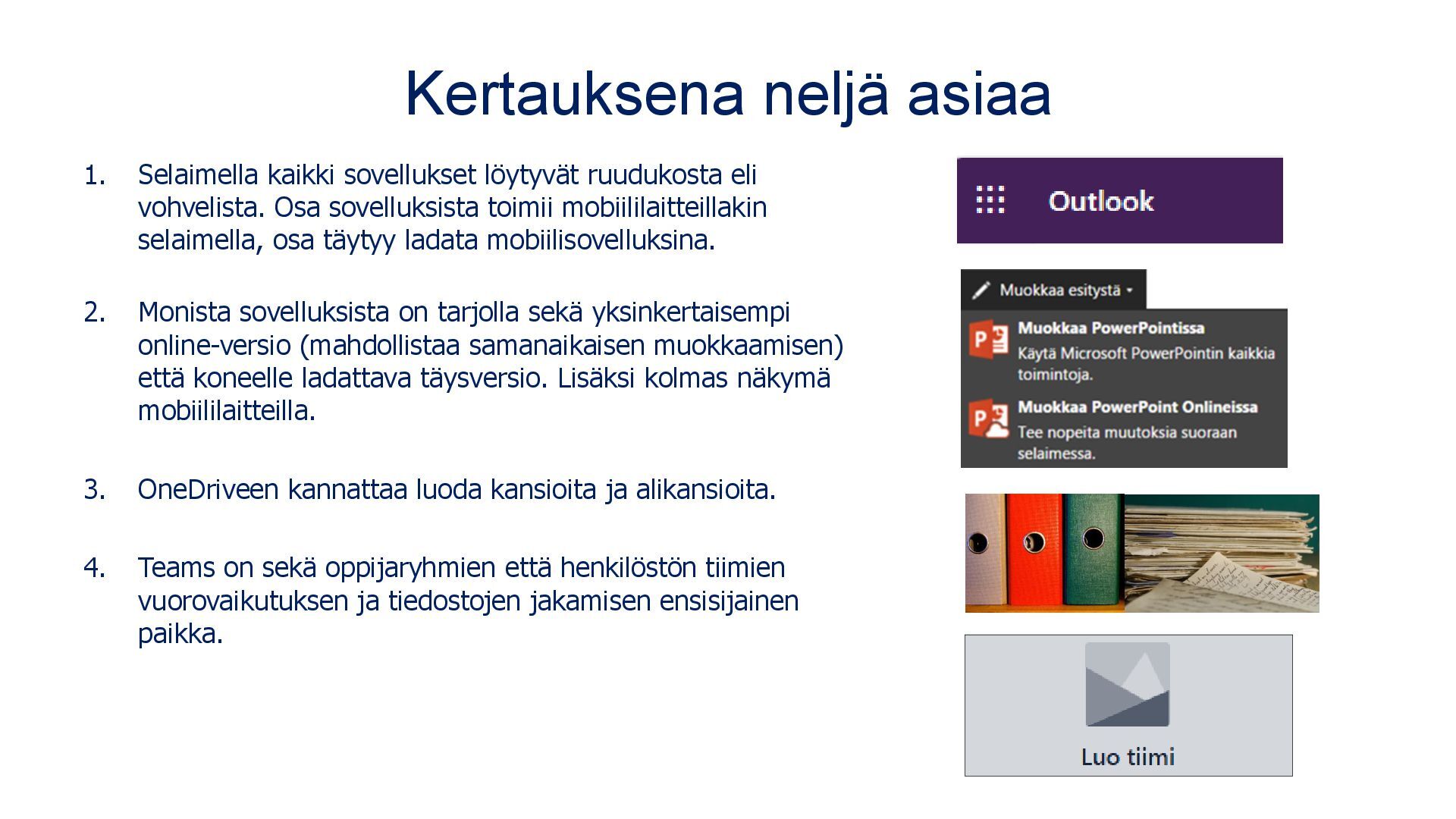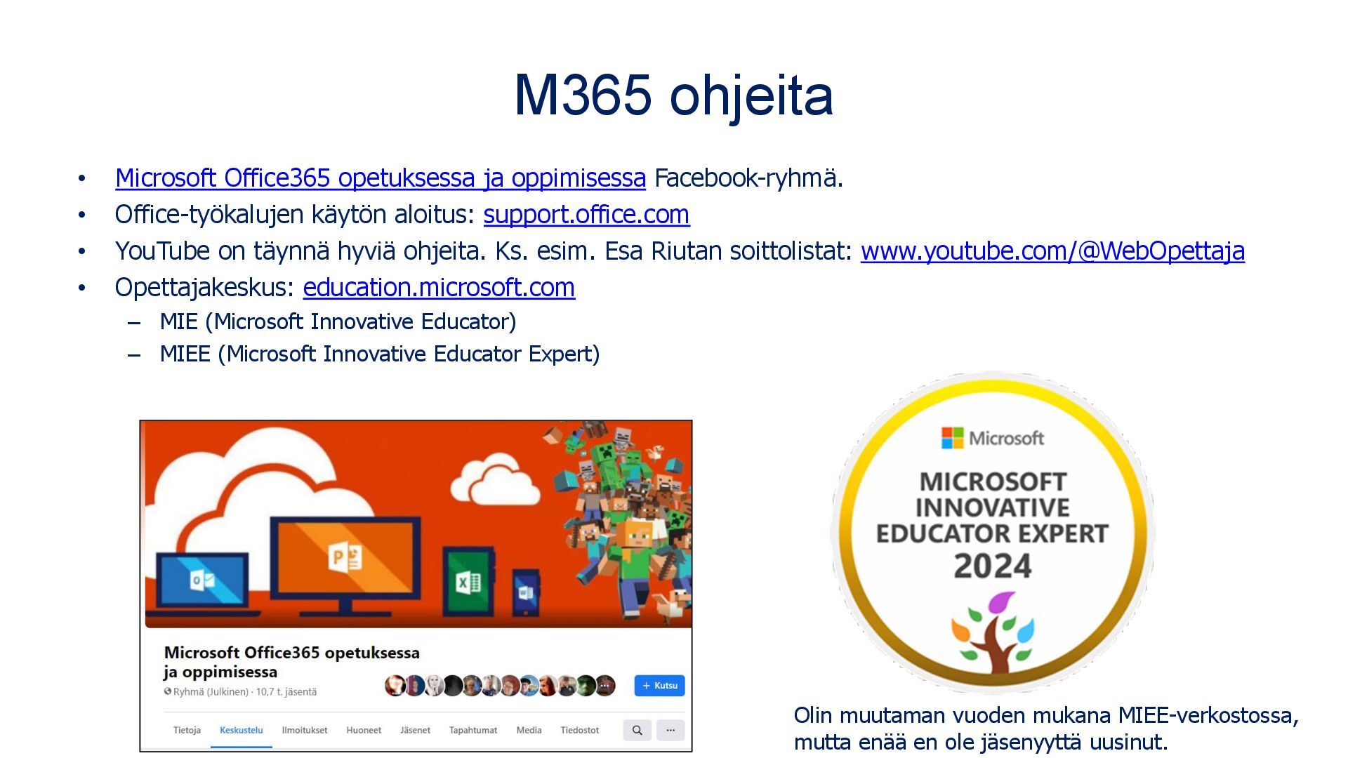 Microsoftin pilvipalvelun sovellusten esittelyä ensisijassa opettajien ja muunkin oppilaitoksen toiminnan näkökulmasta. Parhaiten pysyt ajantasalla jatkuvissa muutoksissa seuraamalla Facebook-ryhmää: https://www.facebook.com/groups/o365.opetuksessa.ja.oppimisessa