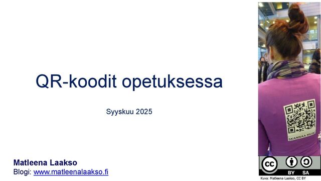 julisteisiin, käyntikortteihin, monisteisiin tai osoitetarrojen avulla kirjojen sivuille. QR-koodista voi avautua esim. linkki verkkosivulle, käyttöohjeisiin, ohjevideoon tai palautelomakkeelle. • Koodi voi olla staattinen, jolloin sen sisältö on aina sama, mutta toki nettiosoitteen sisältöä voi päivittää. • Koodi voi olla dynaaminen, jolloin voidaan muuttaa nettiosoitetta tai muuta sisältöä, mitä koodista avautuu. Tällaiset koodit ovat usein maksullisia. Kuva: Matleena Laakso, CC BY