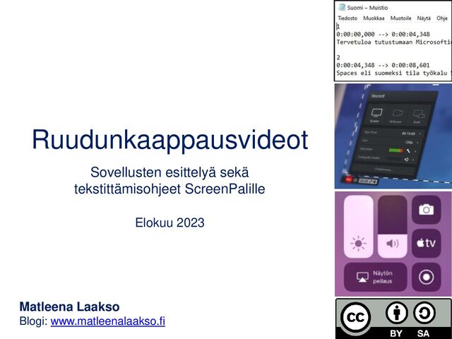 Esittely sovelluksista, joilla voi tehdä ruudunkaappausvideoita sekä ohjeet videon tekstittämiseen esim. puheesta ScreenPalilla (ent. Screencast-O-Matic). Lue lisää kohdasta tekstitys: https://www.matleenalaakso.fi/p/koulutusdiat.html