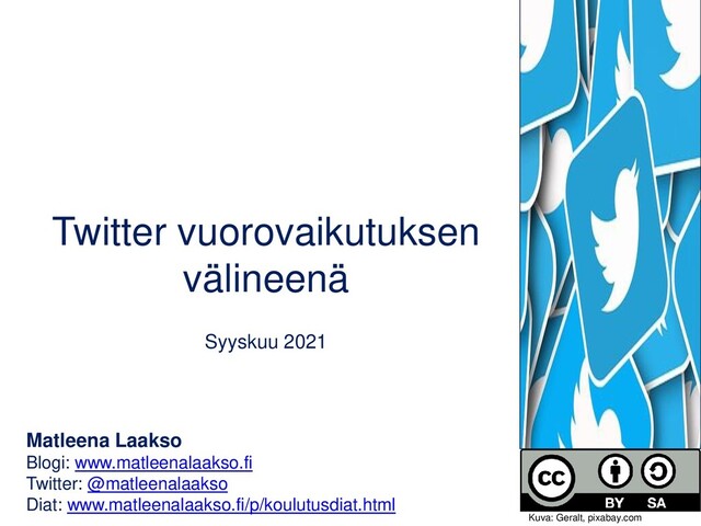 Twitter on maksuton yhteisöpalvelu, jossa viestitään 280 merkin pituisten viestien eli tviittien (engl. tweet) avulla. Viesteissä on usein kuvia tai linkkejä. Perusajatuksena on julkinen keskustelu, vaikka tilin suojaaminenkin on mahdollista. Diasarja esittelee Twitterin käyttämistä, ominaisuuksia ja mahdollisuuksia hyödyntää sitä esimerkiksi opetuksessa. Lokakuun 2019 blogijulkaisusta löydät koonnin uusista ominaisuuksista ja tallenteen: https://www.matleenalaakso.fi/2019/10/dikata-ja-twitter.html
