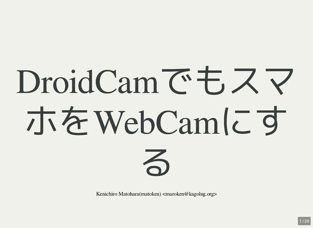 on 'port' for connections (video only) droidcam-cli [options] <ip> <port> Connect via ip droidcam-cli [options] adb <port> Connect via adb to Android device droidcam-cli [options] ios <port> Connect via usbmuxd to iDevice Options: -a Enable Audio -v Enable Video (only -v by default) -size=WxH Specify video size (when using the regular v4l2loopback module) E 640 480 1280 720 1920 1080 22 / 29