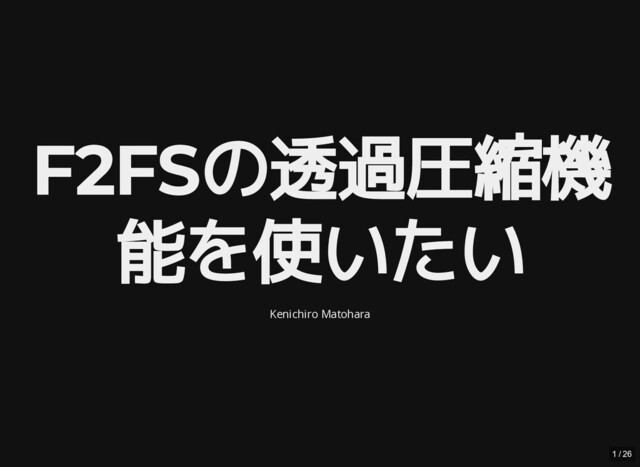 https://www.kernel.org/doc/Documentation/ lesystems/f2fs.txt To enable compression on regular inode, there are three ways: chattr +c file chattr +c dir; touch dir/file mount w/ -o compress_extension=ext; touch file.ext 24 / 26