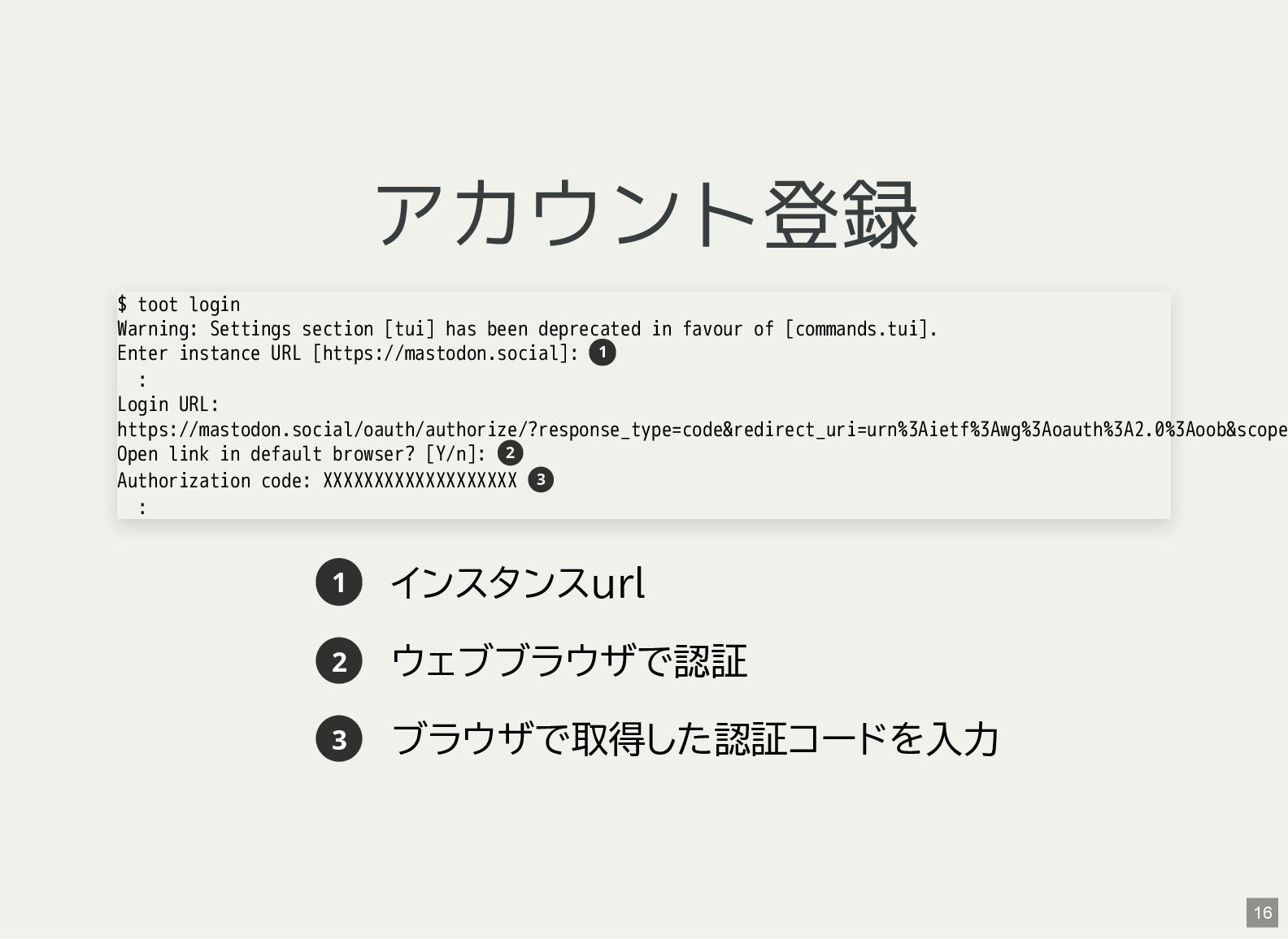 following List accounts followed by an account. instance Display instance details lists Show and manage your lists login Log into an instance using your browser (recommended) login_cli Log into an instance from the console (not recommended) logout Log out of ACCOUNT, delete stored access keys mute Mute an account muted List muted accounts notifications Show notifications pin Pin a status post Post a new status reblog Reblog (boost a status reblogged_by Show accounts that reblogged a status search Search for content in accounts, statuses and hashtags. status Show a single status tags List, follow, and unfollow tags thread Show thread for a toot. timeline Show timelines (deprecated, use `toot timelines` instead) timelines Show various timelines tui Launches the toot terminal user interface 14