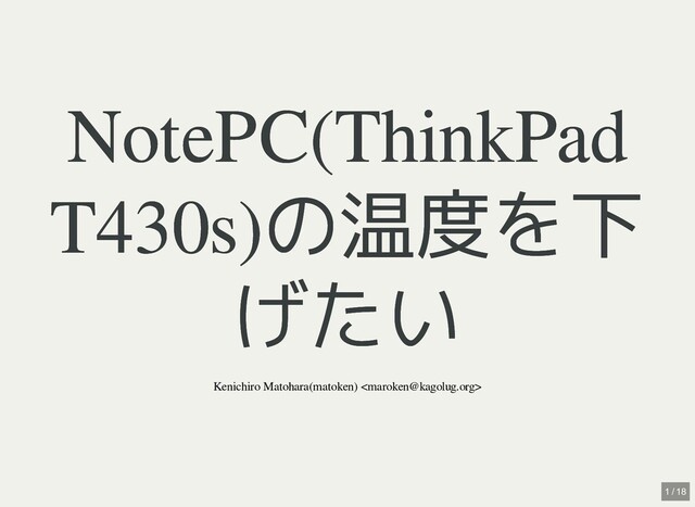 /sys/devices/platform/coretemp.0/hwmon/hwmon4 indices: [1, 2, 3] # adds 4 temperature sensors correction: [0, 0, 0] # add -5 °C to temp6_input - atasmart: /dev/sda # HDD等のデバイス(s.m.a.r.t.利用) - tpacpi: /proc/acpi/ibm/thermal # thinkpad温度センサ indices: [1, 2, 3, 4] fans: # コントロール対象のFAN - tpacpi: /proc/acpi/ibm/fan levels: # FANの制御 - [0, 0, 50] # 50℃までは level 0 - ["level auto", 45, 95] # 45〜95℃までは level auto - ["level full-speed", 90, 105] # 90〜105℃は level full-speed 10 / 18
