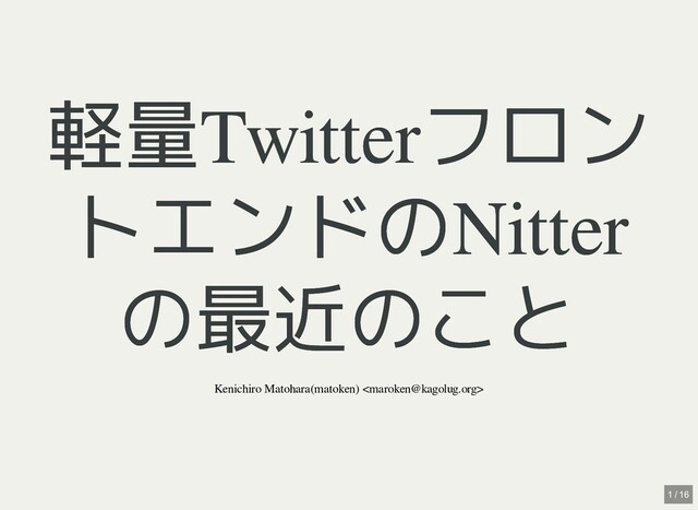 軽量Twitterフロン 軽量Twitterフロン トエンドのNitter トエンドのNitter の最近のこと の最近のこと Kenichiro Matohara(matoken) <