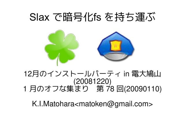 のTrueCrypt にはトラベラーディスクとい う実行ファイルを書き出す機能があります.Linux のTrueCrypt 実行ファイルも同じ場所にcopy してお くと便利です. – # cp -p /usr/bin/truecrypt /mnt/sda1/TrueCrypt/ – # ls /mnt/sda1/TrueCrypt/ TrueCrypt Format.exe TrueCrypt.exe truecrypt-x64.sys TrueCrypt-Mac.app truecrypt-linux truecrypt.sys • Linux の場合別途fuse ライブラリが必要な場合が あります.