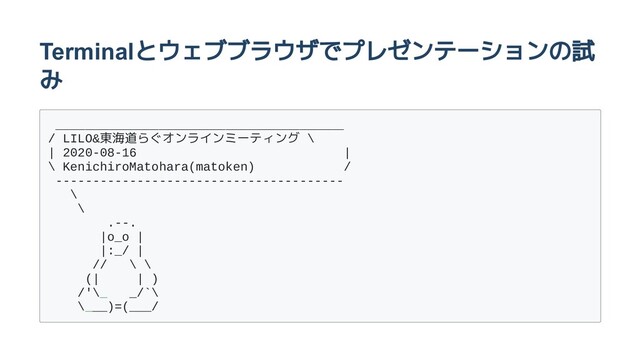 縦横のサイズが足りないと終了してしまう 端末サイズを広げるか,改ページしてページ分割したり, Error: Terminal height (19 lines) too small. Need at least 21 lines for slide #30. You may need to add additional horizontal rules (---) to split your file in shorter slides. 改行をして回避 Error: Terminal width (64 columns) too small. Need at least 75 columns. You may need to shorten some lines by inserting line breaks. コメントアウトの方法がわからない? <!--- コメント --->[](コメント)