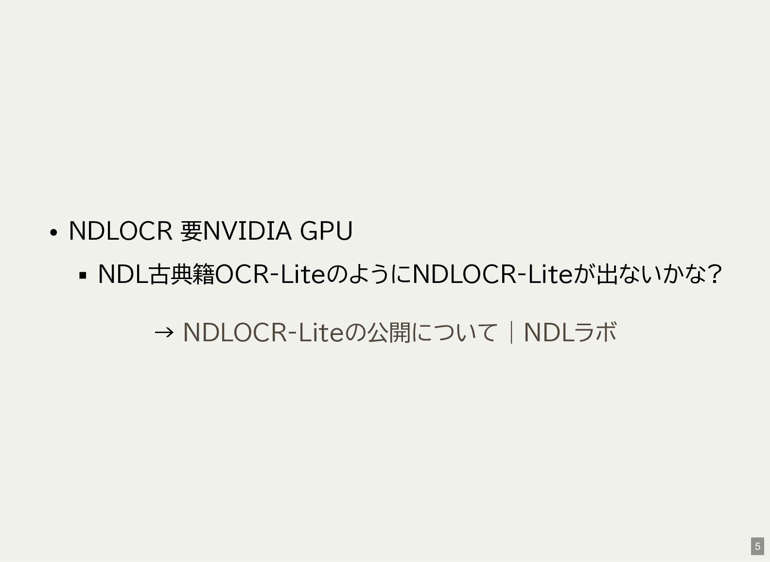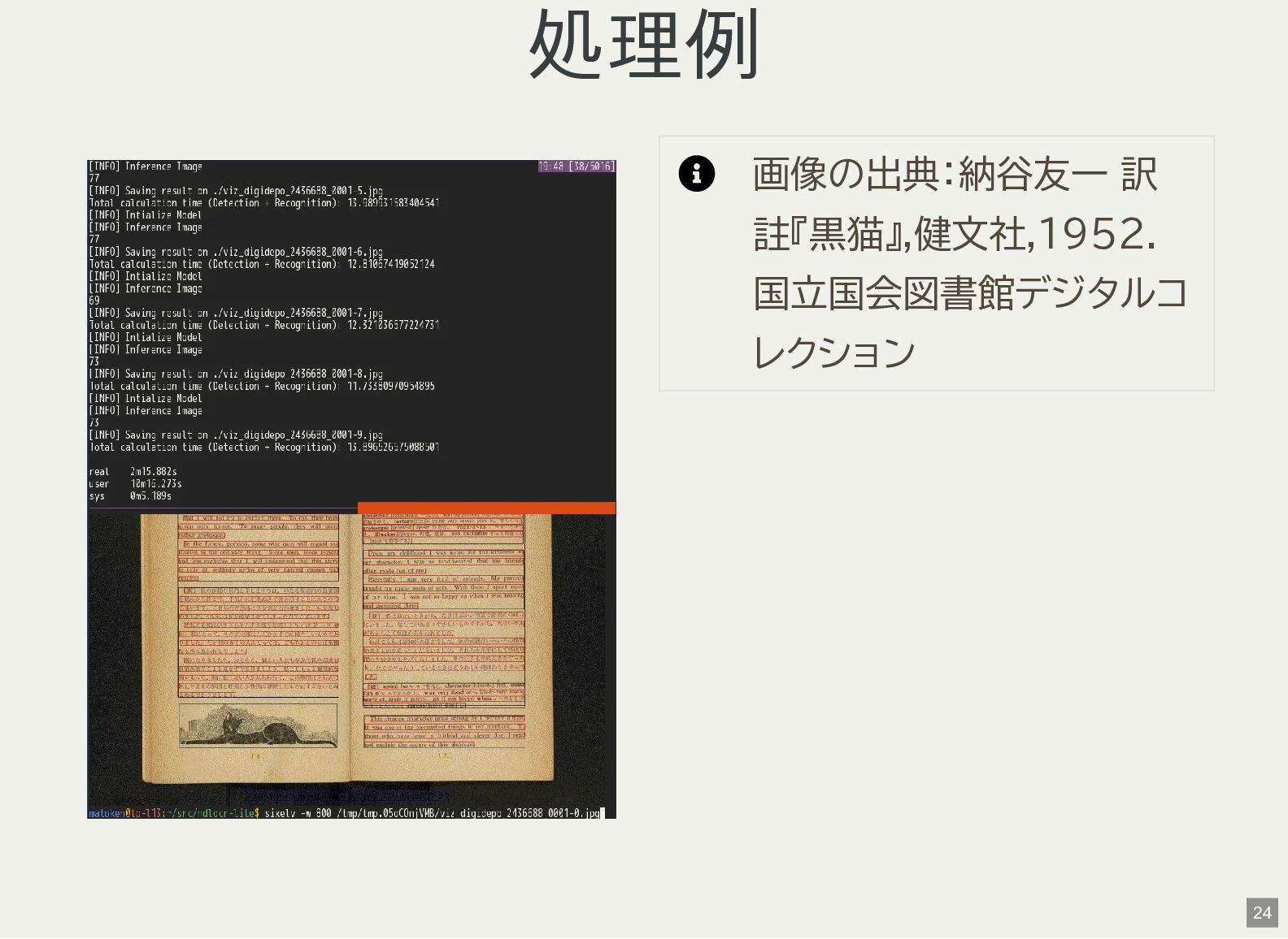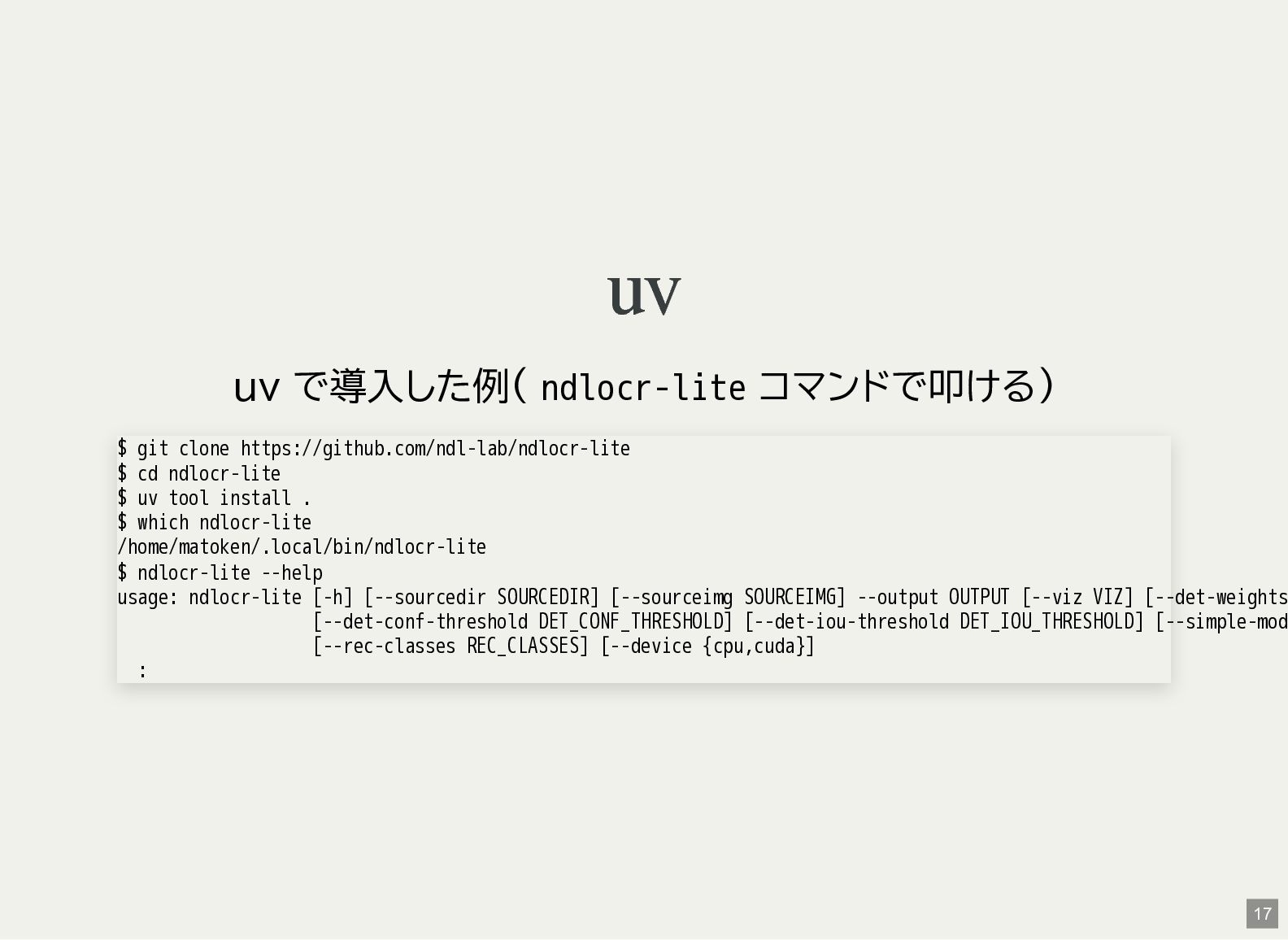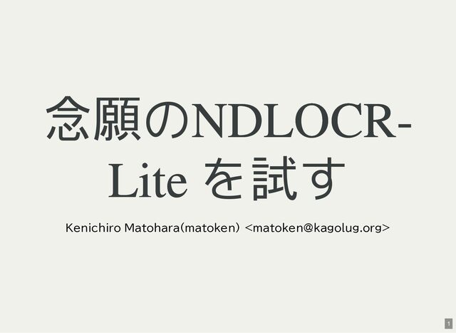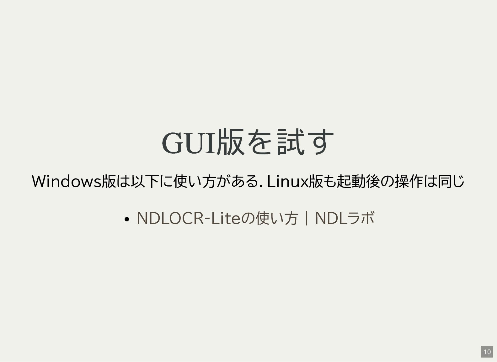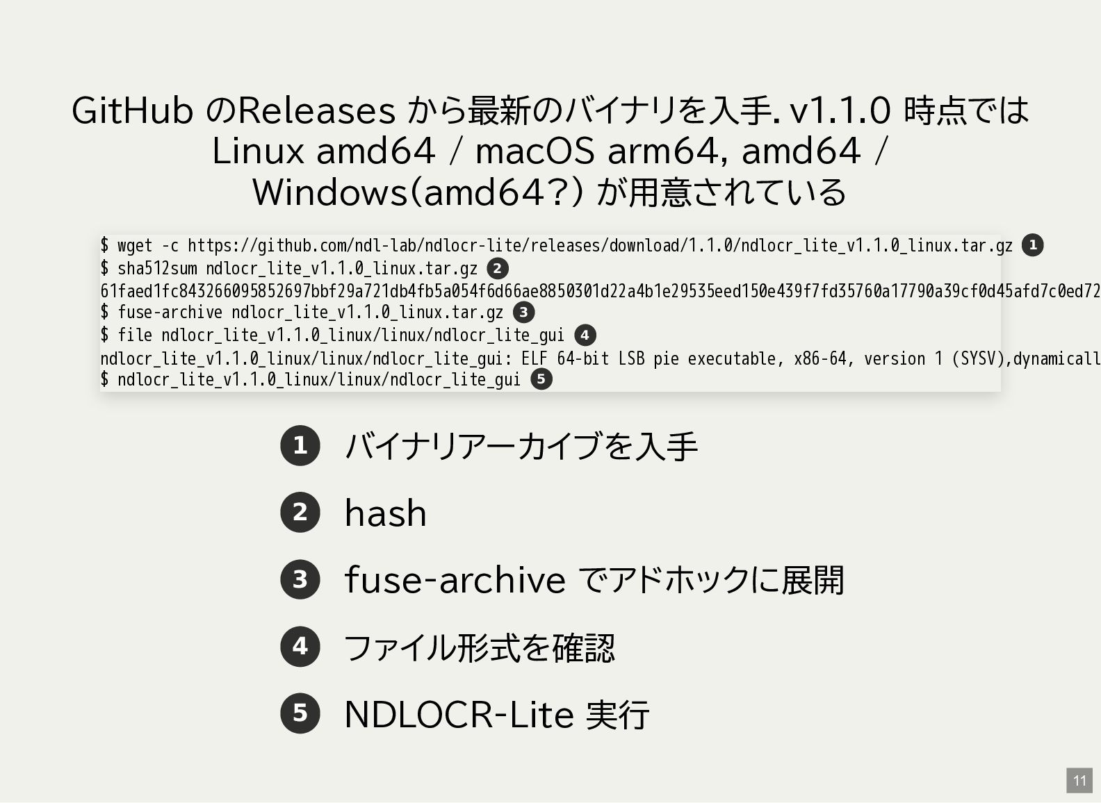 / Windows(amd64?) が用意されている 1 バイナリアーカイブを入手 2 hash 3 fuse-archive でアドホックに展開 4 ファイル形式を確認 5 NDLOCR-Lite 実行 $ wget -c https://github.com/ndl-lab/ndlocr-lite/releases/download/1.1.0/ndlocr_lite_v1.1.0_linux.tar.gz $ sha512sum ndlocr_lite_v1.1.0_linux.tar.gz 61faed1fc843266095852697bbf29a721db4fb5a054f6d66ae8850301d22a4b1e29535eed150e439f7fd35760a17790a39cf0d45afd7c0ed72 $ fuse-archive ndlocr_lite_v1.1.0_linux.tar.gz $ file ndlocr_lite_v1.1.0_linux/linux/ndlocr_lite_gui ndlocr_lite_v1.1.0_linux/linux/ndlocr_lite_gui: ELF 64-bit LSB pie executable, x86-64, version 1 (SYSV),dynamicall $ ndlocr_lite_v1.1.0_linux/linux/ndlocr_lite_gui 1 2 3 4 5 11