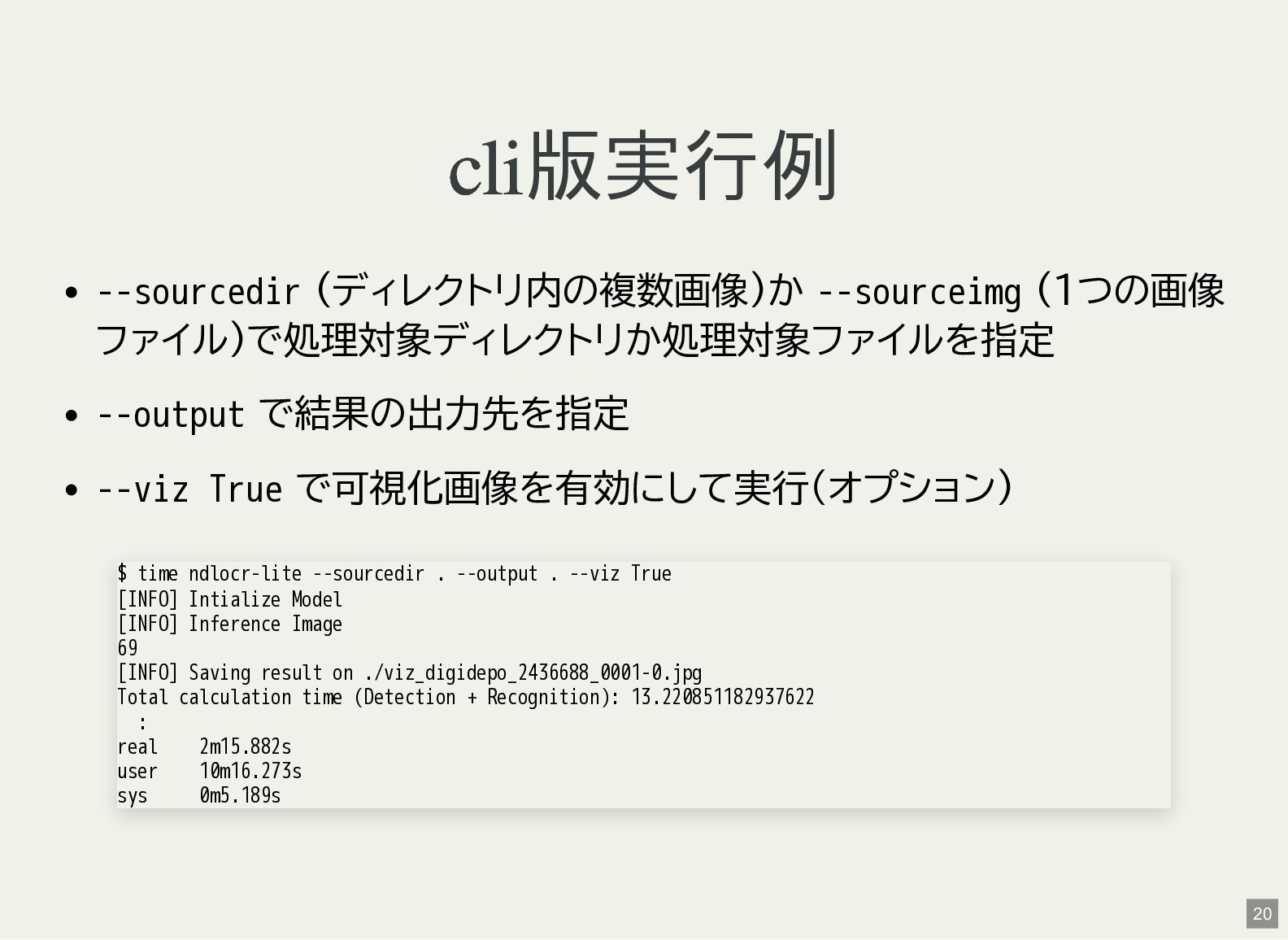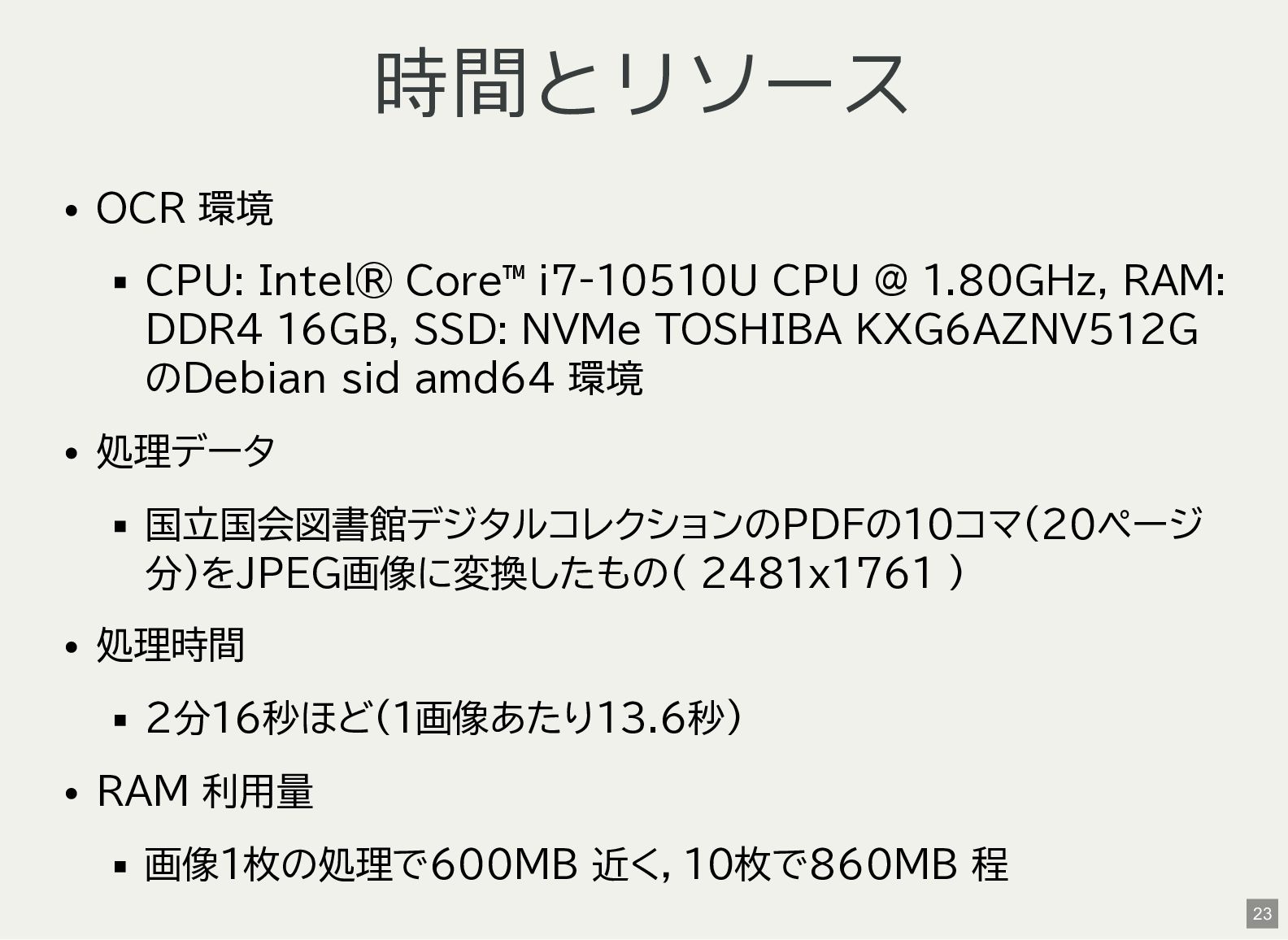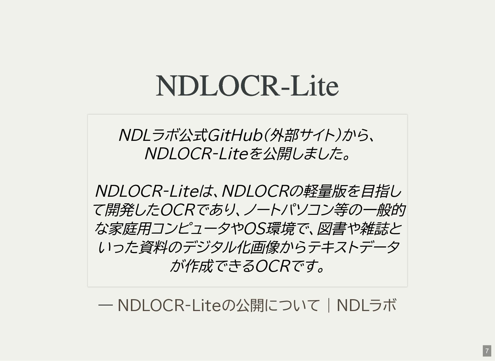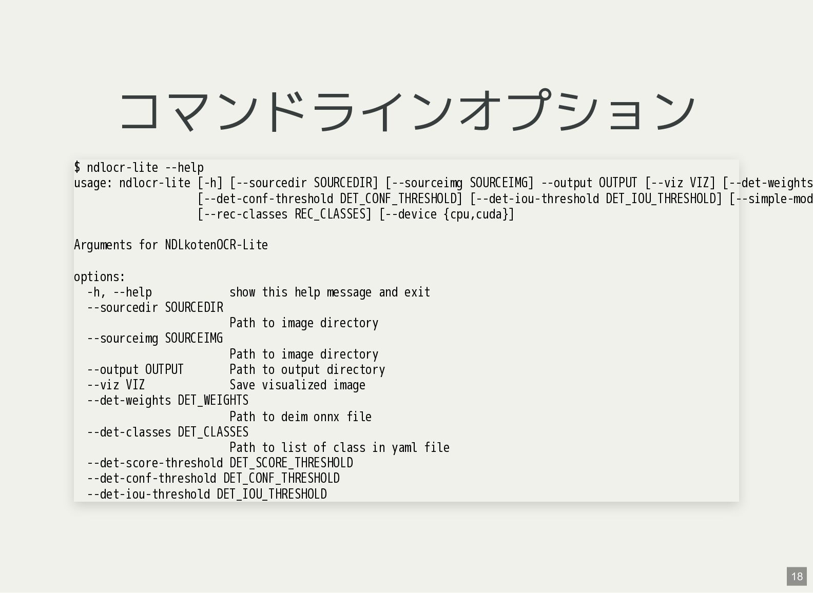 / Windows(amd64?) が用意されている 1 バイナリアーカイブを入手 2 hash 3 fuse-archive でアドホックに展開 4 ファイル形式を確認 5 NDLOCR-Lite 実行 $ wget -c https://github.com/ndl-lab/ndlocr-lite/releases/download/1.1.0/ndlocr_lite_v1.1.0_linux.tar.gz $ sha512sum ndlocr_lite_v1.1.0_linux.tar.gz 61faed1fc843266095852697bbf29a721db4fb5a054f6d66ae8850301d22a4b1e29535eed150e439f7fd35760a17790a39cf0d45afd7c0ed72 $ fuse-archive ndlocr_lite_v1.1.0_linux.tar.gz $ file ndlocr_lite_v1.1.0_linux/linux/ndlocr_lite_gui ndlocr_lite_v1.1.0_linux/linux/ndlocr_lite_gui: ELF 64-bit LSB pie executable, x86-64, version 1 (SYSV),dynamicall $ ndlocr_lite_v1.1.0_linux/linux/ndlocr_lite_gui 1 2 3 4 5 11