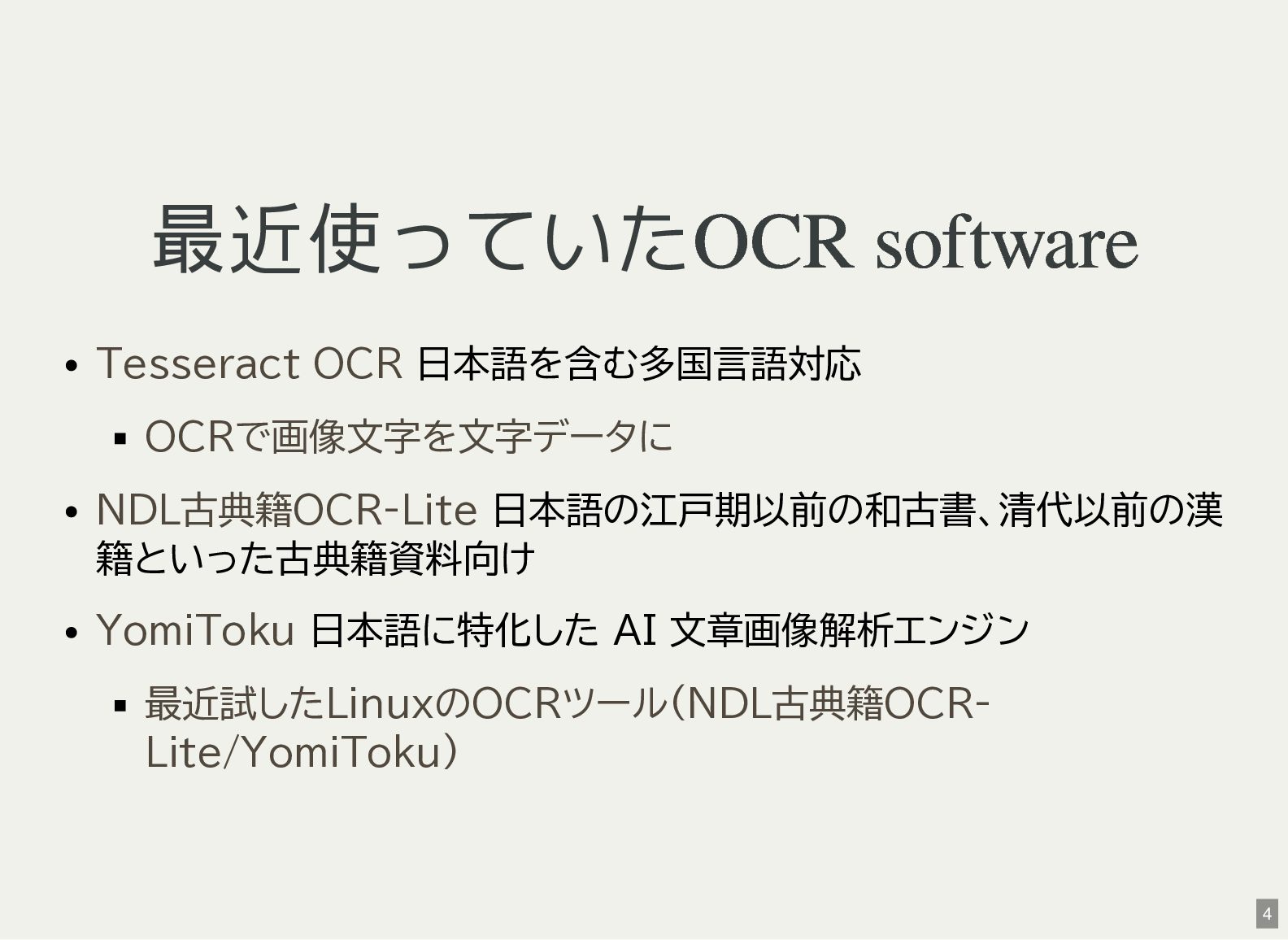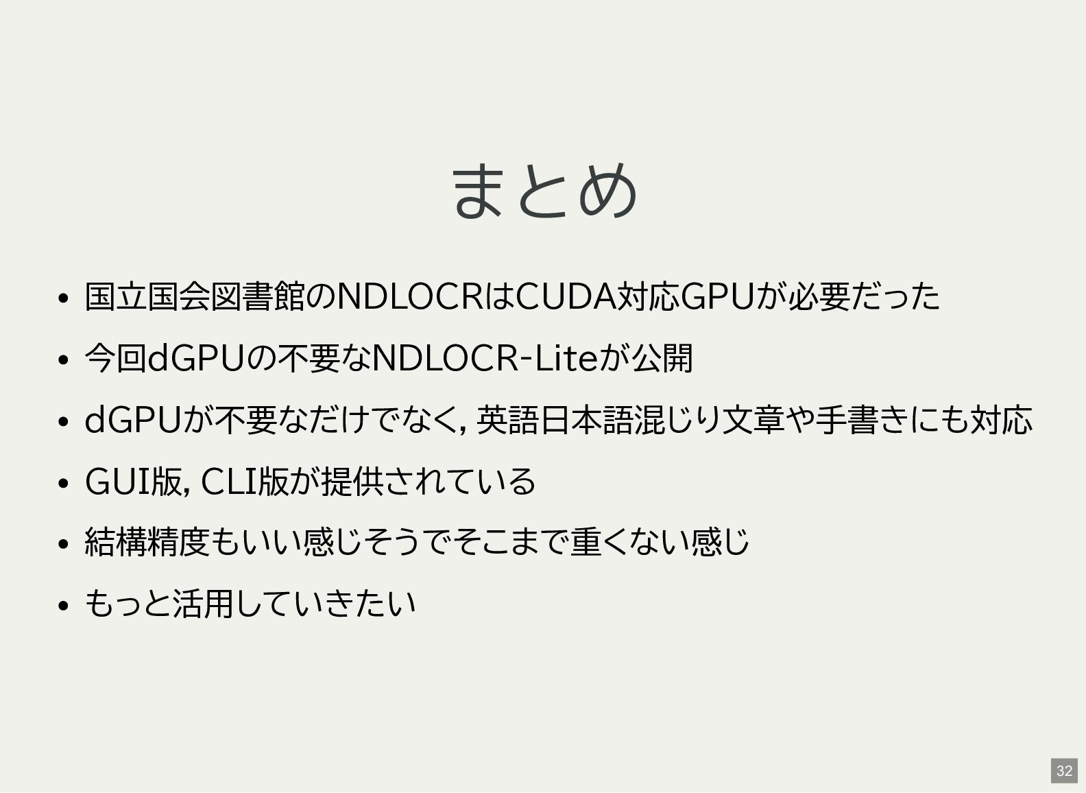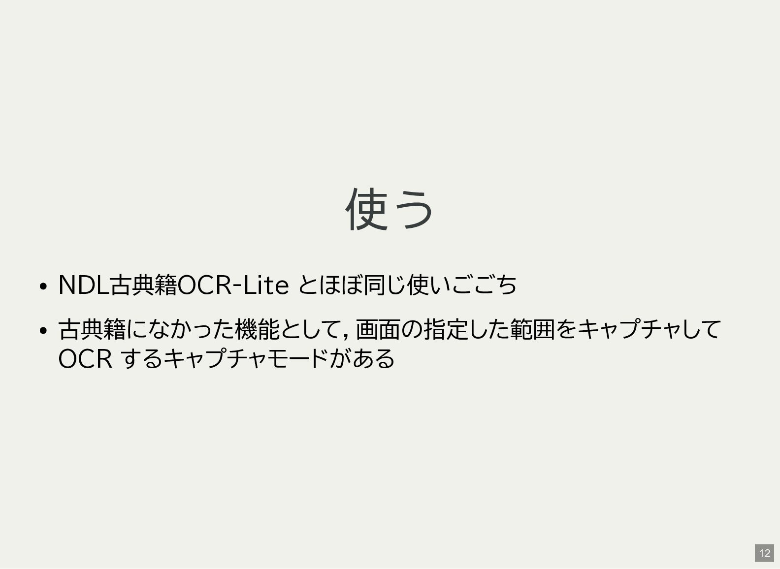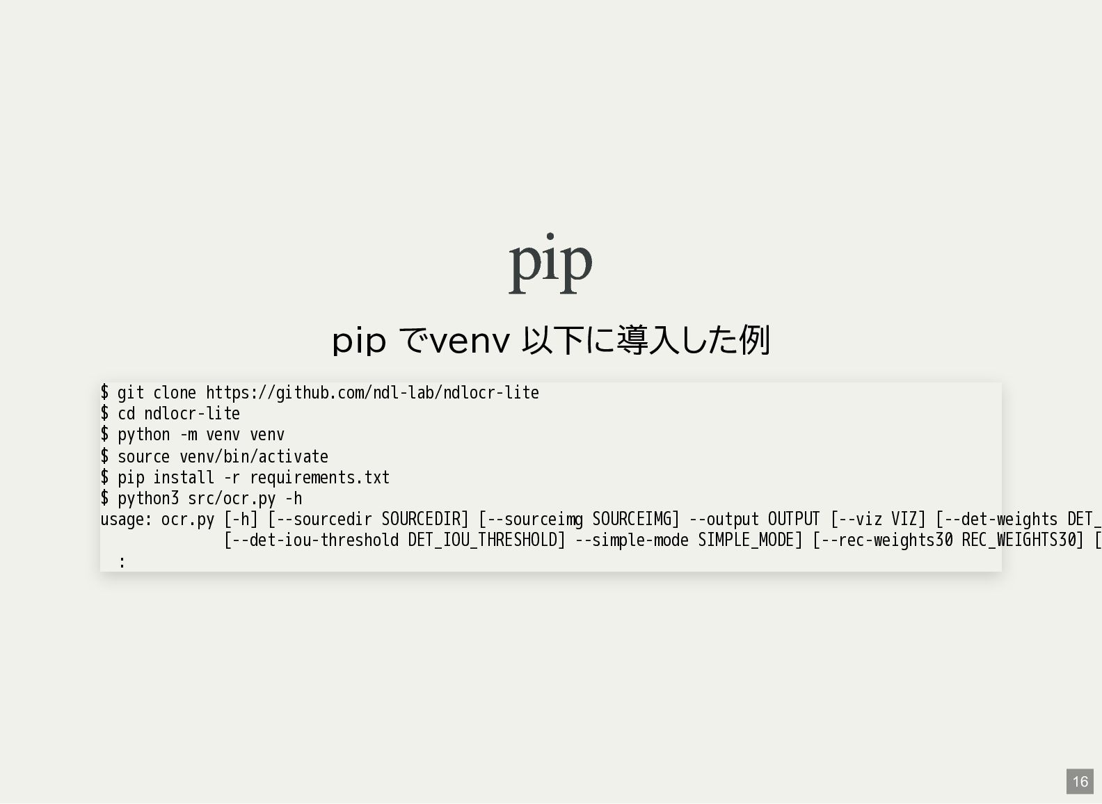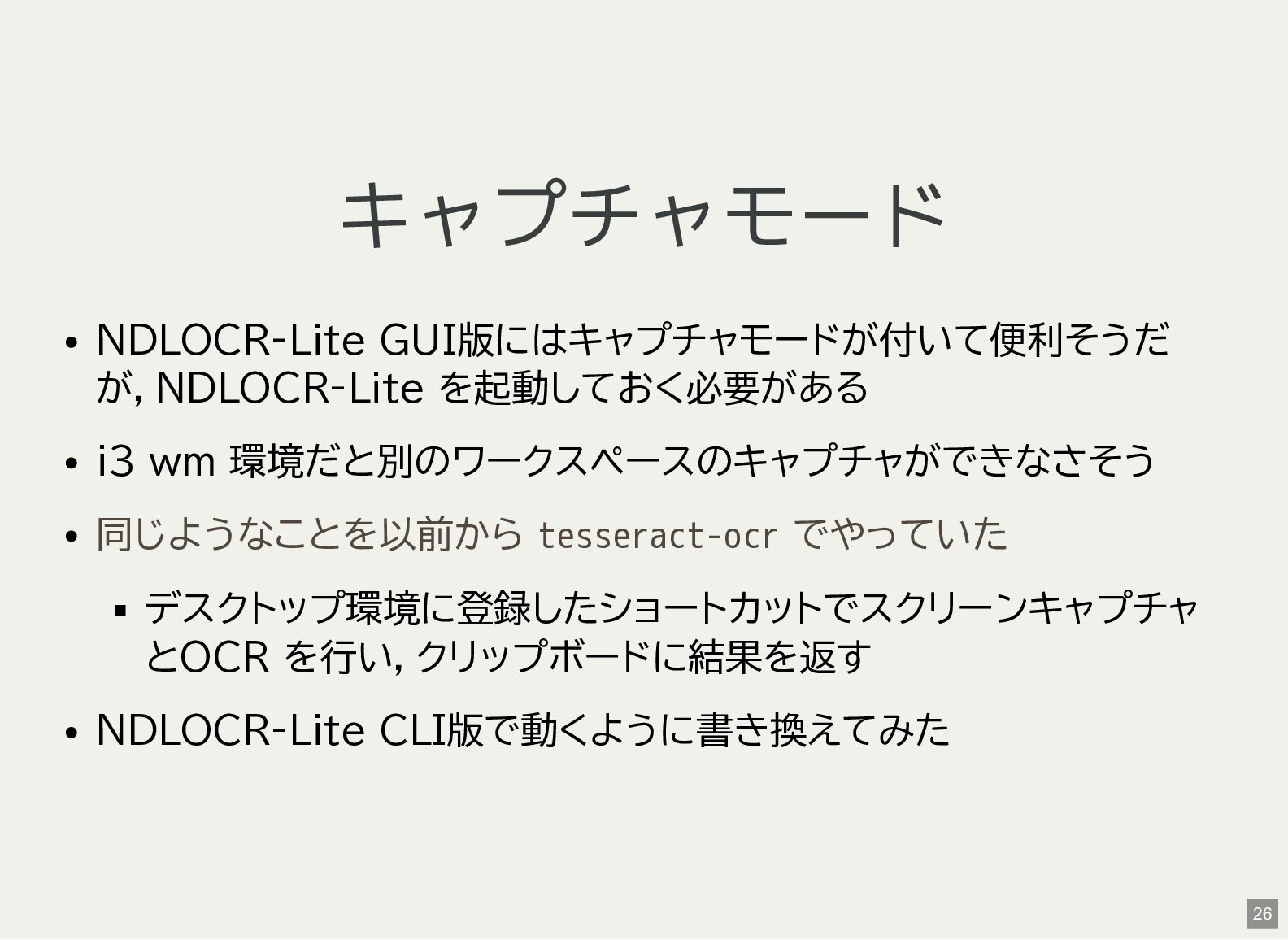 / Windows(amd64?) が用意されている 1 バイナリアーカイブを入手 2 hash 3 fuse-archive でアドホックに展開 4 ファイル形式を確認 5 NDLOCR-Lite 実行 $ wget -c https://github.com/ndl-lab/ndlocr-lite/releases/download/1.1.0/ndlocr_lite_v1.1.0_linux.tar.gz $ sha512sum ndlocr_lite_v1.1.0_linux.tar.gz 61faed1fc843266095852697bbf29a721db4fb5a054f6d66ae8850301d22a4b1e29535eed150e439f7fd35760a17790a39cf0d45afd7c0ed72 $ fuse-archive ndlocr_lite_v1.1.0_linux.tar.gz $ file ndlocr_lite_v1.1.0_linux/linux/ndlocr_lite_gui ndlocr_lite_v1.1.0_linux/linux/ndlocr_lite_gui: ELF 64-bit LSB pie executable, x86-64, version 1 (SYSV),dynamicall $ ndlocr_lite_v1.1.0_linux/linux/ndlocr_lite_gui 1 2 3 4 5 11