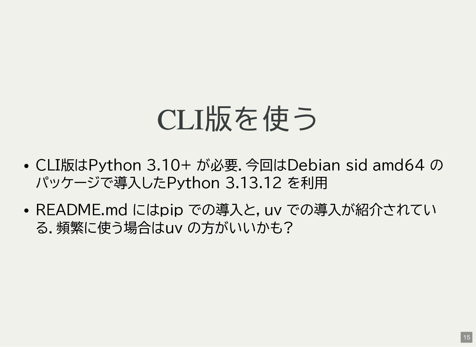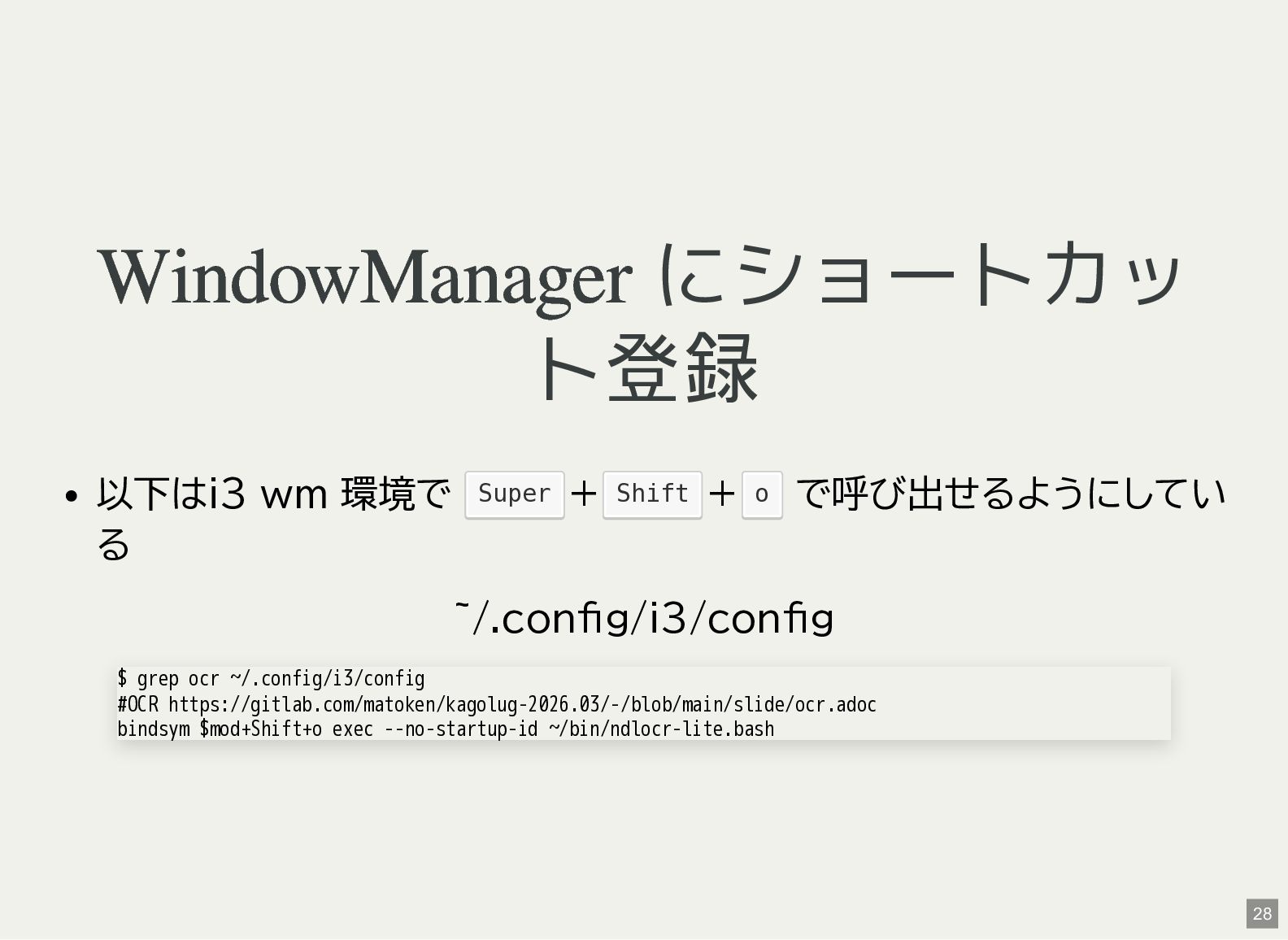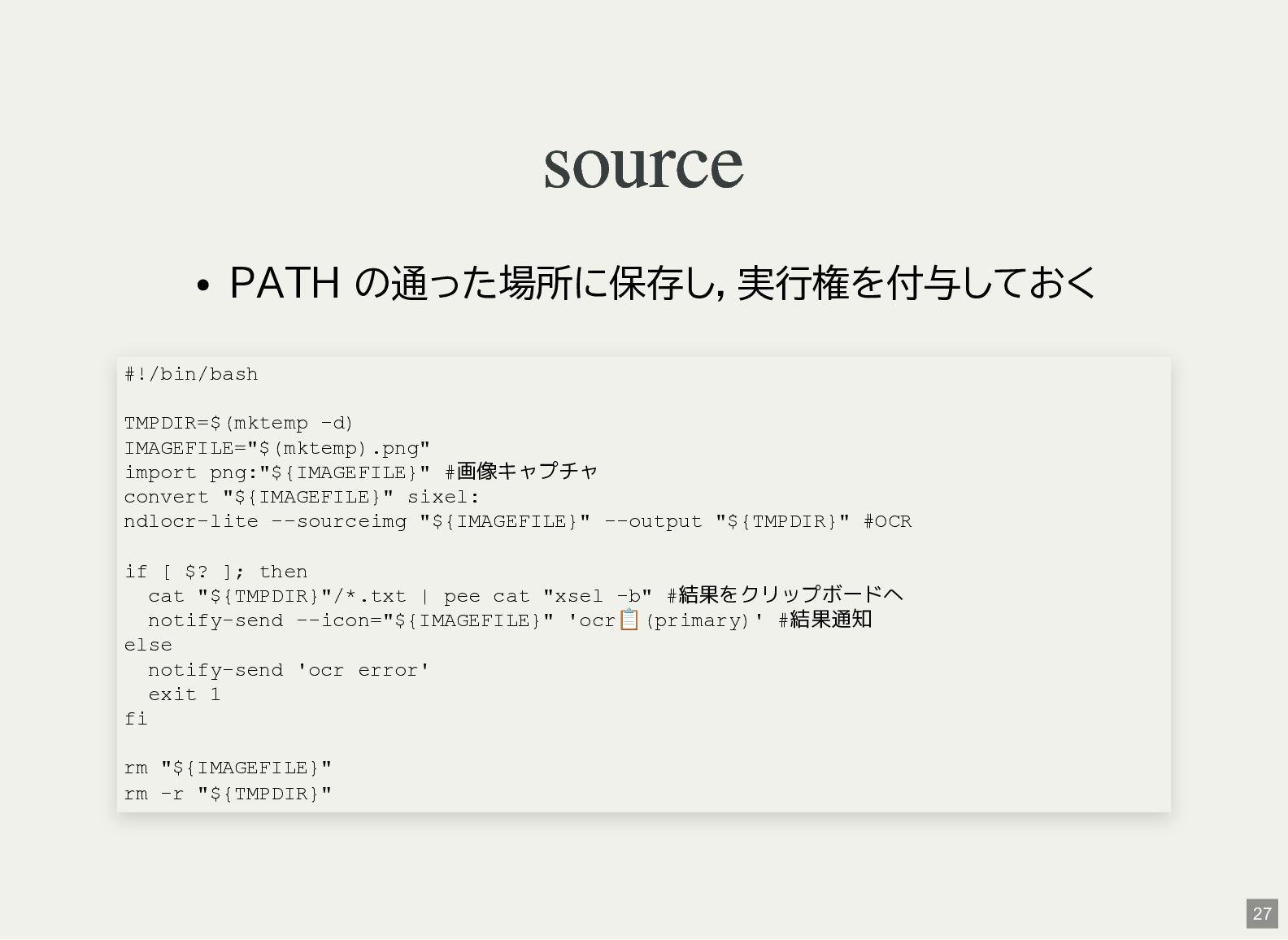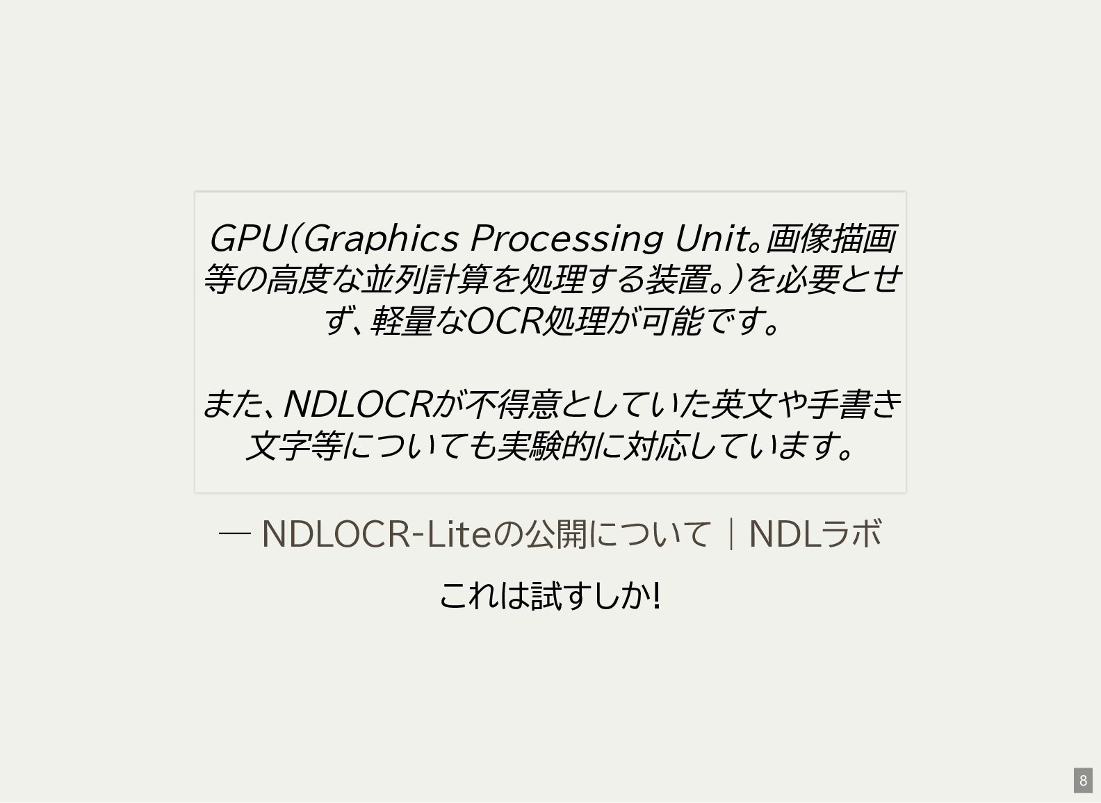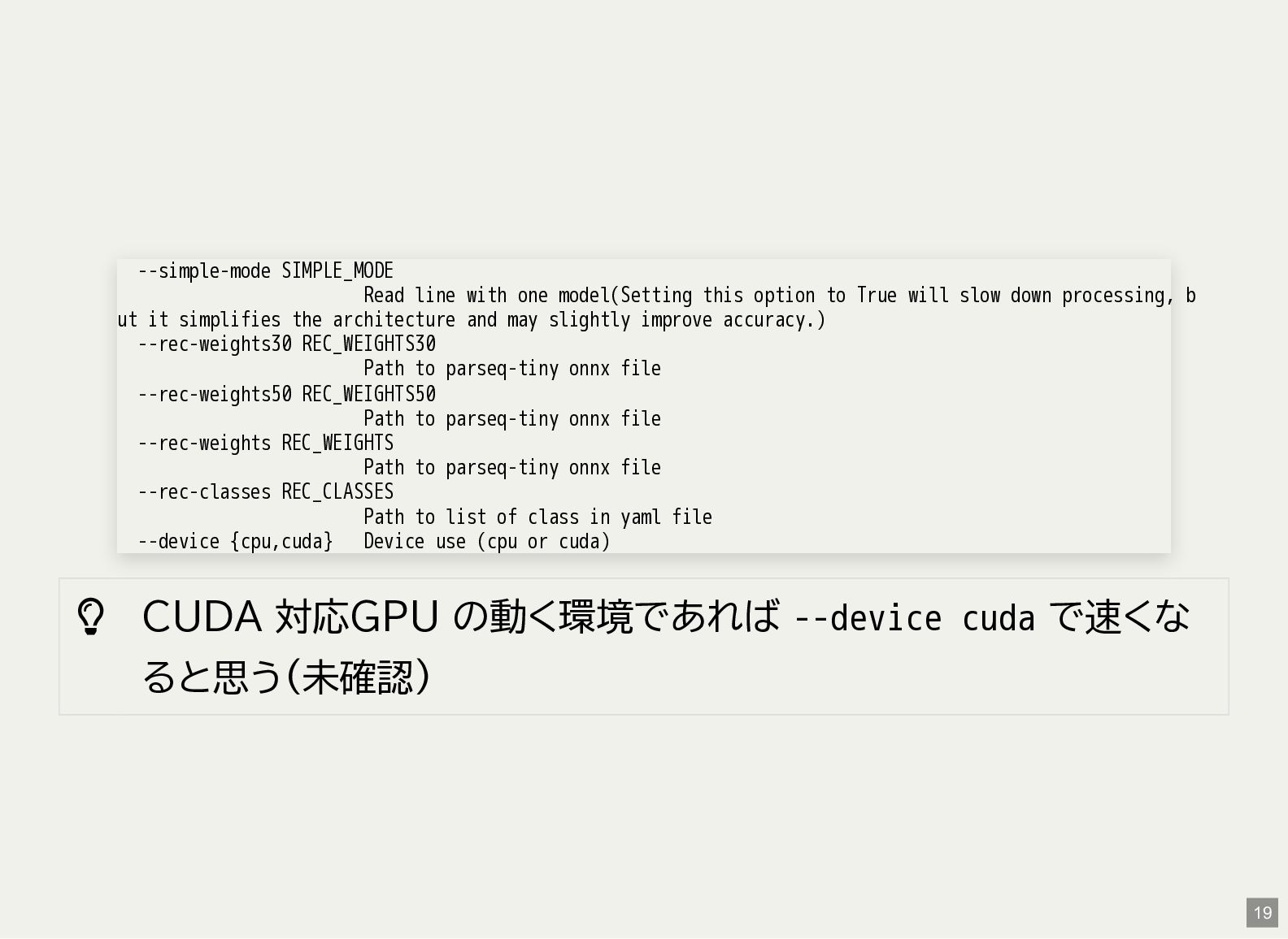 / Windows(amd64?) が用意されている 1 バイナリアーカイブを入手 2 hash 3 fuse-archive でアドホックに展開 4 ファイル形式を確認 5 NDLOCR-Lite 実行 $ wget -c https://github.com/ndl-lab/ndlocr-lite/releases/download/1.1.0/ndlocr_lite_v1.1.0_linux.tar.gz $ sha512sum ndlocr_lite_v1.1.0_linux.tar.gz 61faed1fc843266095852697bbf29a721db4fb5a054f6d66ae8850301d22a4b1e29535eed150e439f7fd35760a17790a39cf0d45afd7c0ed72 $ fuse-archive ndlocr_lite_v1.1.0_linux.tar.gz $ file ndlocr_lite_v1.1.0_linux/linux/ndlocr_lite_gui ndlocr_lite_v1.1.0_linux/linux/ndlocr_lite_gui: ELF 64-bit LSB pie executable, x86-64, version 1 (SYSV),dynamicall $ ndlocr_lite_v1.1.0_linux/linux/ndlocr_lite_gui 1 2 3 4 5 11