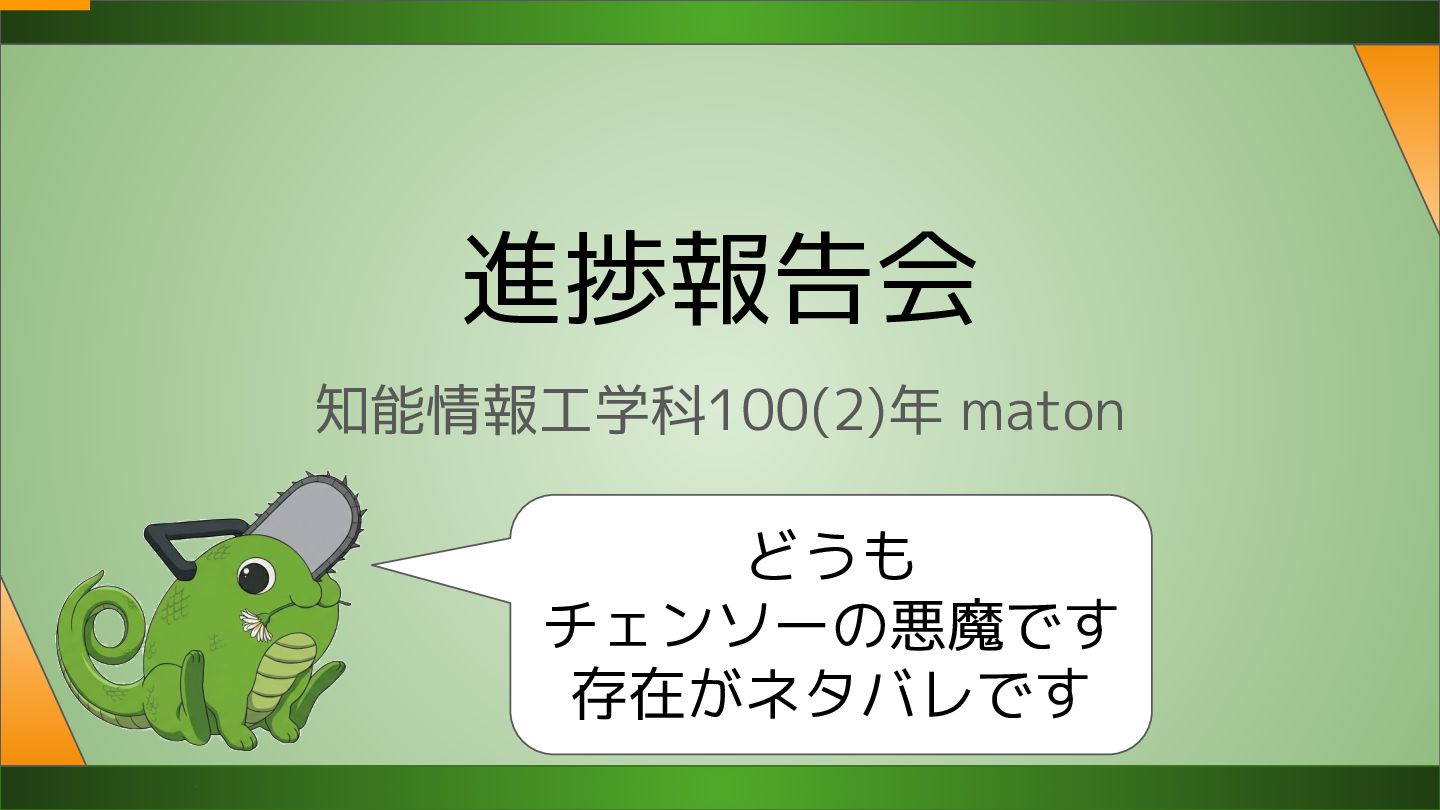 進捗報告会 知能情報工学科100(2)年 maton どうも チェンソーの悪魔です 存在がネタバレです