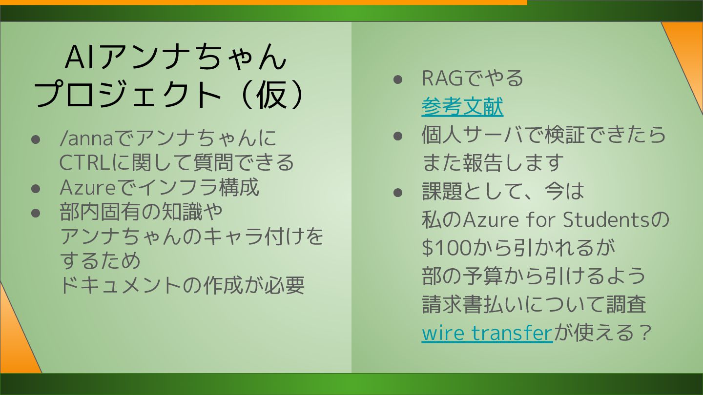 AIアンナちゃん プロジェクト(仮) • /annaでアンナちゃんに CTRLに関して質問できる • Azureでインフラ構成 • 部内固有の知識や アンナちゃんのキャラ付けを