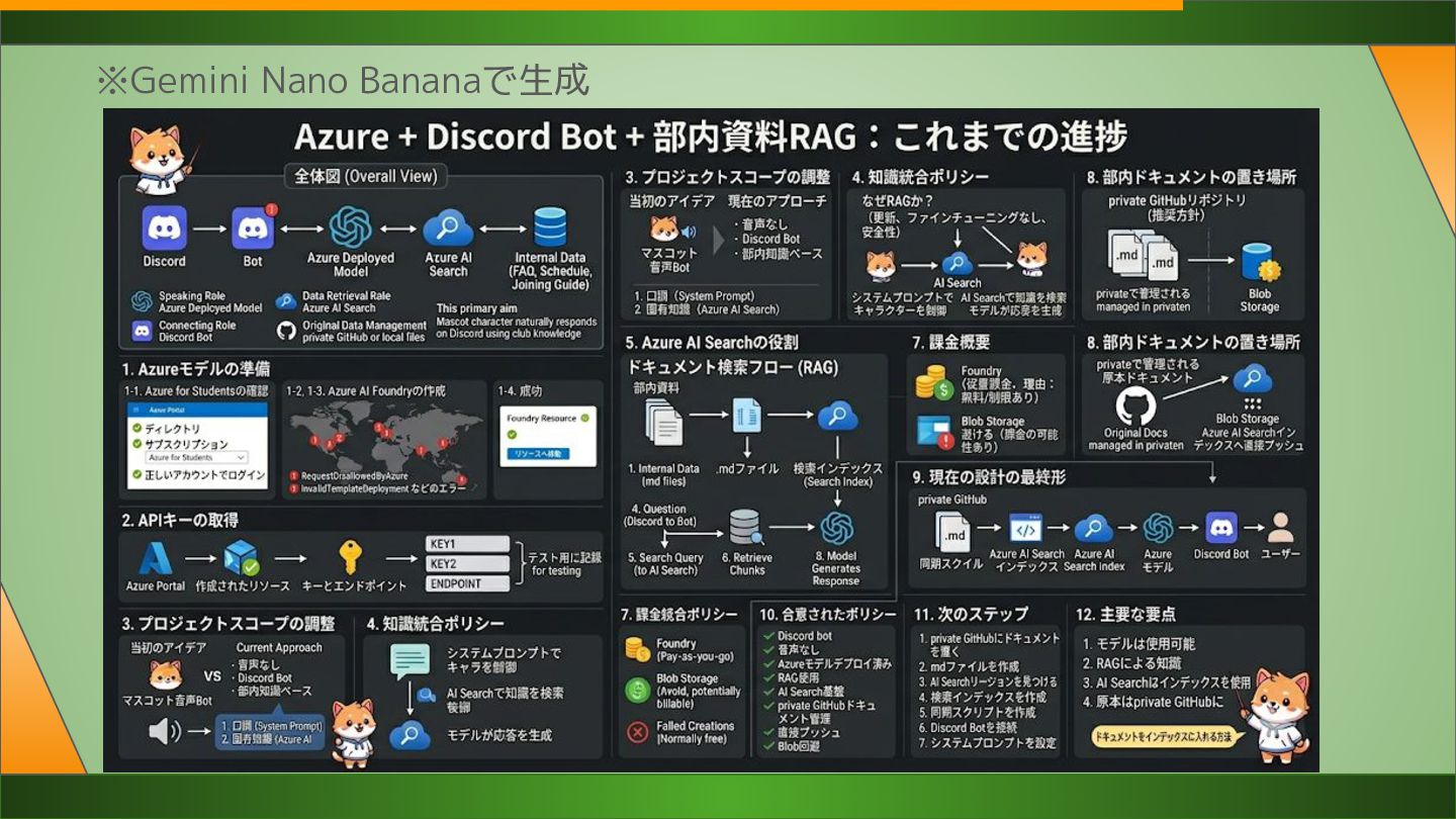 するため ドキュメントの作成が必要 • RAGでやる 参考文献 • 個人サーバで検証できたら また報告します • 課題として、今は 私のAzure for Studentsの $100から引かれるが 部の予算から引けるよう 請求書払いについて調査 wire transferが使える?
