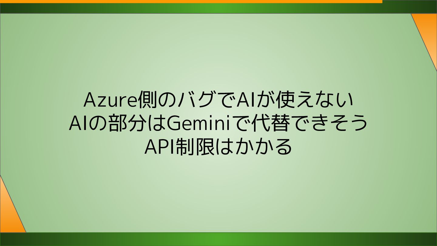 Azure側のバグでAIが使えない AIの部分はGeminiで代替できそう API制限はかかる