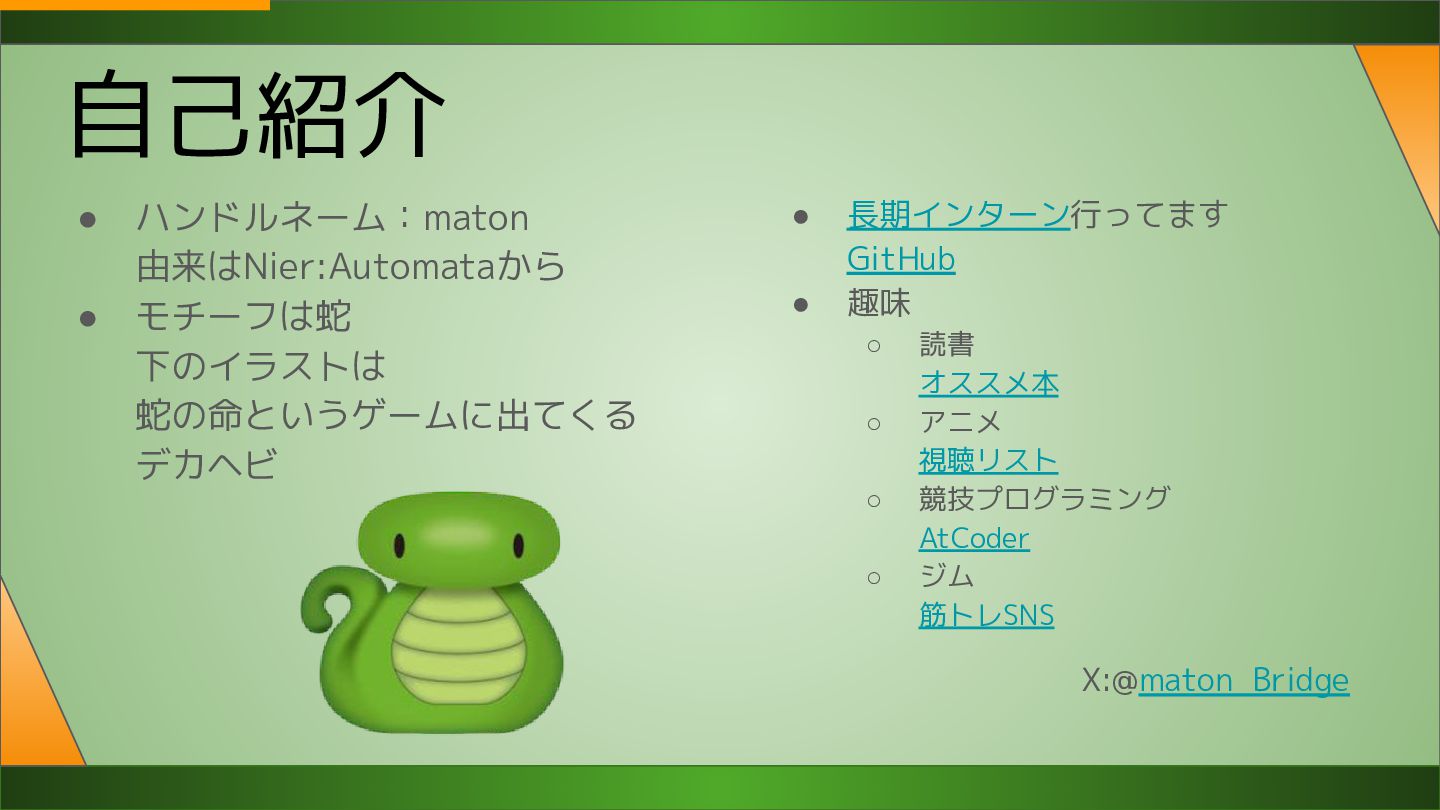 長期インターン行ってます GitHub • 趣味 ◦ 読書 オススメ本 ◦ アニメ 視聴リスト ◦ 競技プログラミング AtCoder ◦ ジム 筋トレSNS X:@maton_Bridge