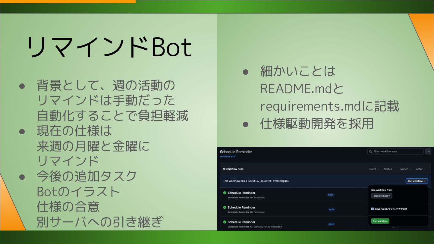リマインドBot • 背景として、週の活動の リマインドは手動だった 自動化することで負担軽減 • 現在の仕様は 来週の月曜と金曜に リマインド •