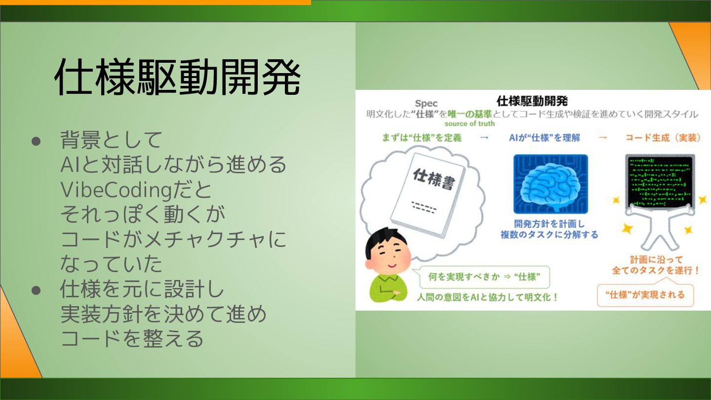 仕様駆動開発 • 背景として AIと対話しながら進める VibeCodingだと それっぽく動くが コードがメチャクチャに なっていた • 仕様を元に設計し