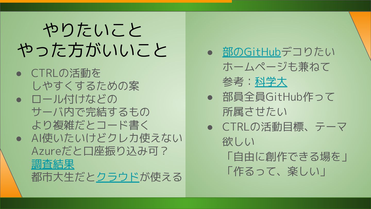 AI使いたいけどクレカ使えない Azureだと口座振り込み可? 調査結果 都市大生だとクラウドが使える • 部のGitHubデコりたい ホームページも兼ねて 参考:科学大 • 部員全員GitHub作って 所属させたい • CTRLの活動目標、テーマ 欲しい 「自由に創作できる場を」 「作るって、楽しい」