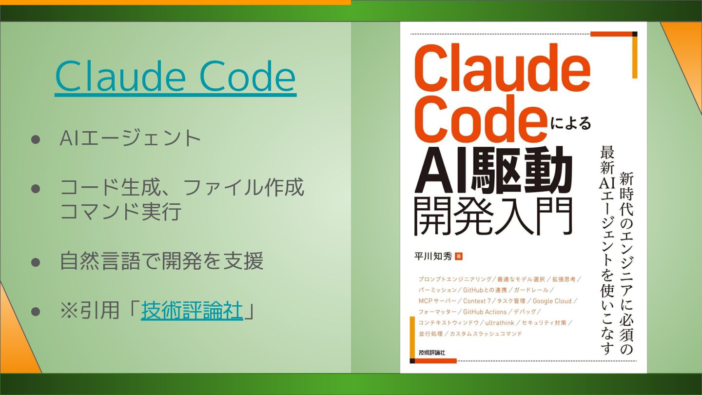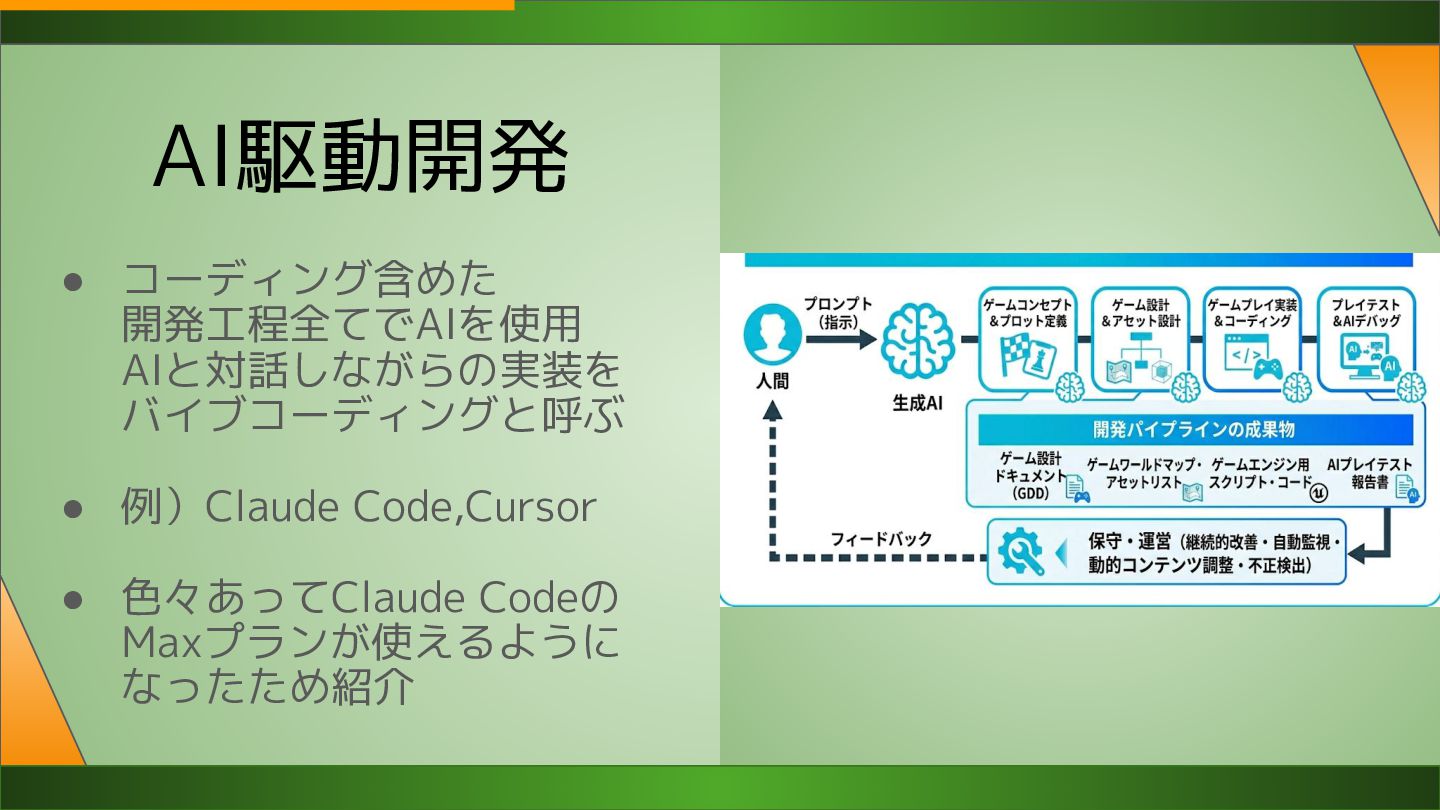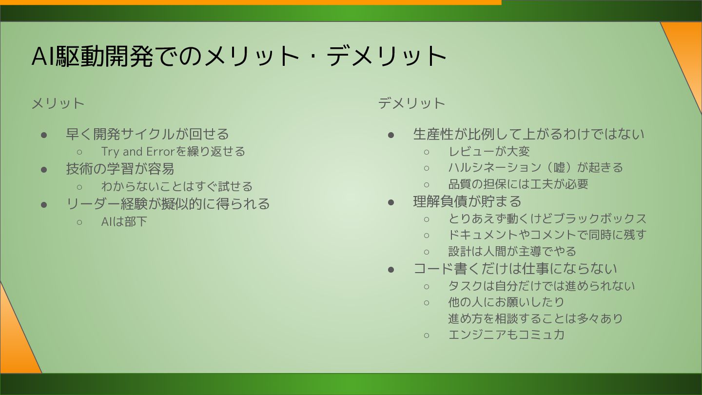 ◦ わからないことはすぐ試せる • リーダー経験が擬似的に得られる ◦ AIは部下 デメリット • 生産性が比例して上がるわけではない ◦ レビューが大変 ◦ ハルシネーション(嘘)が起きる ◦ 品質の担保には工夫が必要 • 理解負債が貯まる ◦ とりあえず動くけどブラックボックス ◦ ドキュメントやコメントで同時に残す ◦ 設計は人間が主導でやる • コード書くだけは仕事にならない ◦ タスクは自分だけでは進められない ◦ 他の人にお願いしたり 進め方を相談することは多々あり ◦ エンジニアもコミュ力
