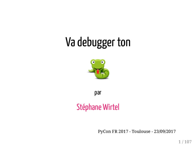 logging.info('start program') logging.debug("before loop") for i in range(1, 4): i /= 4 logging.debug(i) logging.debug("after loop") if i == 4: print("Hello PyConFR 2017") logging.debug("Hello PyConFR 2017") logging.info('end program') if __name__ == '__main__': main() 10 / 107