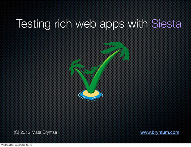 NodeJS) Unit testing and Functional testing Write tests in plain JavaScript Adapters for Ext JS, Sencha Touch We use it. 3000+ assertions Automation via PhantomJS or Selenium Wednesday, December 12, 12
