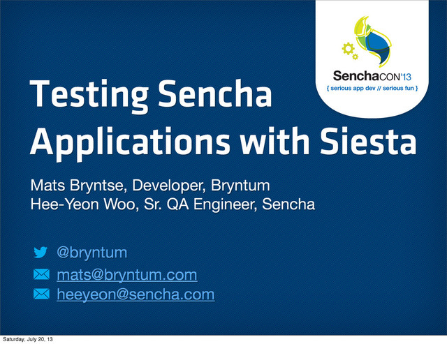 user • Hard to solve using tools that focus on raw DOM/HTML. • Siesta allows you to simulate user interactions: - type - click - drag Saturday, July 20, 13