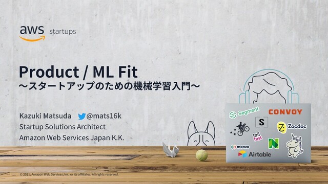 rights reserved. Product / ML Fit 〜スタートアップのための機械学習⼊⾨〜 Kazuki Matsuda @mats16k Startup Solutions Architect Amazon Web Services Japan K.K.