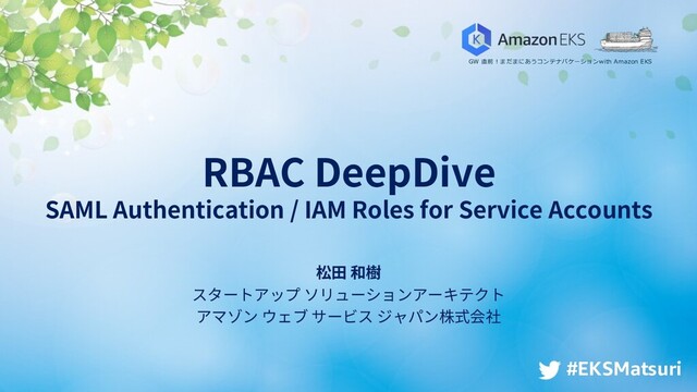 rights reserved. #EKSMatsuri SAML 認証での AWS の利⽤ AWS への 認証 に SAML 認証を利⽤可能 • AWS Single Sign-On • G Suite • Azure AD など メリット • IAM での権限管理は今まで通り • ID 基盤の集約、アカウント管理の簡素化 • IAM User を管理しなくて良い!!!