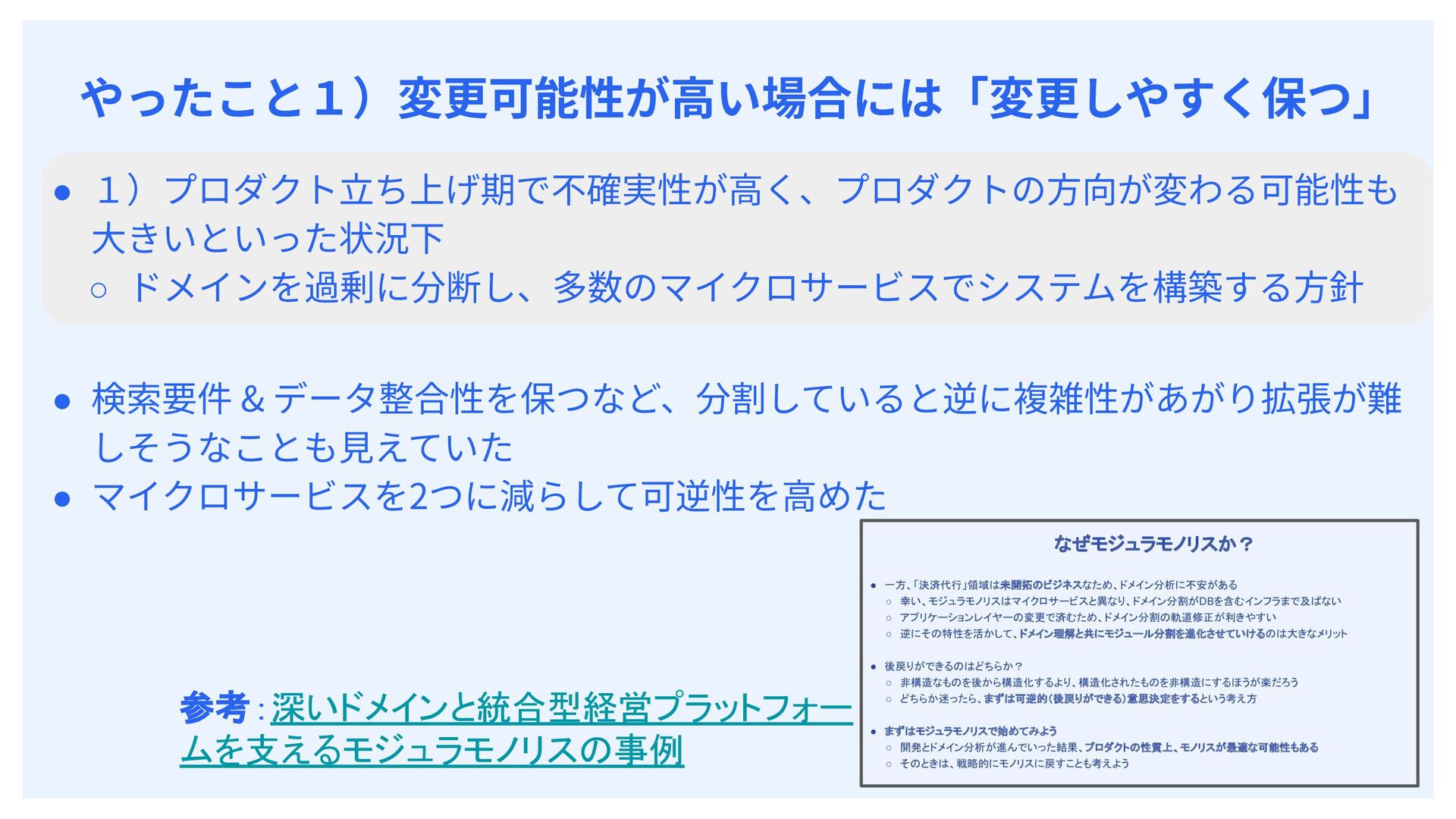 * p22 [深いドメインと統合型経営プラットフォームを支えるモジュラモノリスの事例](https://speakerdeck.com/ogugu9/modular-monolith-that-support-deep-domains-and-integrated-management-platform?slide=12)
