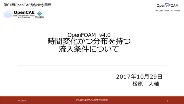 object points; } (0 0 0) 26( // u v w //yMin (0 0 0) (5.903836028 0 0 ) (6.518363449 0 0 ) (7.19685673 0 0 ) (7.945974047 0 0 ) (8.419824443 0 0 ) (8.773066621 0 0 ) (9.057236643 0 0 ) (9.296239875 0 0 ) (9.503227992 0 0 ) (9.686250859 0 0 ) (9.850612054 0 0 ) (10 0 0 ) //yMax (0 1 0 ) (5.903836028 1 0 ) (6.518363449 1 0 ) (7.19685673 1 0 ) (7.945974047 1 0 ) (8.419824443 1 0 ) (8.773066621 1 0 ) (9.057236643 1 0 ) (9.296239875 1 0 ) (9.503227992 1 0 ) (9.686250859 1 0 ) (9.850612054 1 0 ) (10 1 0 ) ) … … boundaryData /inlet /0/U = $%& ' '()* +/- , $%& = 1[m], $%& =10[m /s] 第61回OpenCAE勉強会@関⻄ 2017/10/29