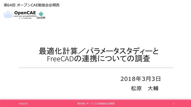 最適化計算/パラメータスタディーと FreeCADの連携についての調査 2018/3/3 1 第64回 オープンCAE勉強会@関⻄ 松原 ⼤輔 2018年3⽉3⽇ 第64回