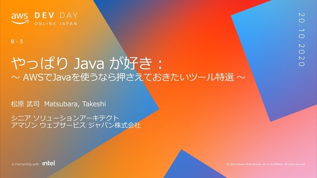 rights reserved. In Partnership with その3: Lambda Power Tools for Java (beta) Logging機能1: 指定サンプルレートに基づくメソッドエントリ時の ⾃動ログ (@PowertoolsLoggingアノテーション) { "instant":{ "epochSecond":1602976697, "nanoOfSecond":477015000 }, "thread":"main", "level":"INFO", "loggerName":"sample.App", "message":"{ ¥"resource¥":¥"/SampleLambdaPowerToolsJavaFunction¥", ¥"path¥":¥"/SampleLambdaPowerToolsJavaFunction¥", ¥"httpMethod¥":¥"GET¥",¥"headers¥":null,¥"multiValueHeaders¥":null,¥"queryStringParameters¥":null ,¥"multiValueQueryStringParameters¥":null,¥"pathParameters¥":null,¥"stageVariables¥":null, ¥"requestContext¥":{ ¥"accountId¥":¥”<accountId>¥",¥"stage¥":¥"test-invoke-stage¥",¥"resourceId¥":¥"so6ow9¥", ¥"requestId¥":¥"e928fec9-748c-4b66-a88d-fac15e32a760¥",¥"operationName¥":null, ¥"identity¥":{¥"cognitoIdentityPoolId¥":null,¥"accountId¥":¥”<accountId>¥", ¥"cognitoIdentityId¥":null,¥"caller¥":¥"AIDAIPU5HZ5HWR5F23L3I¥", ¥"apiKey¥":¥"test-invoke-api-key¥",¥"sourceIp¥":¥"test-invoke-source-ip¥", ¥"cognitoAuthenticationType¥":null,¥"cognitoAuthenticationProvider¥":null, ¥"userArn¥":¥"arn:aws:iam::<accountId>:user/<iamUser>¥", ¥"userAgent¥":¥”<userAgent>¥",¥"user¥":¥"AIDAIPU5HZ5HWR5F23L3I¥",¥"accessKey¥":¥”<key>¥"}, ¥"resourcePath¥":¥"/SampleLambdaPowerToolsJavaFunction¥",¥"httpMethod¥":¥"GET¥", ¥"apiId¥":¥”<AppId>¥",¥"path¥":¥"/SampleLambdaPowerToolsJavaFunction¥", ¥"authorizer¥":null }, ¥"body¥":null, ¥"isBase64Encoded¥":false}", ... } @PowertoolsLogging(logEvent = true) で CloudWatch Logsに出⼒された構造化ログレコード例 Lambdaコンテキスト情報の JSONダンプがmessageとして⾃動ログ出⼒