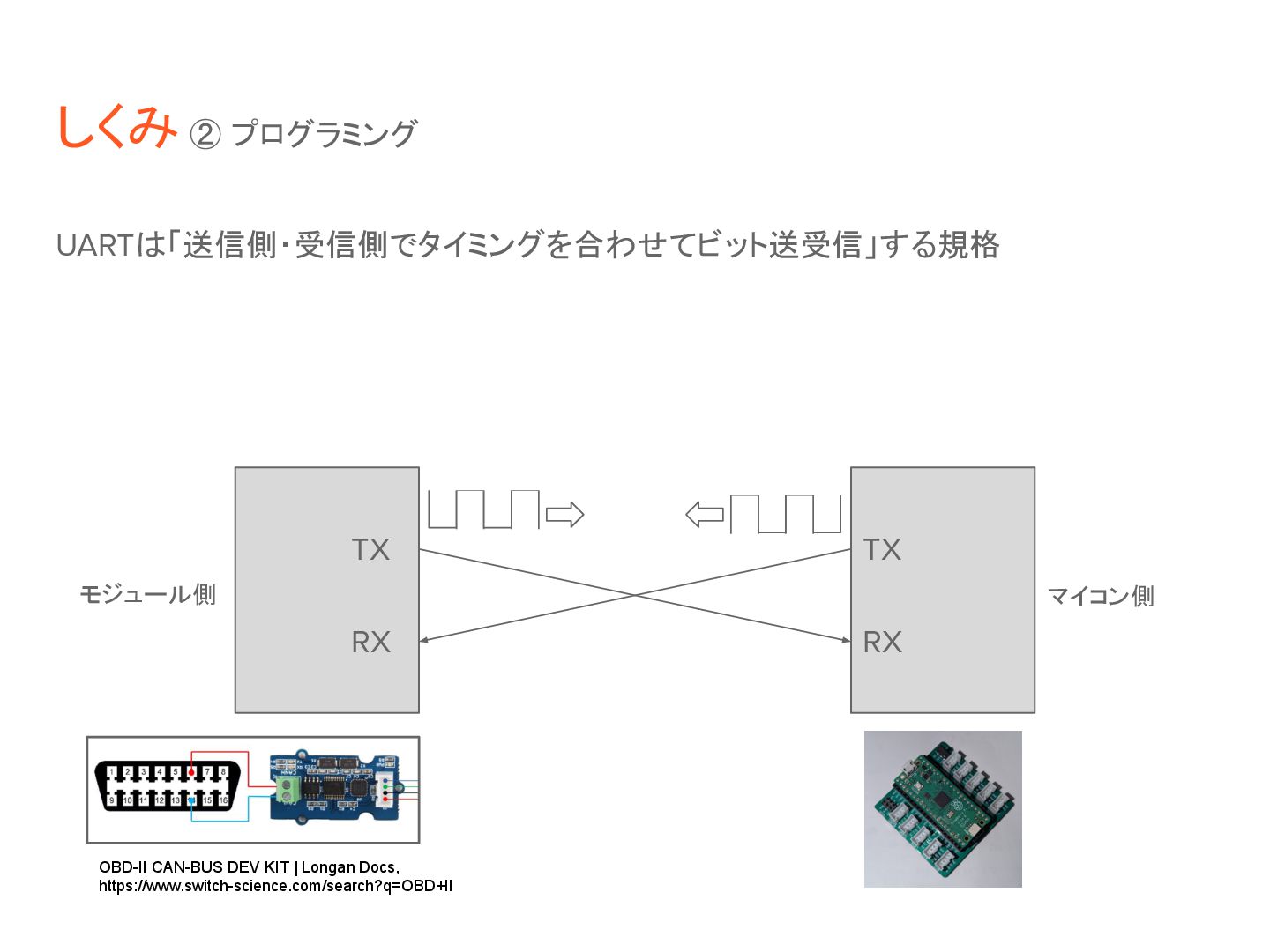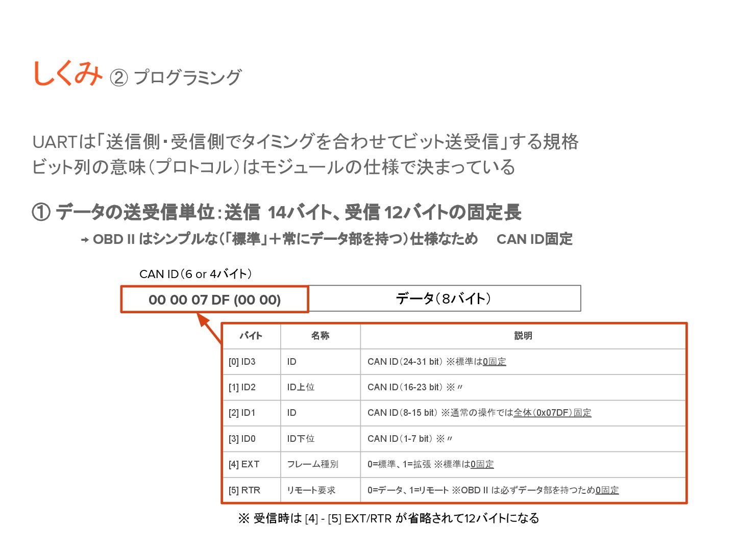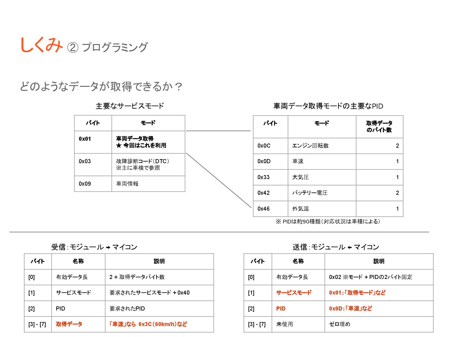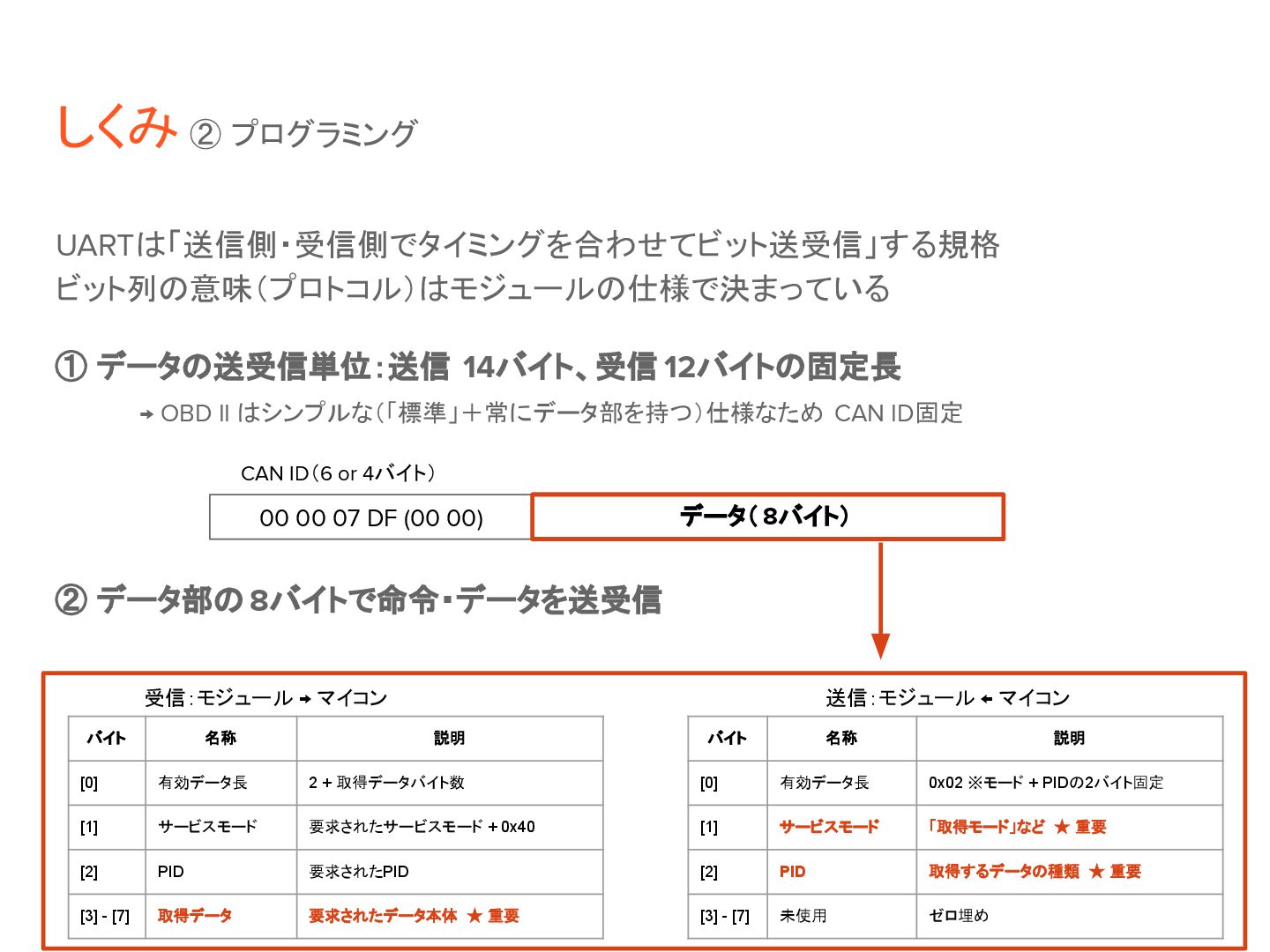 ※モード + PIDの2バイト固定 [1] サービスモード 0x01:「取得モード」など [2] PID 0x0D:「車速」など [3] - [7] 未使用 ゼロ埋め バイト 名称 説明 [0] 有効データ長 2 + 取得データバイト数 [1] サービスモード 要求されたサービスモード + 0x40 [2] PID 要求されたPID [3] - [7] 取得データ 「車速」なら 0x3C(60km/h)など バイト モード 取得データ のバイト数 0x0C エンジン回転数 2 0x0D 車速 1 0x33 大気圧 1 0x42 バッテリー電圧 2 0x46 外気温 1 車両データ取得モードの主要なPID バイト モード 0x01 車両データ取得 ★ 今回はこれを利用 0x03 故障診断コード(DTC) ※主に車検で参照 0x09 車両情報 主要なサービスモード ※ PIDは約90種類(対応状況は車種による) 送信:モジュール ← マイコン 受信:モジュール → マイコン