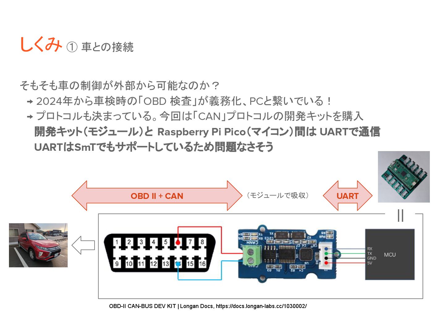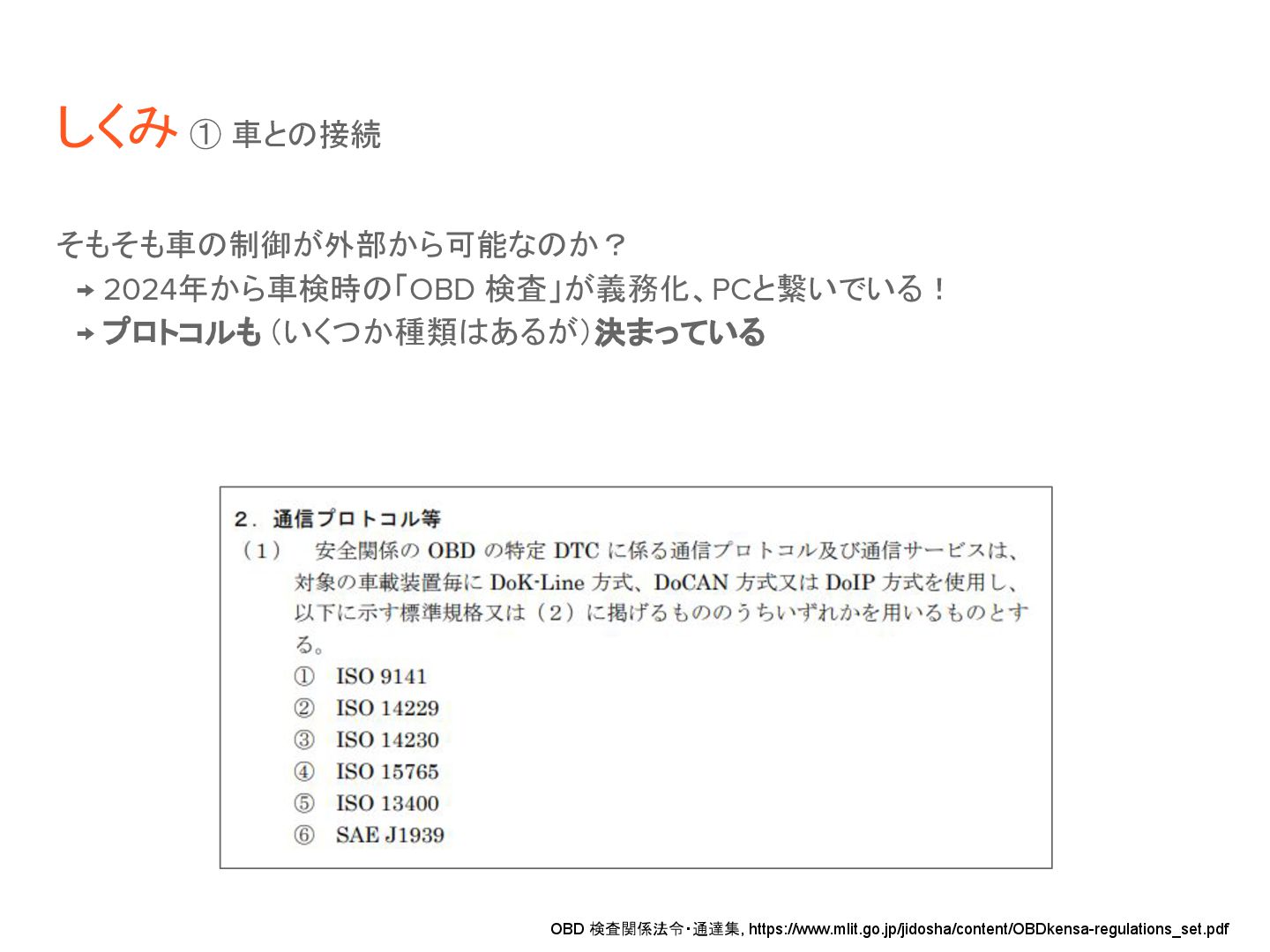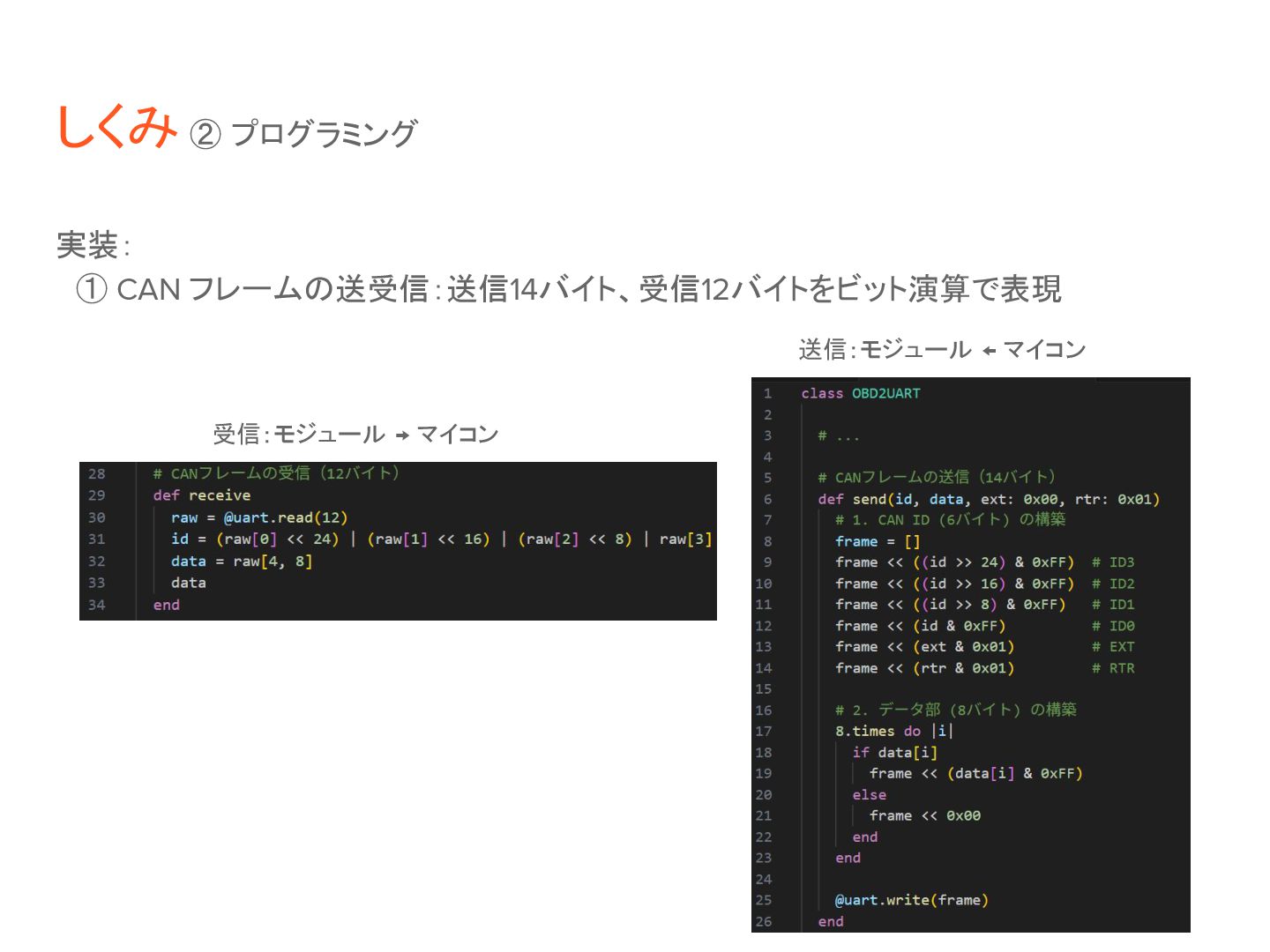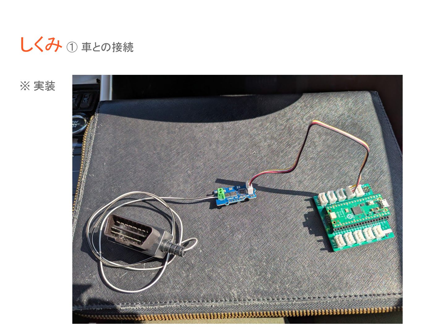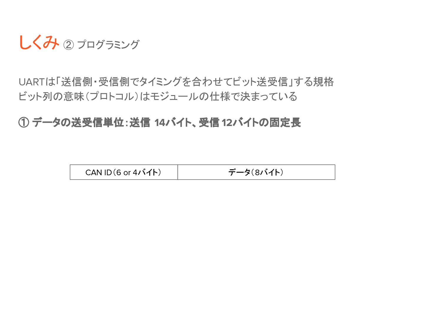 ※モード + PIDの2バイト固定 [1] サービスモード 0x01:「取得モード」など [2] PID 0x0D:「車速」など [3] - [7] 未使用 ゼロ埋め バイト 名称 説明 [0] 有効データ長 2 + 取得データバイト数 [1] サービスモード 要求されたサービスモード + 0x40 [2] PID 要求されたPID [3] - [7] 取得データ 「車速」なら 0x3C(60km/h)など バイト モード 取得データ のバイト数 0x0C エンジン回転数 2 0x0D 車速 1 0x33 大気圧 1 0x42 バッテリー電圧 2 0x46 外気温 1 車両データ取得モードの主要なPID バイト モード 0x01 車両データ取得 ★ 今回はこれを利用 0x03 故障診断コード(DTC) ※主に車検で参照 0x09 車両情報 主要なサービスモード ※ PIDは約90種類(対応状況は車種による) 送信:モジュール ← マイコン 受信:モジュール → マイコン