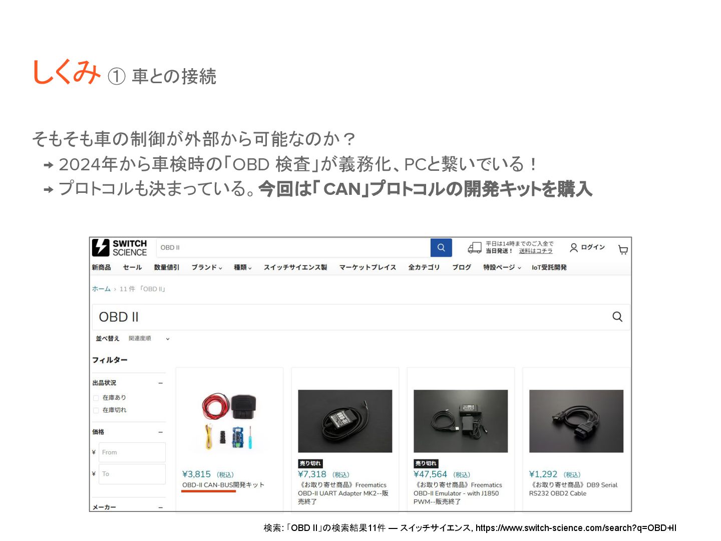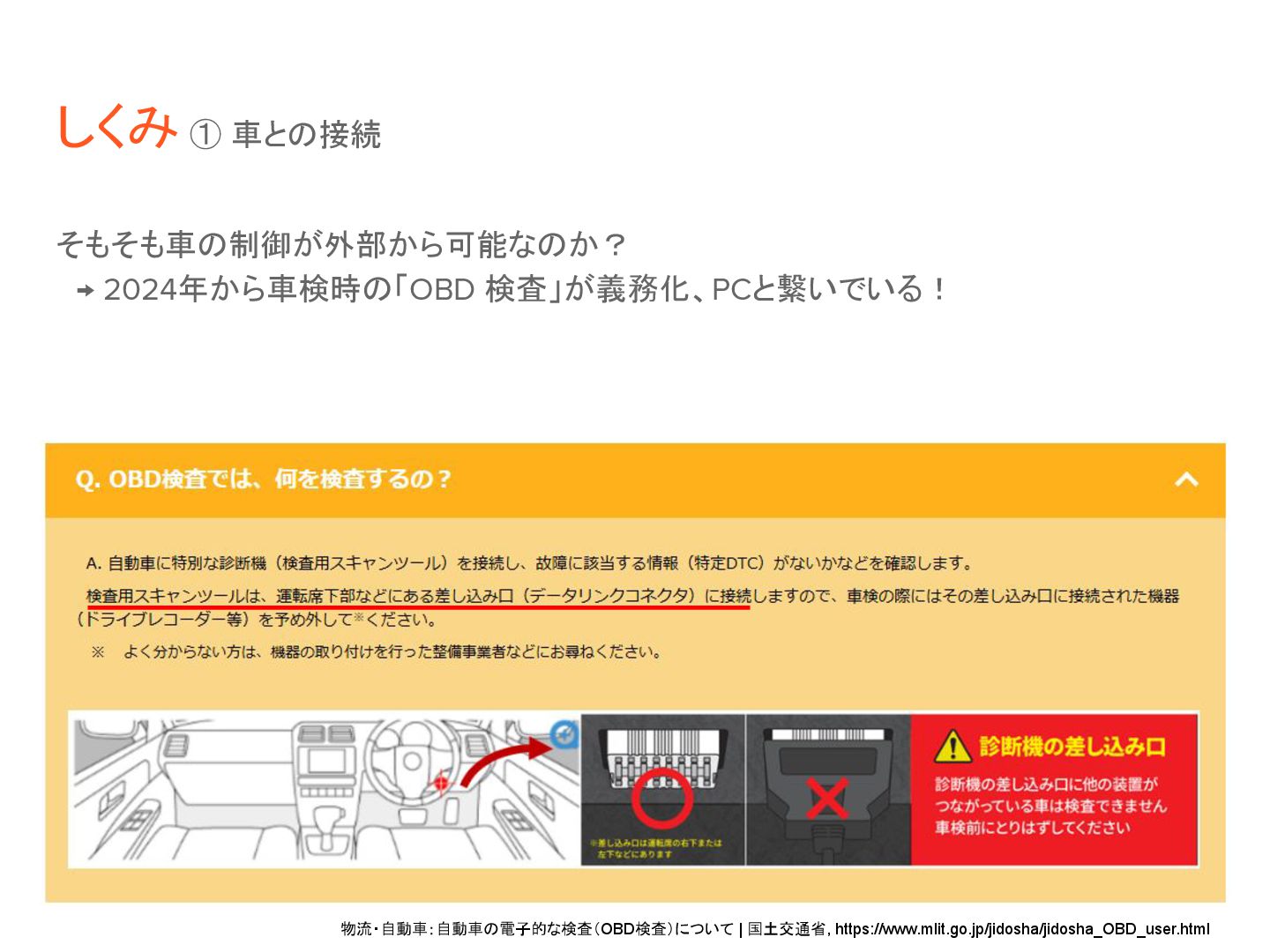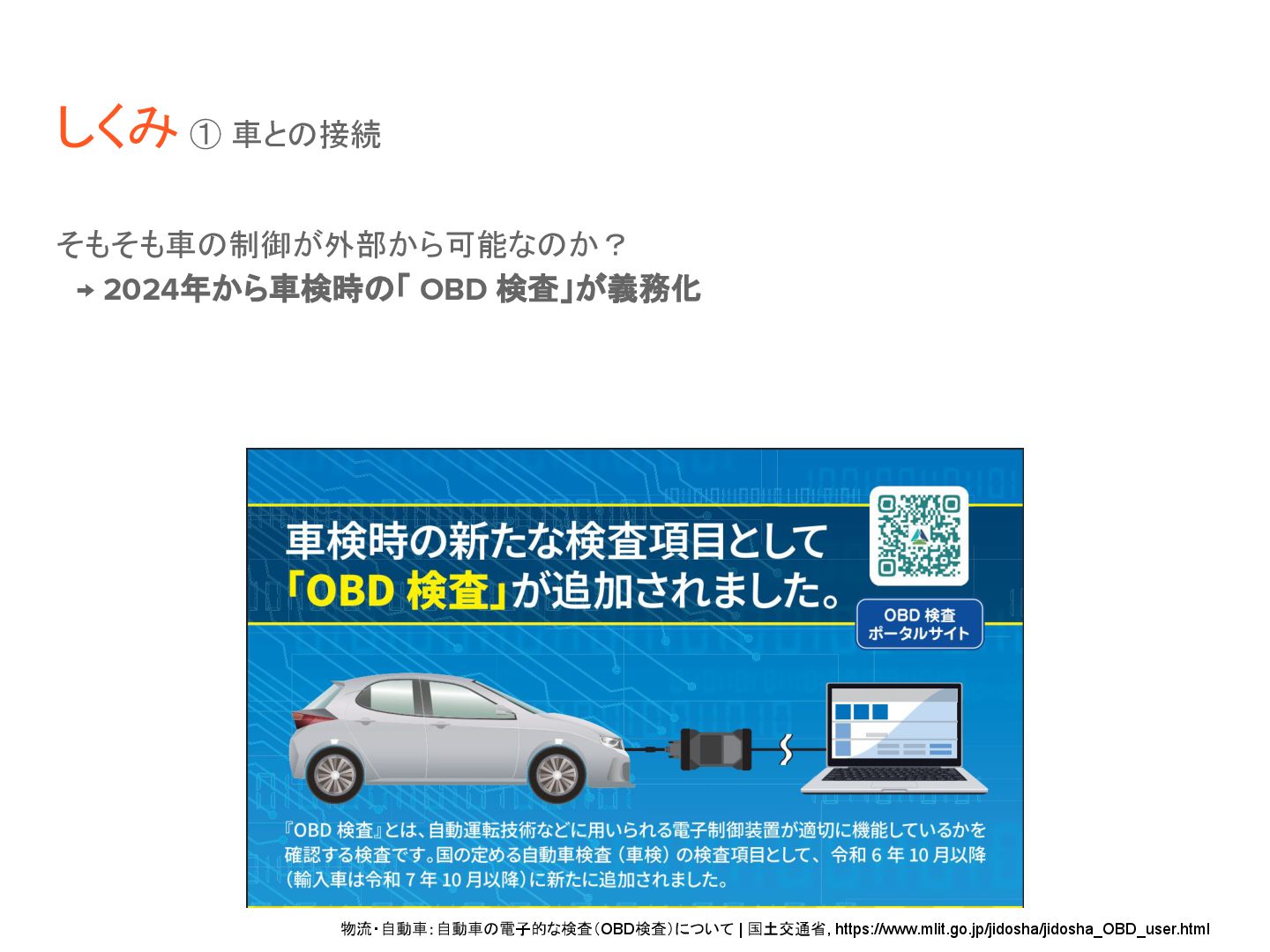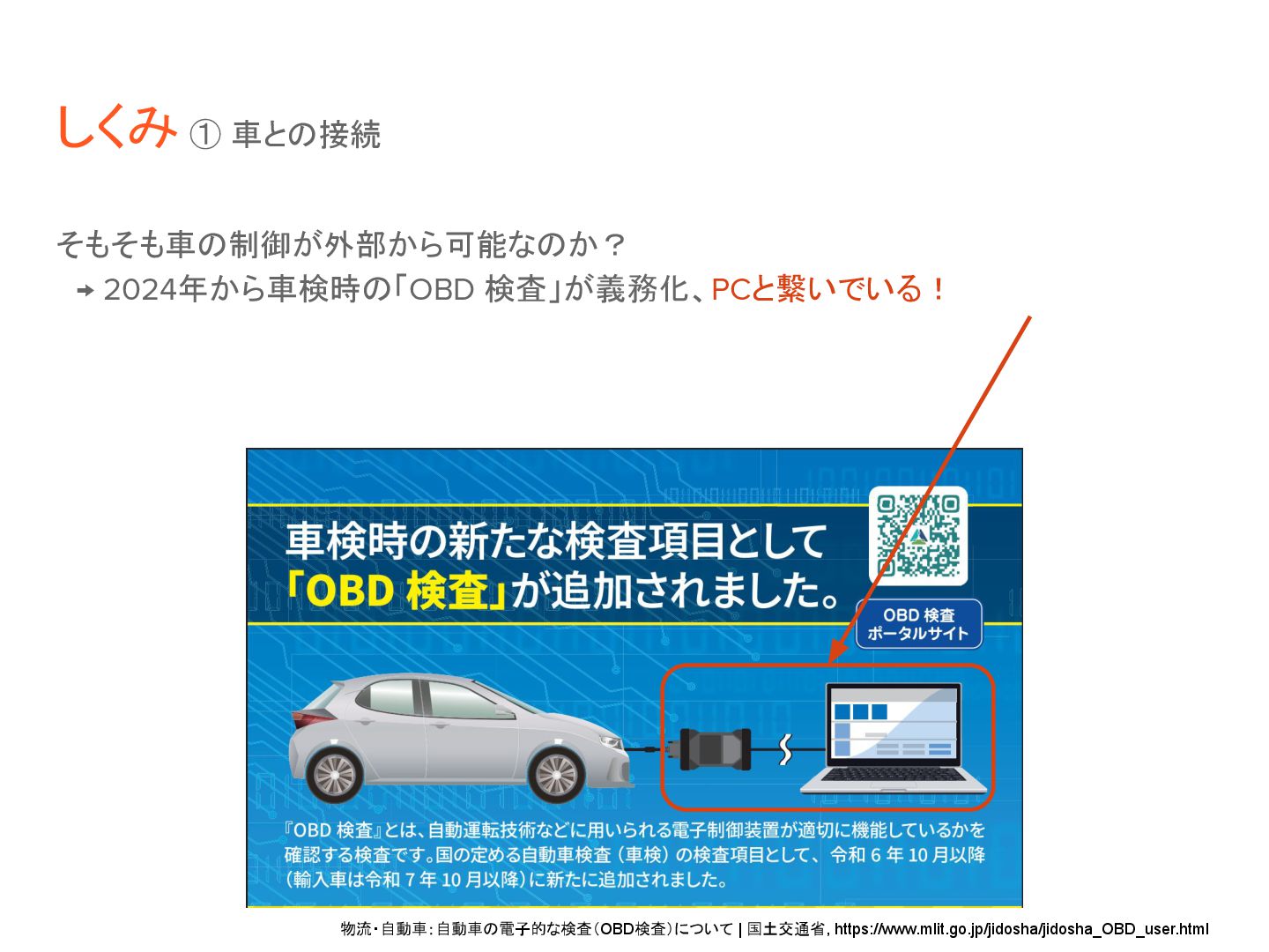 ※モード + PIDの2バイト固定 [1] サービスモード 0x01:「取得モード」など [2] PID 0x0D:「車速」など [3] - [7] 未使用 ゼロ埋め バイト 名称 説明 [0] 有効データ長 2 + 取得データバイト数 [1] サービスモード 要求されたサービスモード + 0x40 [2] PID 要求されたPID [3] - [7] 取得データ 「車速」なら 0x3C(60km/h)など バイト モード 取得データ のバイト数 0x0C エンジン回転数 2 0x0D 車速 1 0x33 大気圧 1 0x42 バッテリー電圧 2 0x46 外気温 1 車両データ取得モードの主要なPID バイト モード 0x01 車両データ取得 ★ 今回はこれを利用 0x03 故障診断コード(DTC) ※主に車検で参照 0x09 車両情報 主要なサービスモード ※ PIDは約90種類(対応状況は車種による) 送信:モジュール ← マイコン 受信:モジュール → マイコン