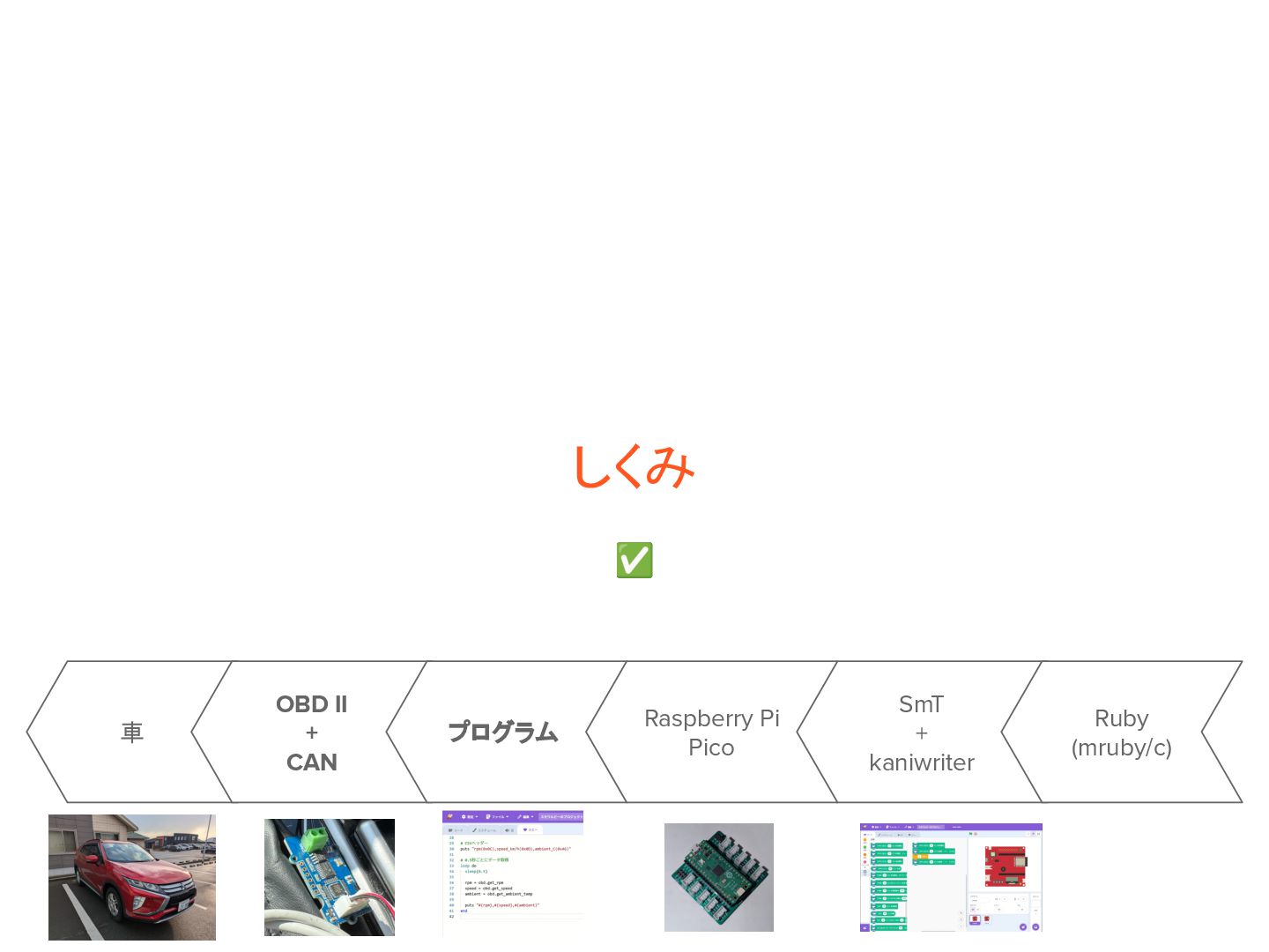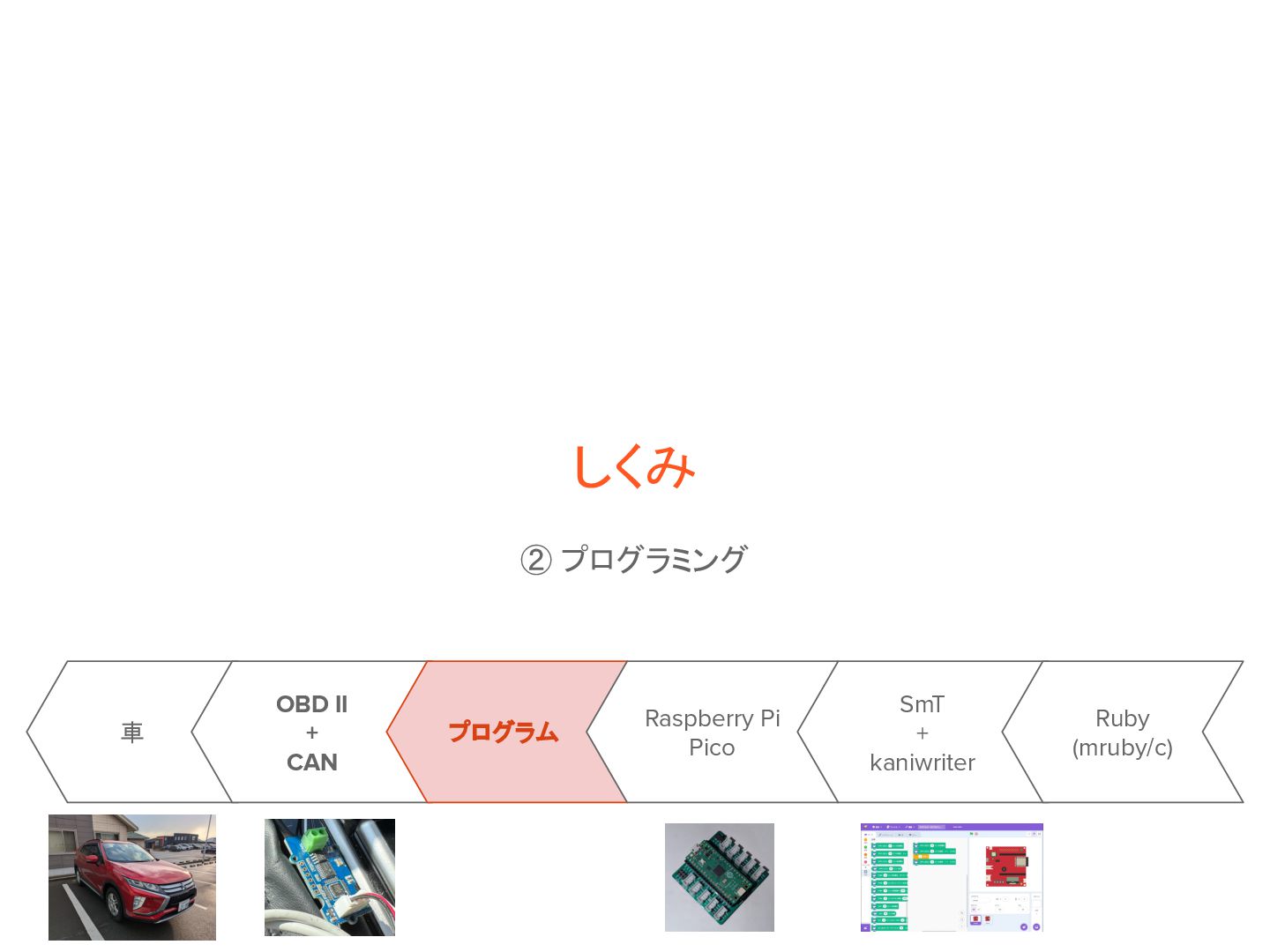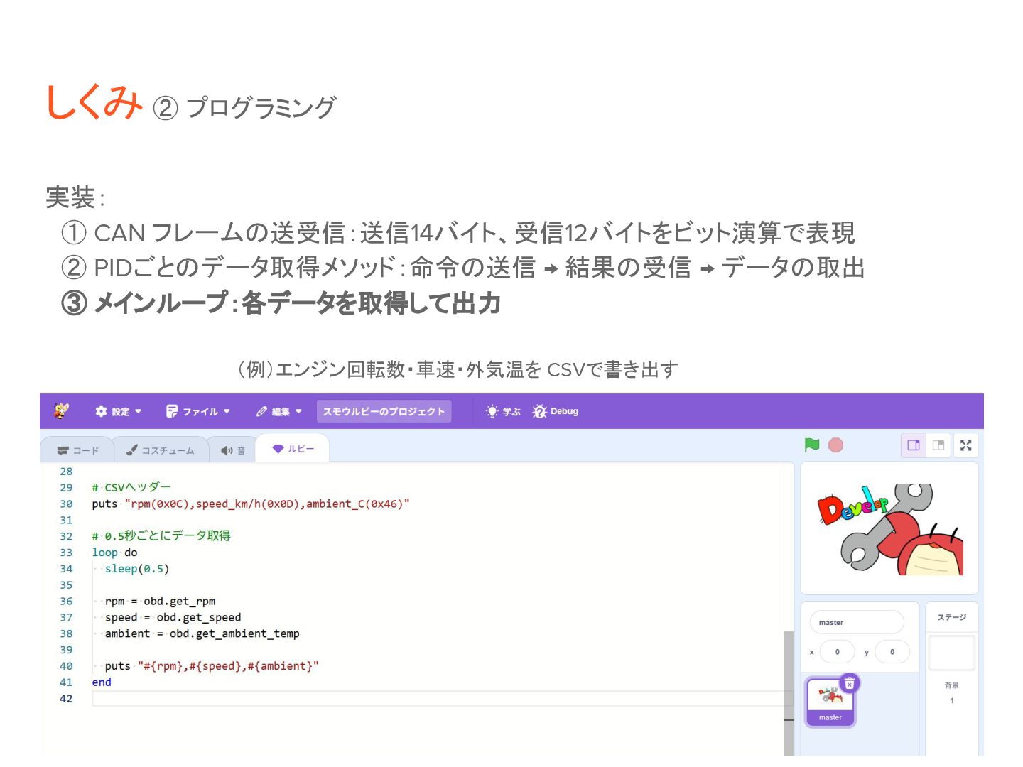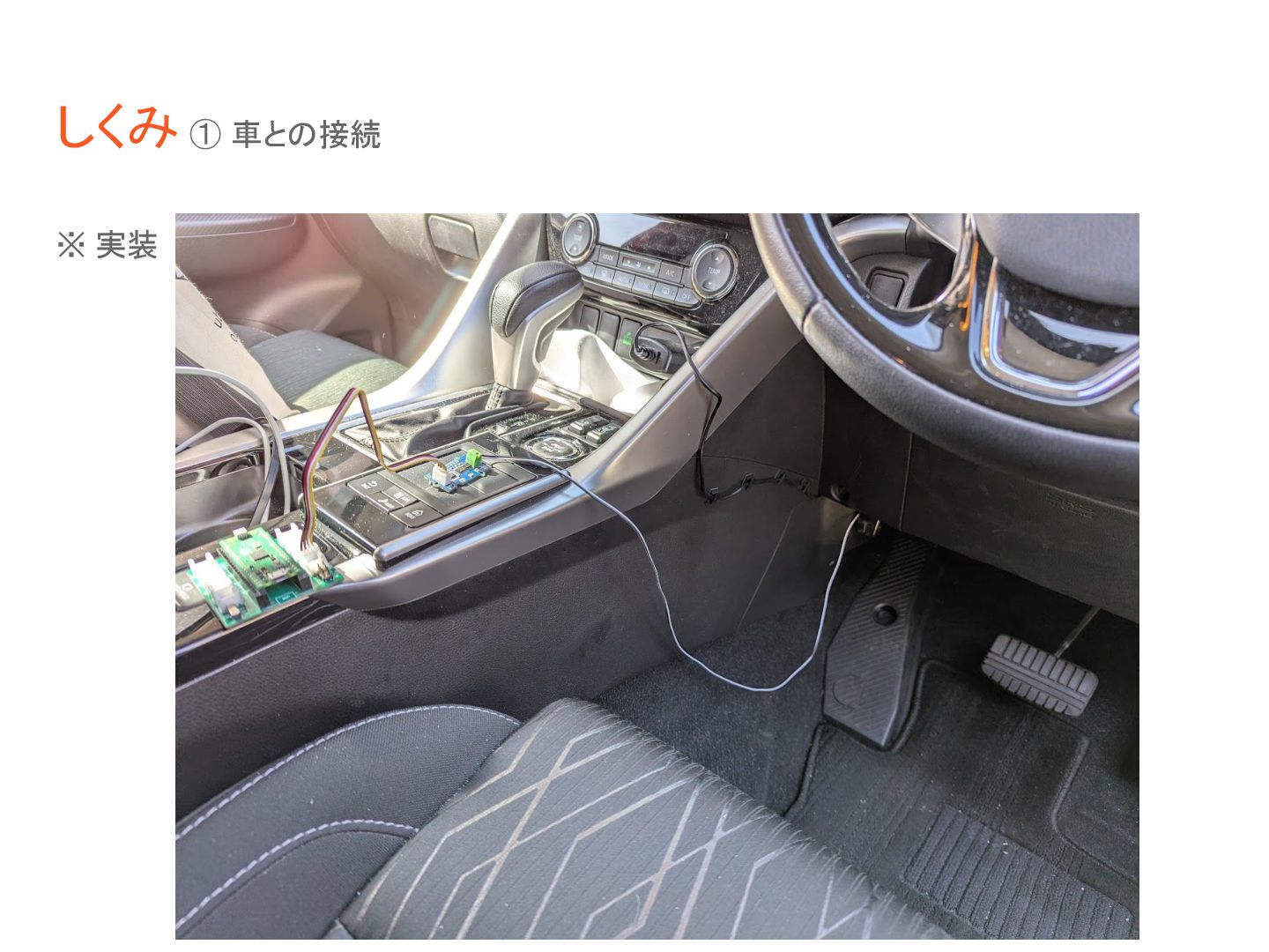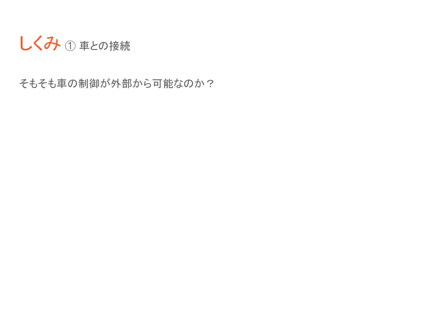 ※モード + PIDの2バイト固定 [1] サービスモード 0x01:「取得モード」など [2] PID 0x0D:「車速」など [3] - [7] 未使用 ゼロ埋め バイト 名称 説明 [0] 有効データ長 2 + 取得データバイト数 [1] サービスモード 要求されたサービスモード + 0x40 [2] PID 要求されたPID [3] - [7] 取得データ 「車速」なら 0x3C(60km/h)など バイト モード 取得データ のバイト数 0x0C エンジン回転数 2 0x0D 車速 1 0x33 大気圧 1 0x42 バッテリー電圧 2 0x46 外気温 1 車両データ取得モードの主要なPID バイト モード 0x01 車両データ取得 ★ 今回はこれを利用 0x03 故障診断コード(DTC) ※主に車検で参照 0x09 車両情報 主要なサービスモード ※ PIDは約90種類(対応状況は車種による) 送信:モジュール ← マイコン 受信:モジュール → マイコン