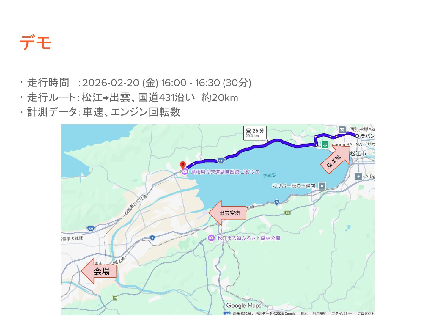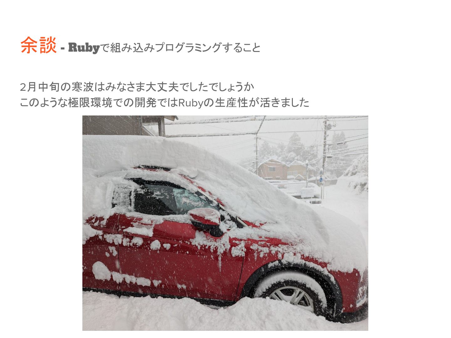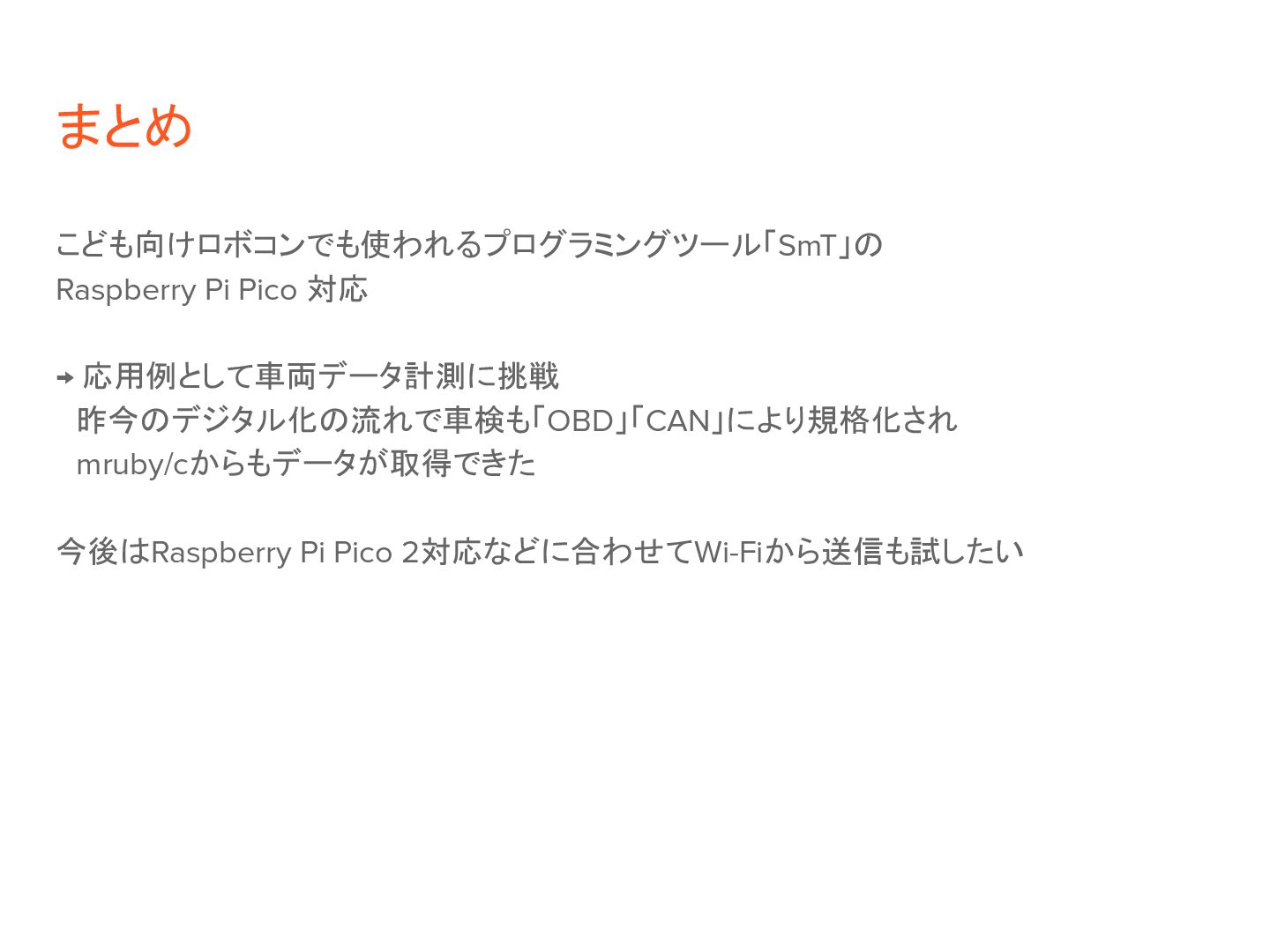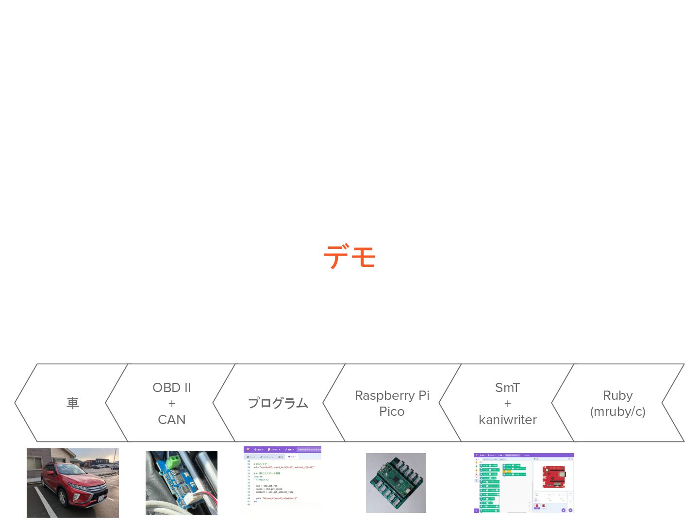 ※モード + PIDの2バイト固定 [1] サービスモード 0x01:「取得モード」など [2] PID 0x0D:「車速」など [3] - [7] 未使用 ゼロ埋め バイト 名称 説明 [0] 有効データ長 2 + 取得データバイト数 [1] サービスモード 要求されたサービスモード + 0x40 [2] PID 要求されたPID [3] - [7] 取得データ 「車速」なら 0x3C(60km/h)など バイト モード 取得データ のバイト数 0x0C エンジン回転数 2 0x0D 車速 1 0x33 大気圧 1 0x42 バッテリー電圧 2 0x46 外気温 1 車両データ取得モードの主要なPID バイト モード 0x01 車両データ取得 ★ 今回はこれを利用 0x03 故障診断コード(DTC) ※主に車検で参照 0x09 車両情報 主要なサービスモード ※ PIDは約90種類(対応状況は車種による) 送信:モジュール ← マイコン 受信:モジュール → マイコン