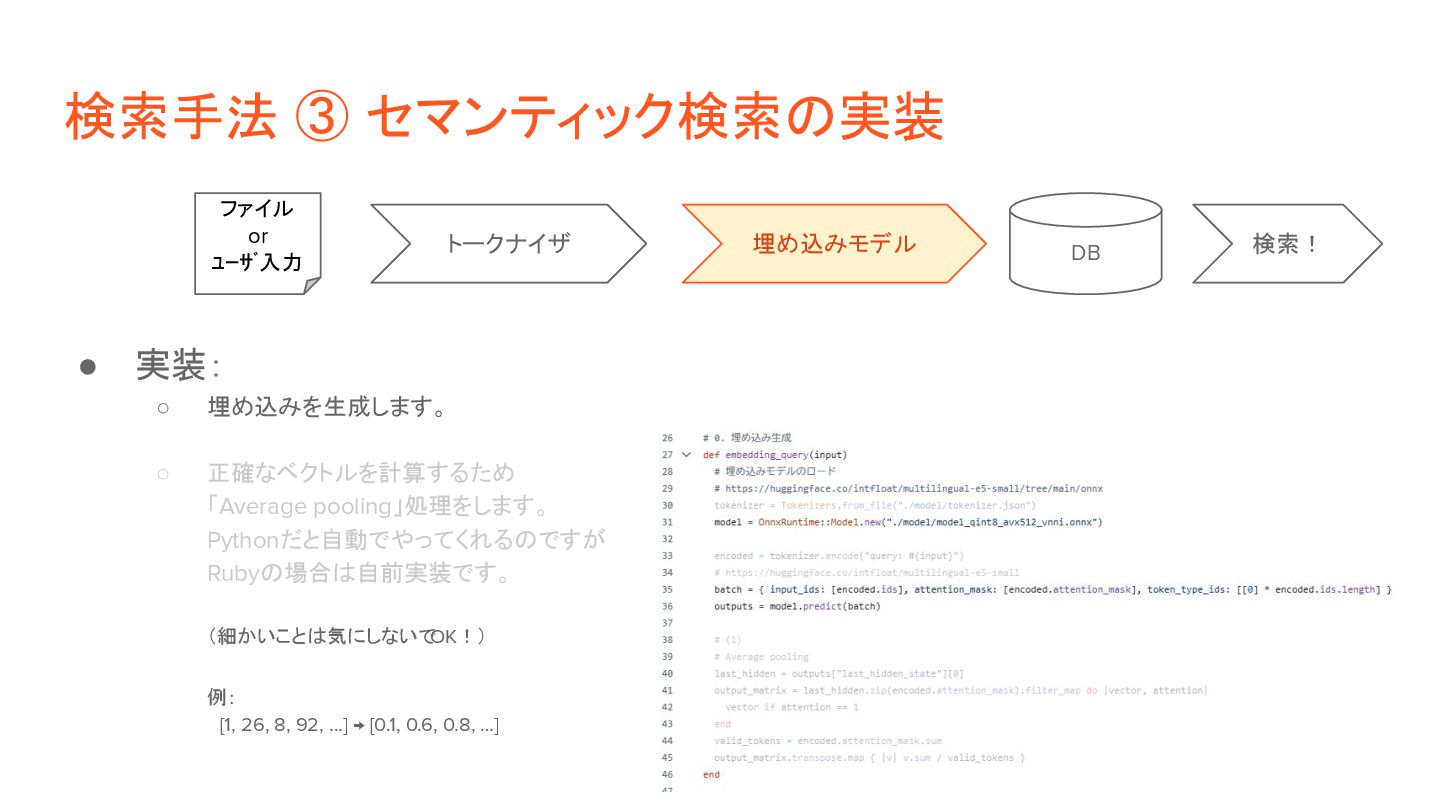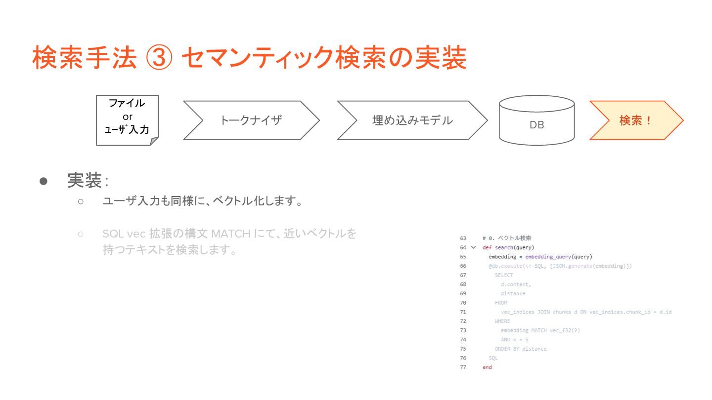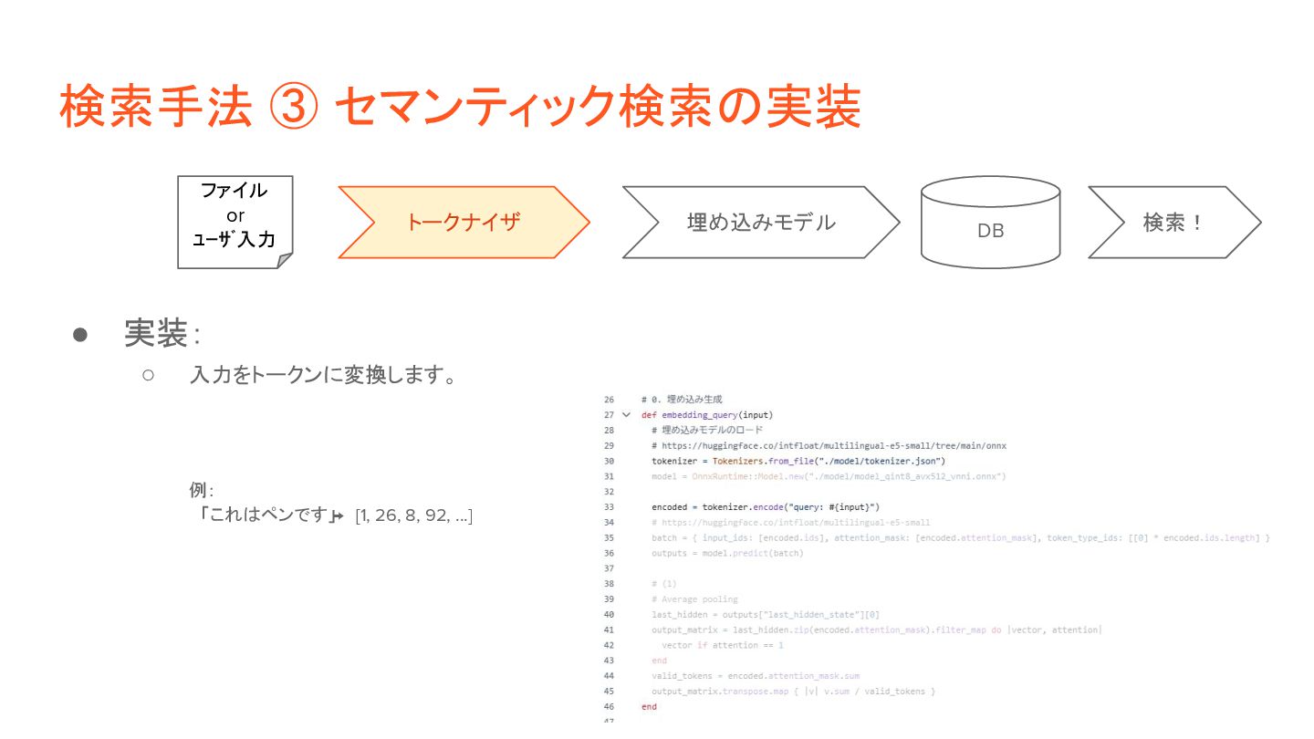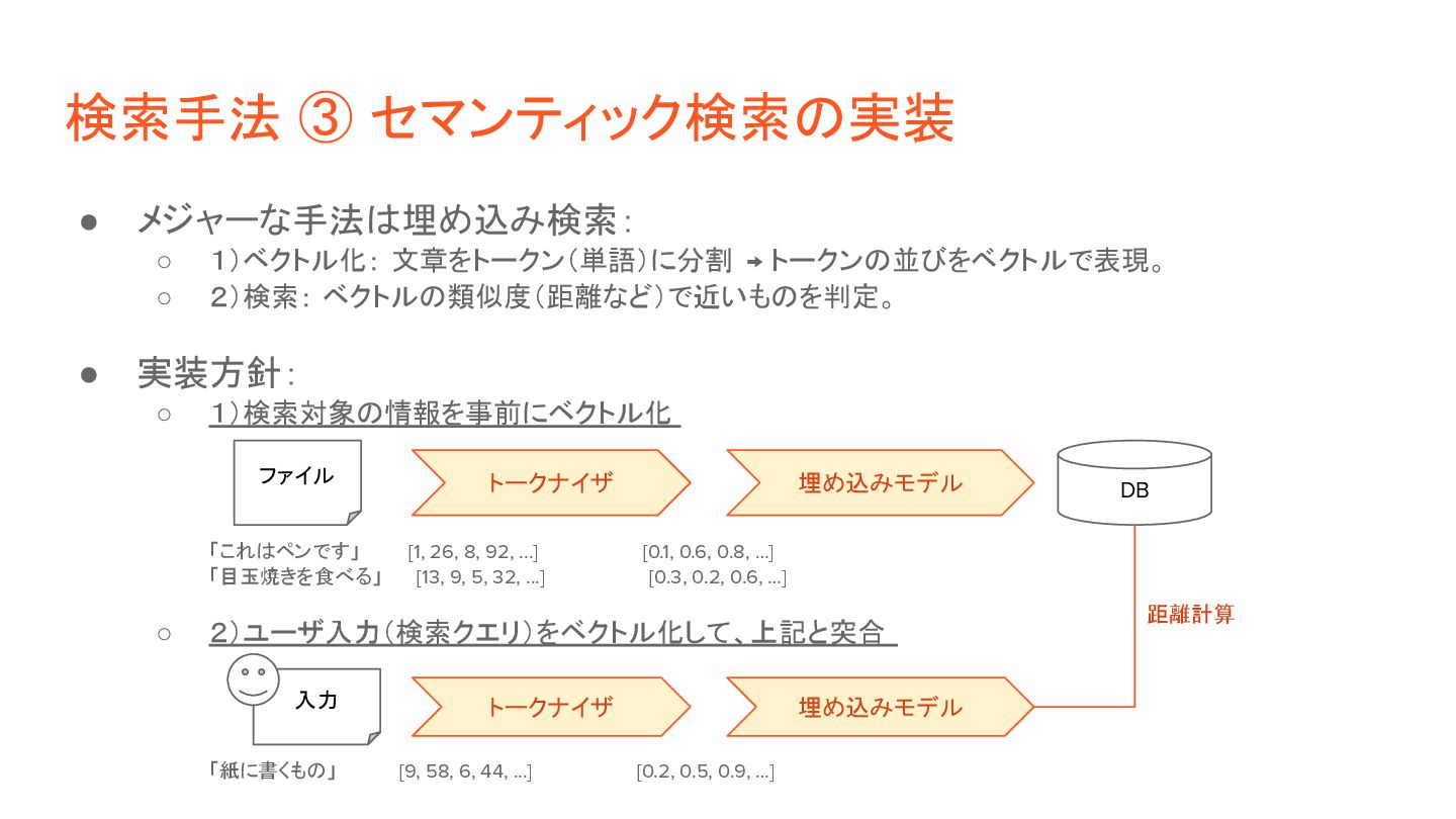 ◦ 2)検索: ベクトルの類似度(距離など)で近いものを判定。 • 実装方針: ◦ 1)検索対象の情報を事前にベクトル化 「これはペンです」 [1, 26, 8, 92, ...] [0.1, 0.6, 0.8, …] 「目玉焼きを食べる」 [13, 9, 5, 32, ...] [0.3, 0.2, 0.6, …] ◦ 2)ユーザ入力(検索クエリ)をベクトル化して、上記と突合 「紙に書くもの」 [9, 58, 6, 44, ...] [0.2, 0.5, 0.9, …] トークナイザ DB ファイル 入力 埋め込みモデル トークナイザ 埋め込みモデル 距離計算