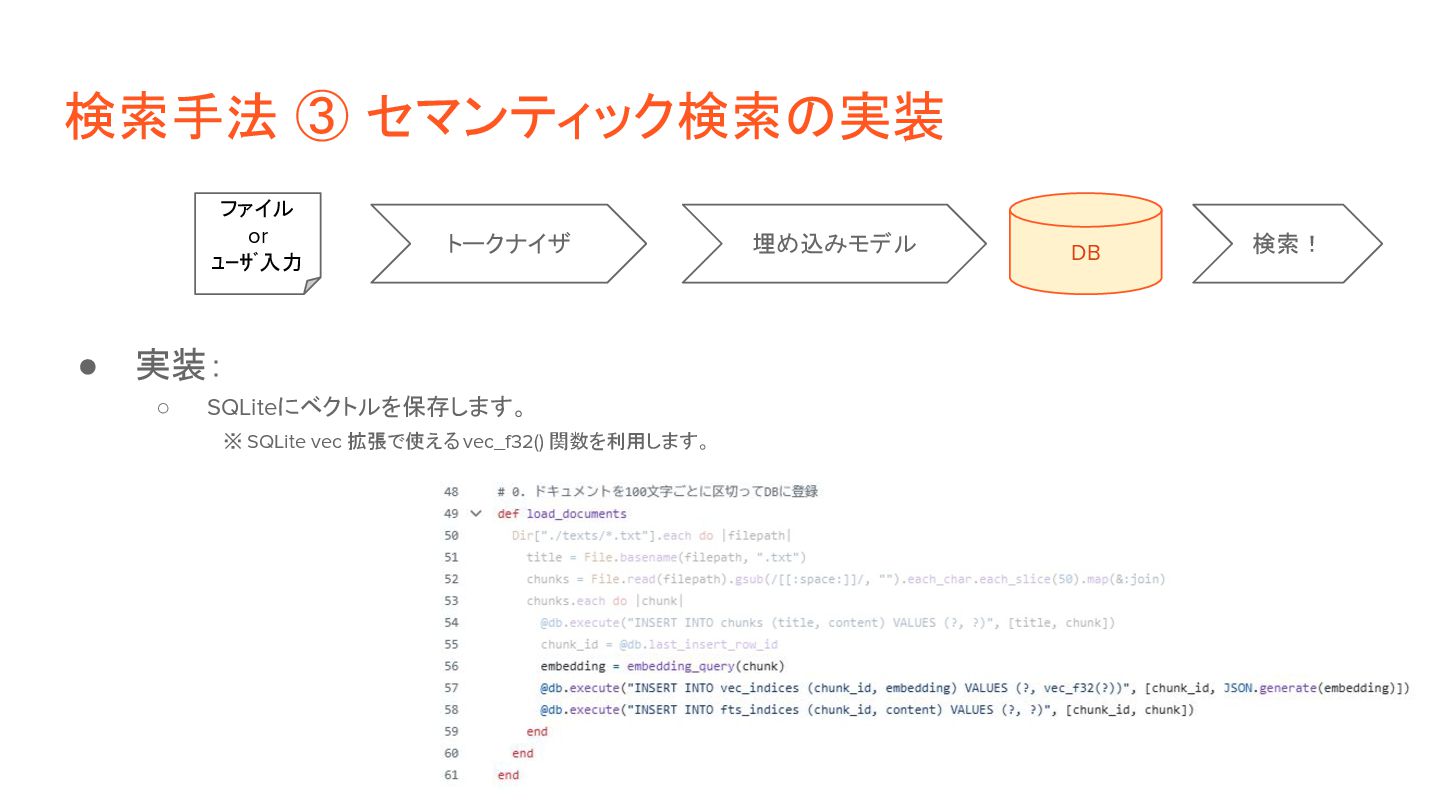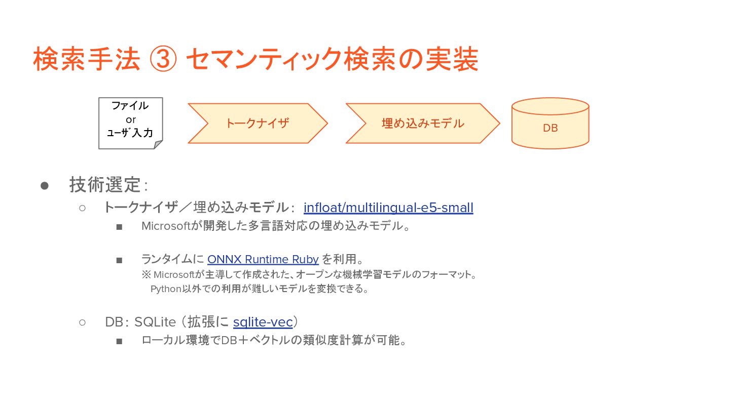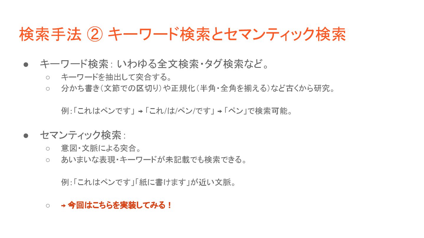 ◦ 2)検索: ベクトルの類似度(距離など)で近いものを判定。 • 実装方針: ◦ 1)検索対象の情報を事前にベクトル化 「これはペンです」 [1, 26, 8, 92, ...] [0.1, 0.6, 0.8, …] 「目玉焼きを食べる」 [13, 9, 5, 32, ...] [0.3, 0.2, 0.6, …] ◦ 2)ユーザ入力(検索クエリ)をベクトル化して、上記と突合 「紙に書くもの」 [9, 58, 6, 44, ...] [0.2, 0.5, 0.9, …] トークナイザ DB ファイル 入力 埋め込みモデル トークナイザ 埋め込みモデル 距離計算
