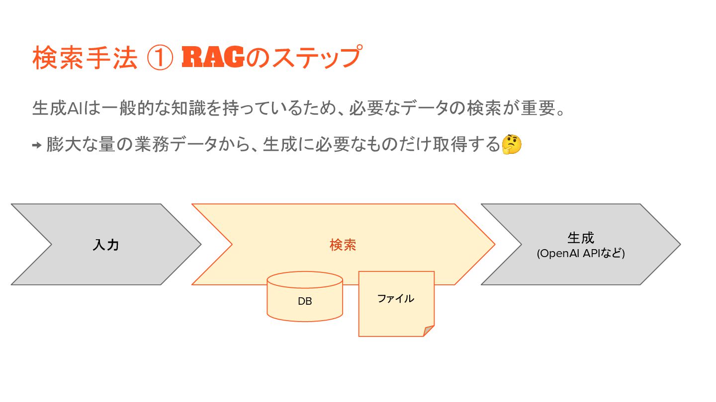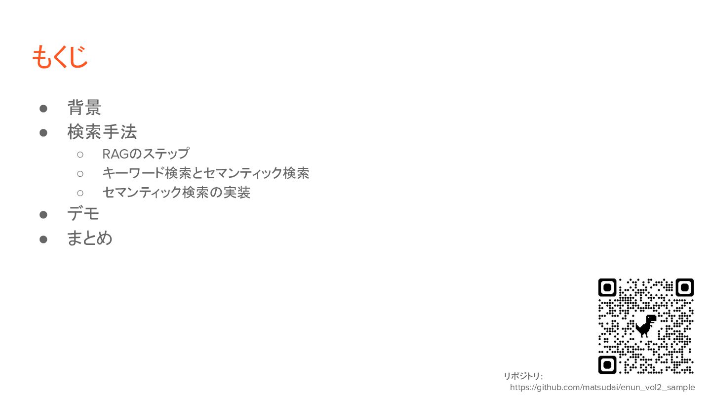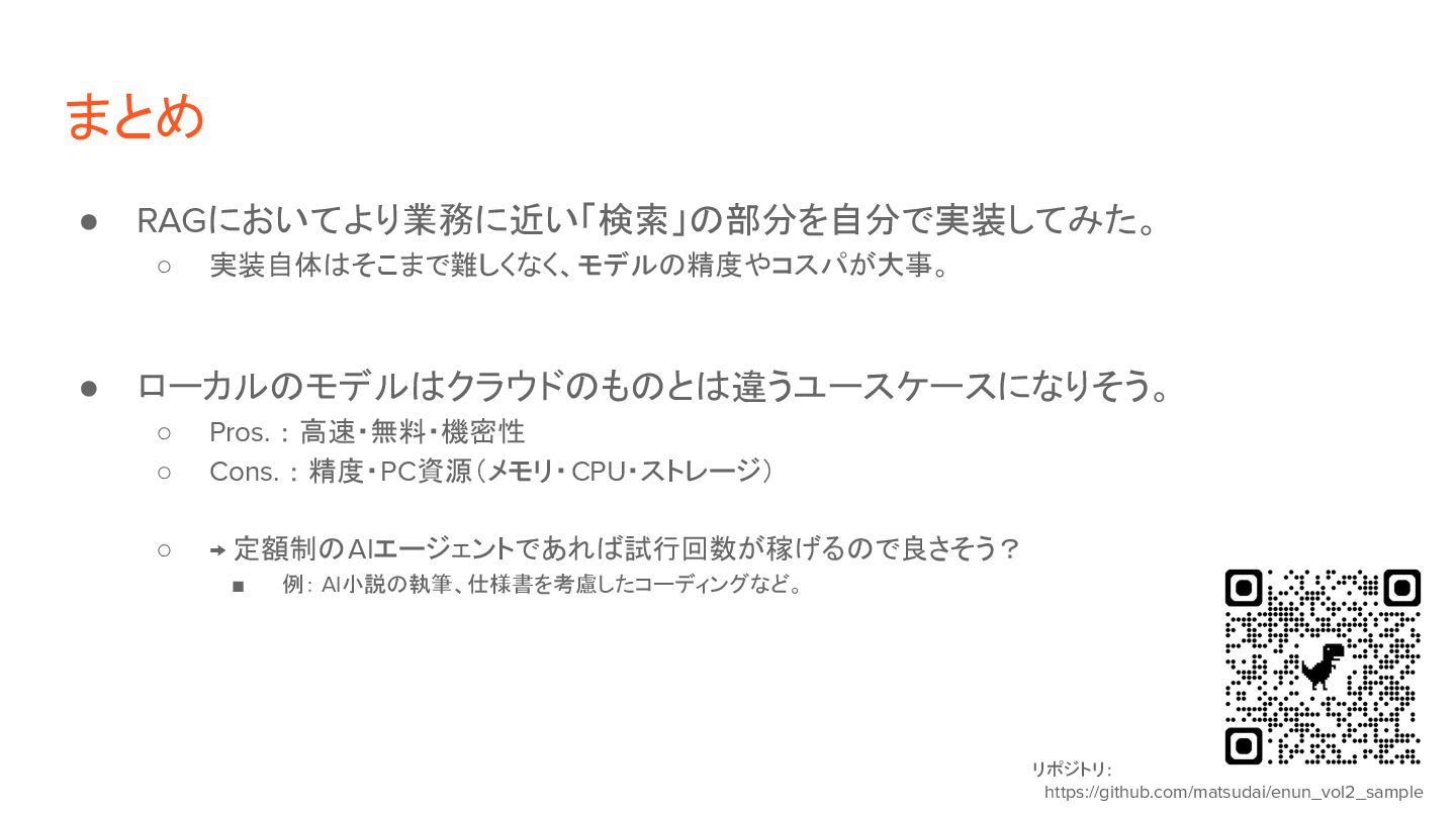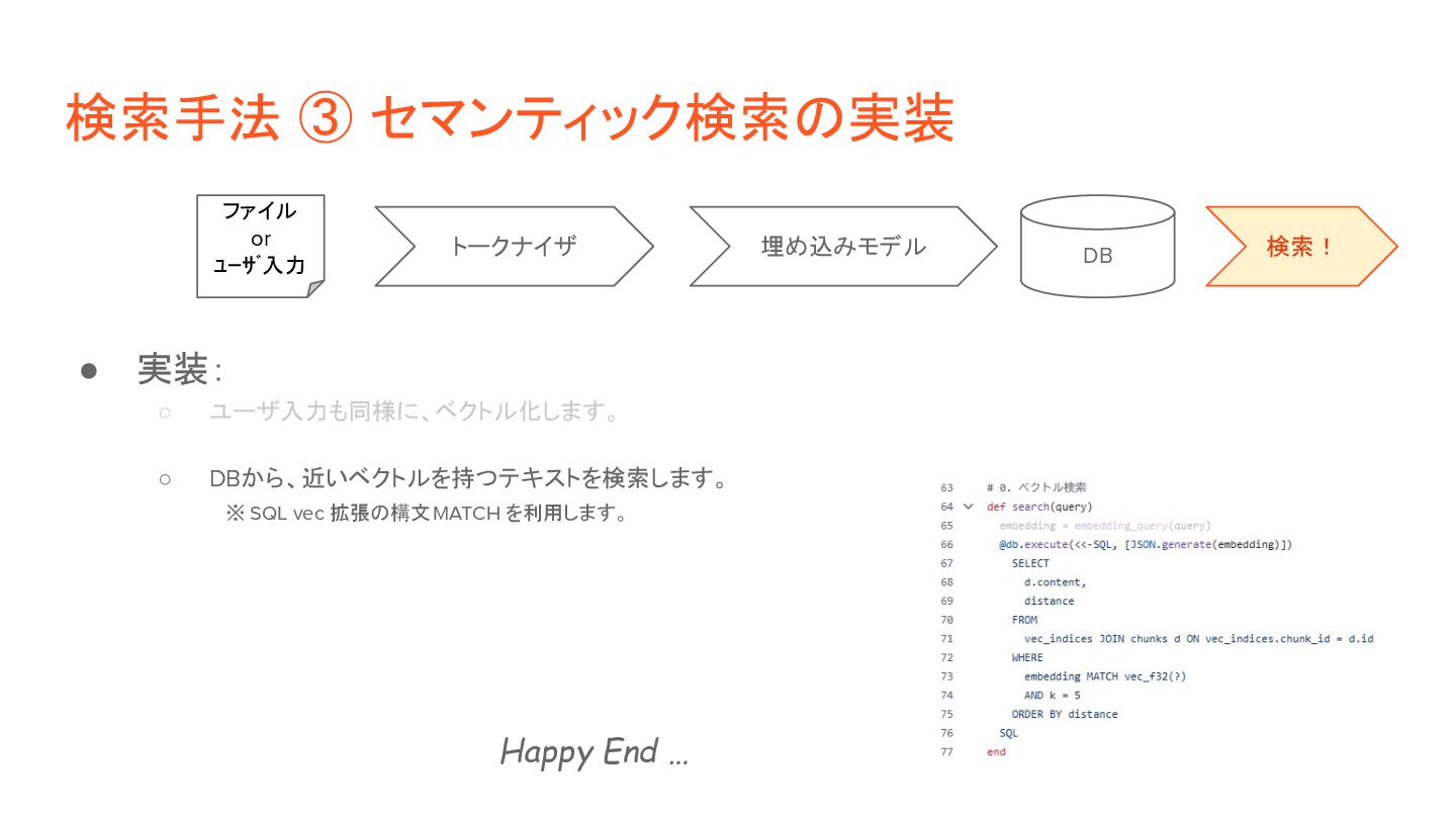 ◦ 2)検索: ベクトルの類似度(距離など)で近いものを判定。 • 実装方針: ◦ 1)検索対象の情報を事前にベクトル化 「これはペンです」 [1, 26, 8, 92, ...] [0.1, 0.6, 0.8, …] 「目玉焼きを食べる」 [13, 9, 5, 32, ...] [0.3, 0.2, 0.6, …] ◦ 2)ユーザ入力(検索クエリ)をベクトル化して、上記と突合 「紙に書くもの」 [9, 58, 6, 44, ...] [0.2, 0.5, 0.9, …] トークナイザ DB ファイル 入力 埋め込みモデル トークナイザ 埋め込みモデル 距離計算