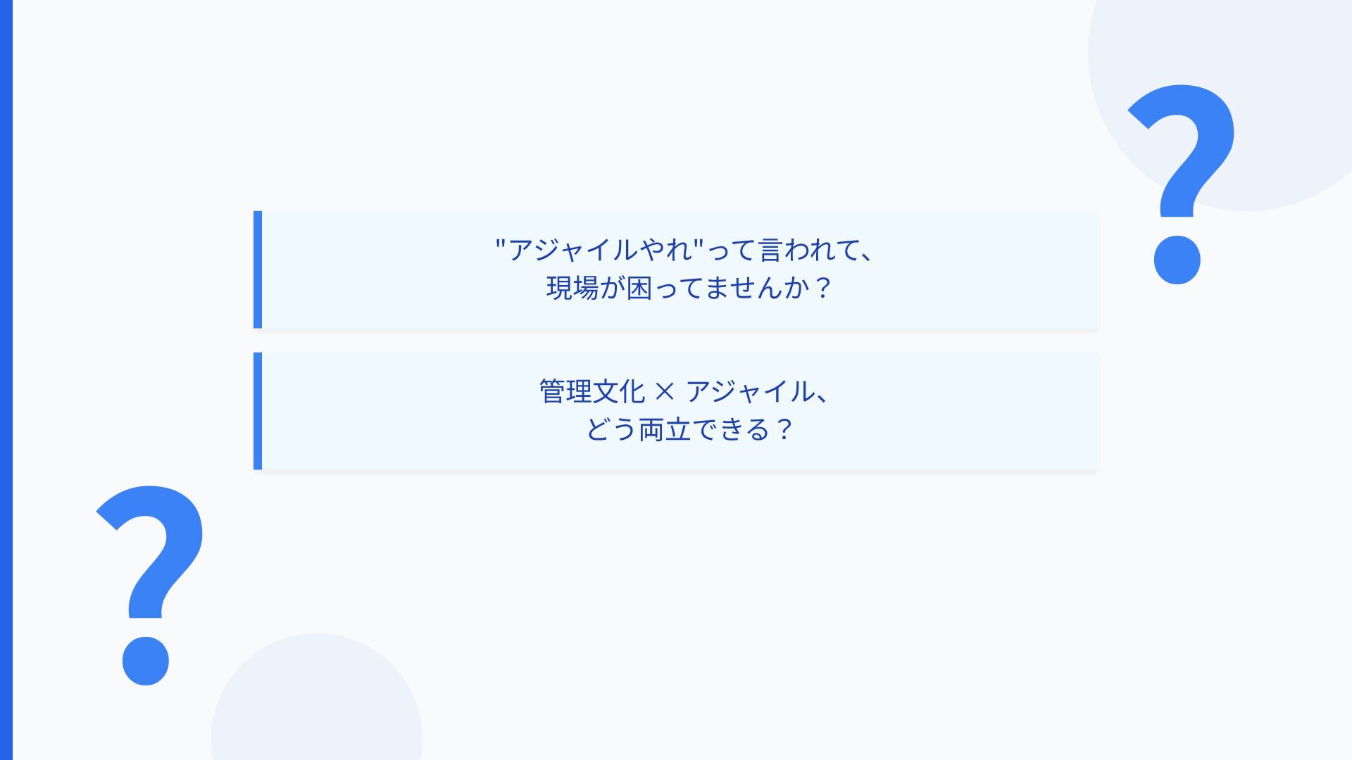 ? ? "アジャイルやれ"って⾔われて、 現場が困ってませんか? 管理⽂化 × アジャイル、 どう両⽴できる?