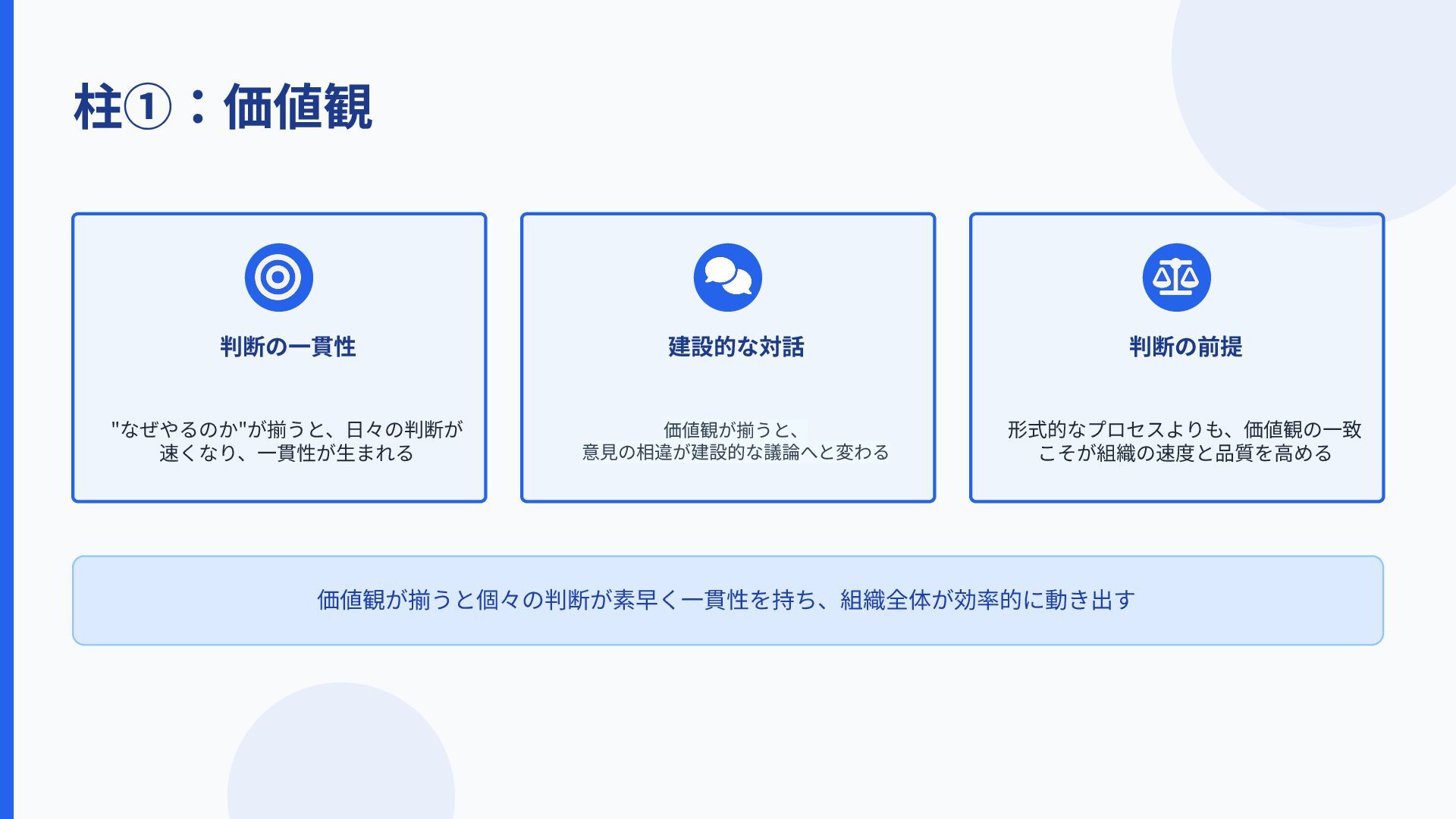 柱①:価値観 判断の⼀貫性 "なぜやるのか"が揃うと、⽇々の判断が 速くなり、⼀貫性が⽣まれる 建設的な対話 判断の前提 価値観が揃うと、 意⾒の相違が建設的な議論へと変わる 形式的なプロセスよりも、価値観の⼀致 こそが組織の速度と品質を⾼める