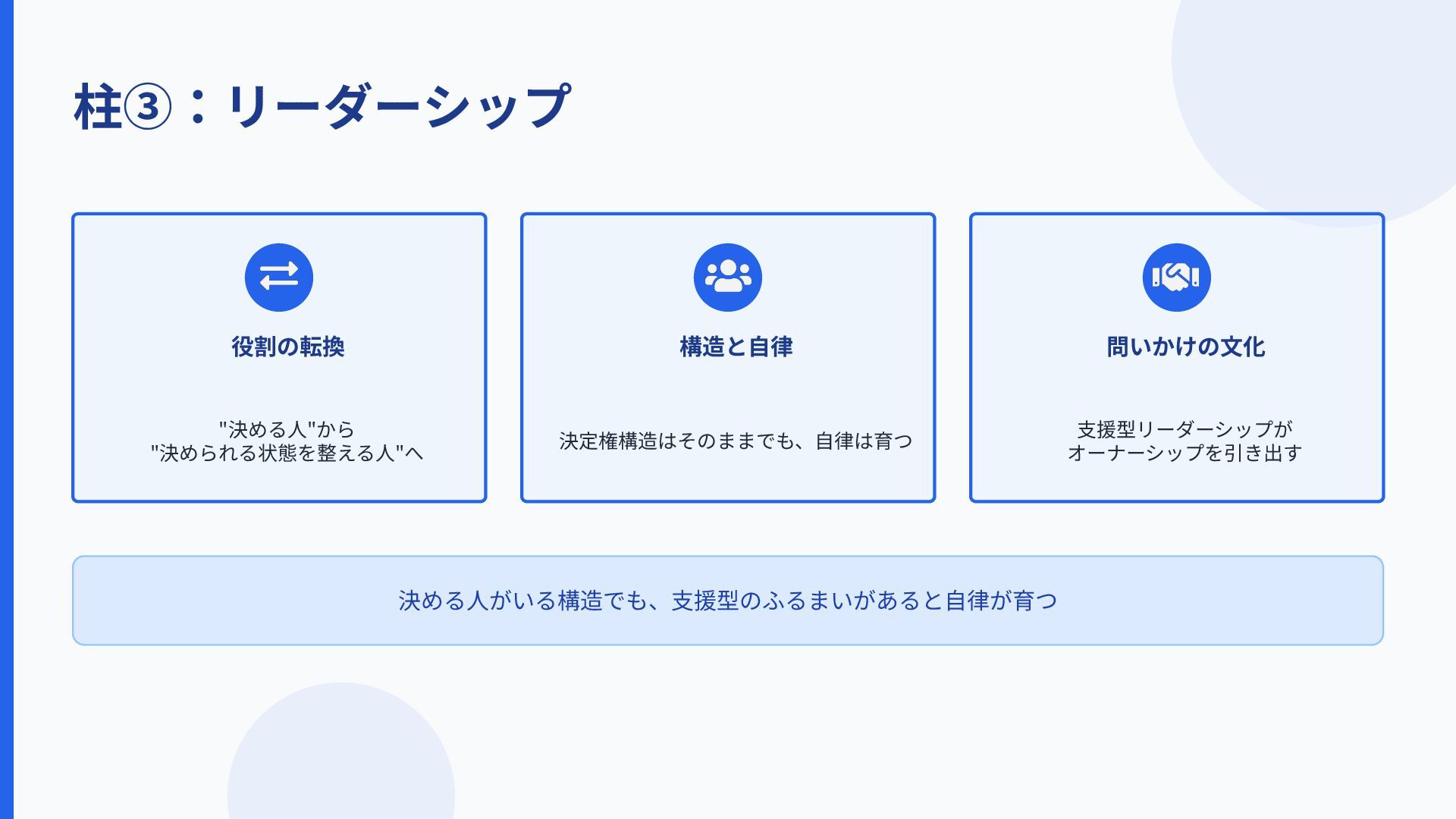 柱③:リーダーシップ 役割の転換 "決める⼈"から "決められる状態を整える⼈"へ 構造と⾃律 問いかけの⽂化 決定権構造はそのままでも、⾃律は育つ ⽀援型リーダーシップが オーナーシップを引き出す 決める⼈がいる構造でも、⽀援型のふるまいがあると⾃律が育つ