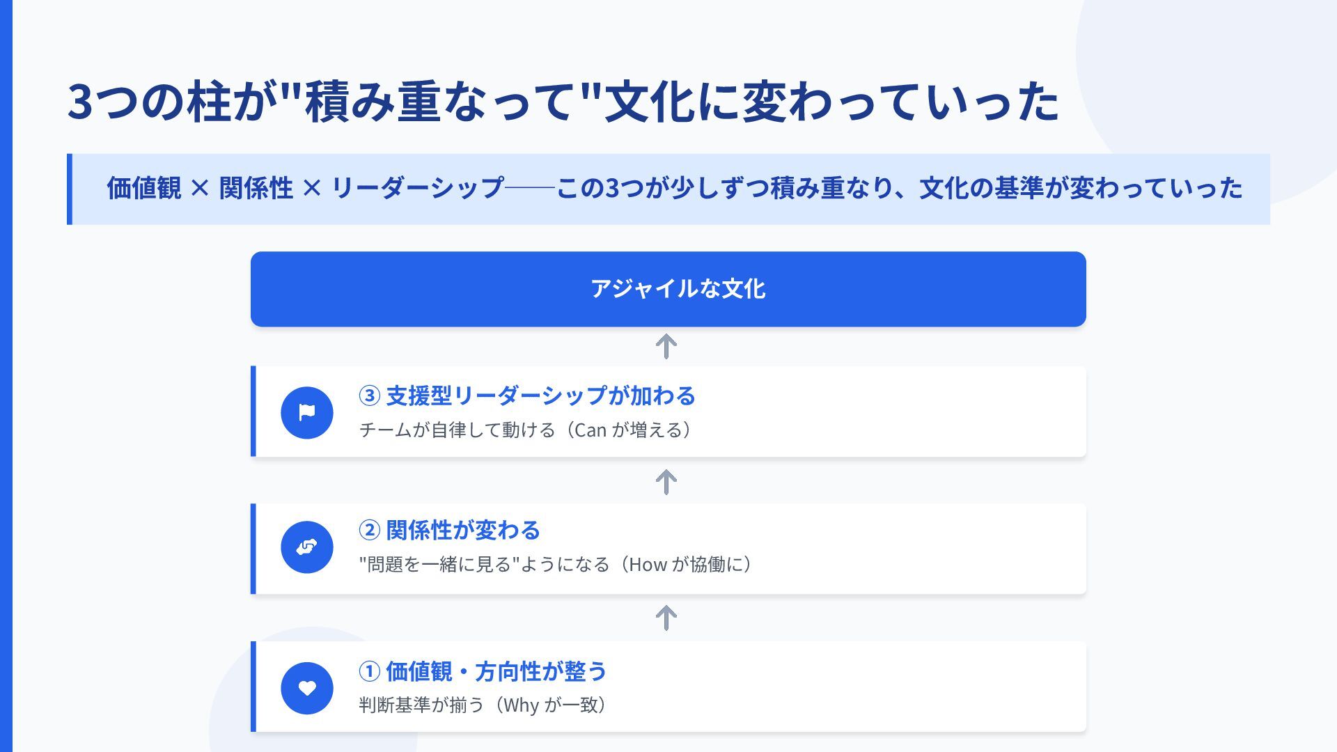 3つの柱が"積み重なって"⽂化に変わっていった 価値観 × 関係性 × リーダーシップ──この3つが少しずつ積み重なり、⽂化の基準が変わっていった アジャイルな⽂化 ③ ⽀援型リーダーシップが加わる チームが⾃律して動ける(Can
