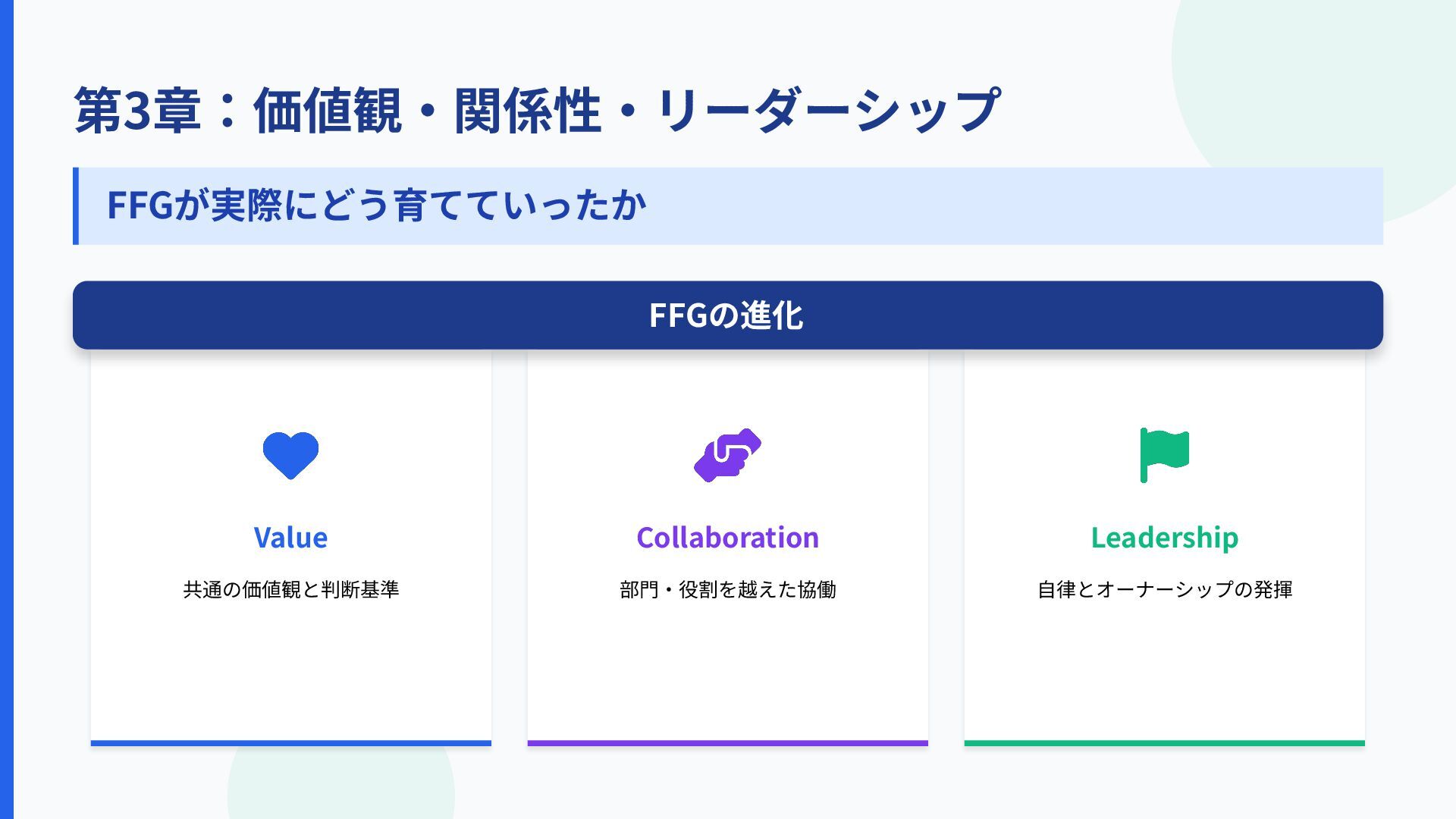 第3章:価値観‧関係性‧リーダーシップ 劇的な転換ではなく、⼩さな積み上げが組織を変えた Value 共通の価値観と判断基準 Collaboration 部⾨‧役割を越えた協働 Leadership ⾃律とオーナーシップの発揮 FFGの進化 FFGが実際にどう育てていったか